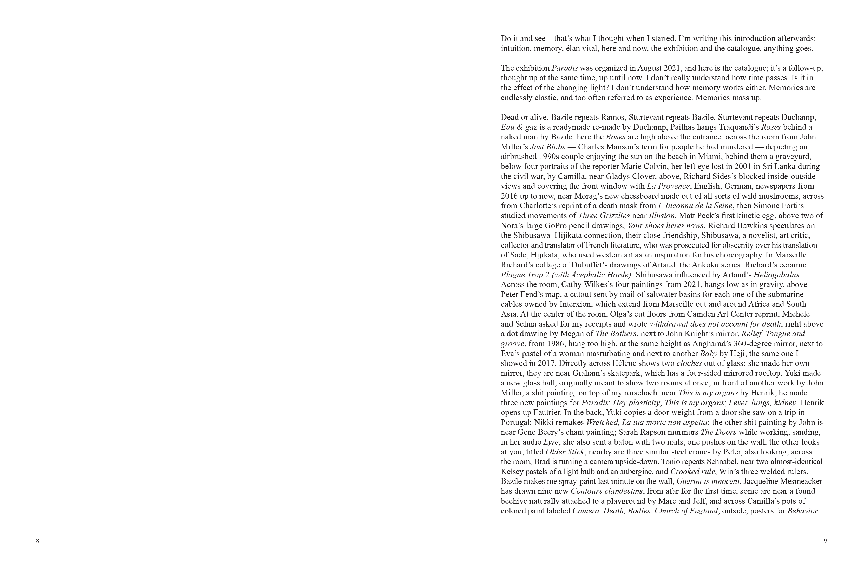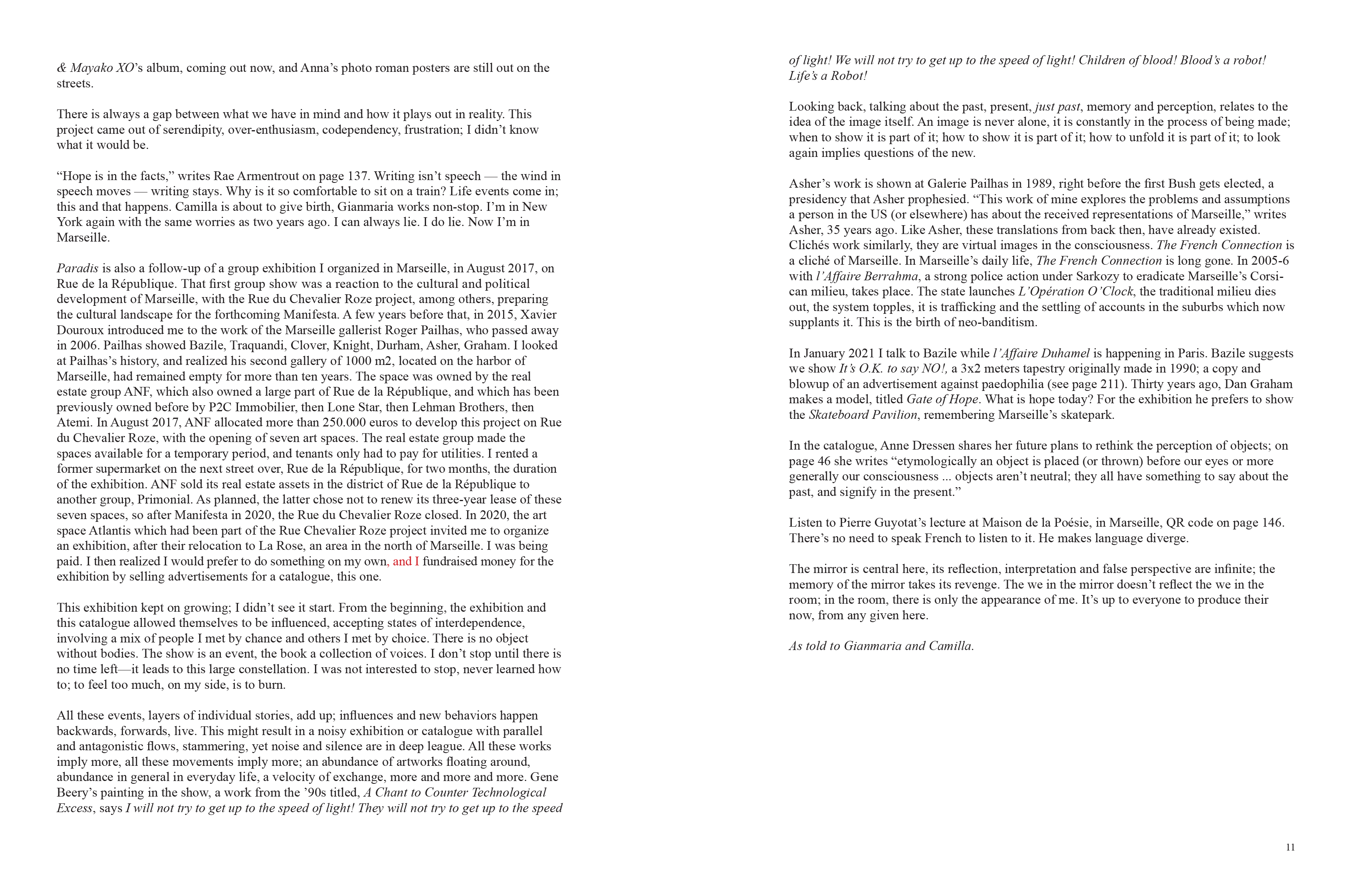 Paradis is a continuation of the eponymous exhibition conceived by artist Marie Angeletti in Marseilles in 2021. The exhibition brought together 56 artists of different origins and generations. More than just a transcription of this event, this catalogue brings together some one hundred contributions, combining critical texts, poetry, artists' writings and new translations, alongside an equally large number of visual contributions and ad hoc works, most of them previously unpublished.