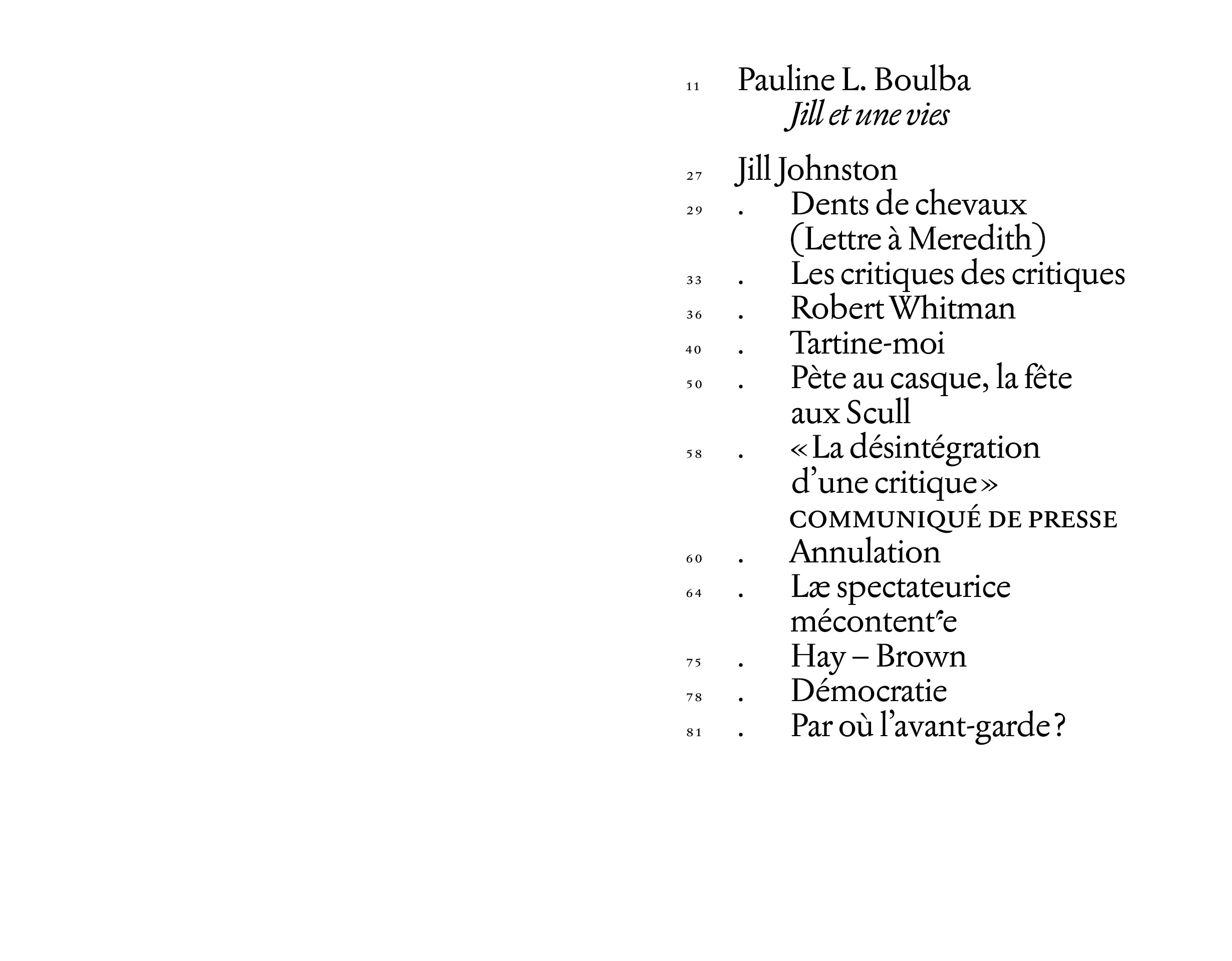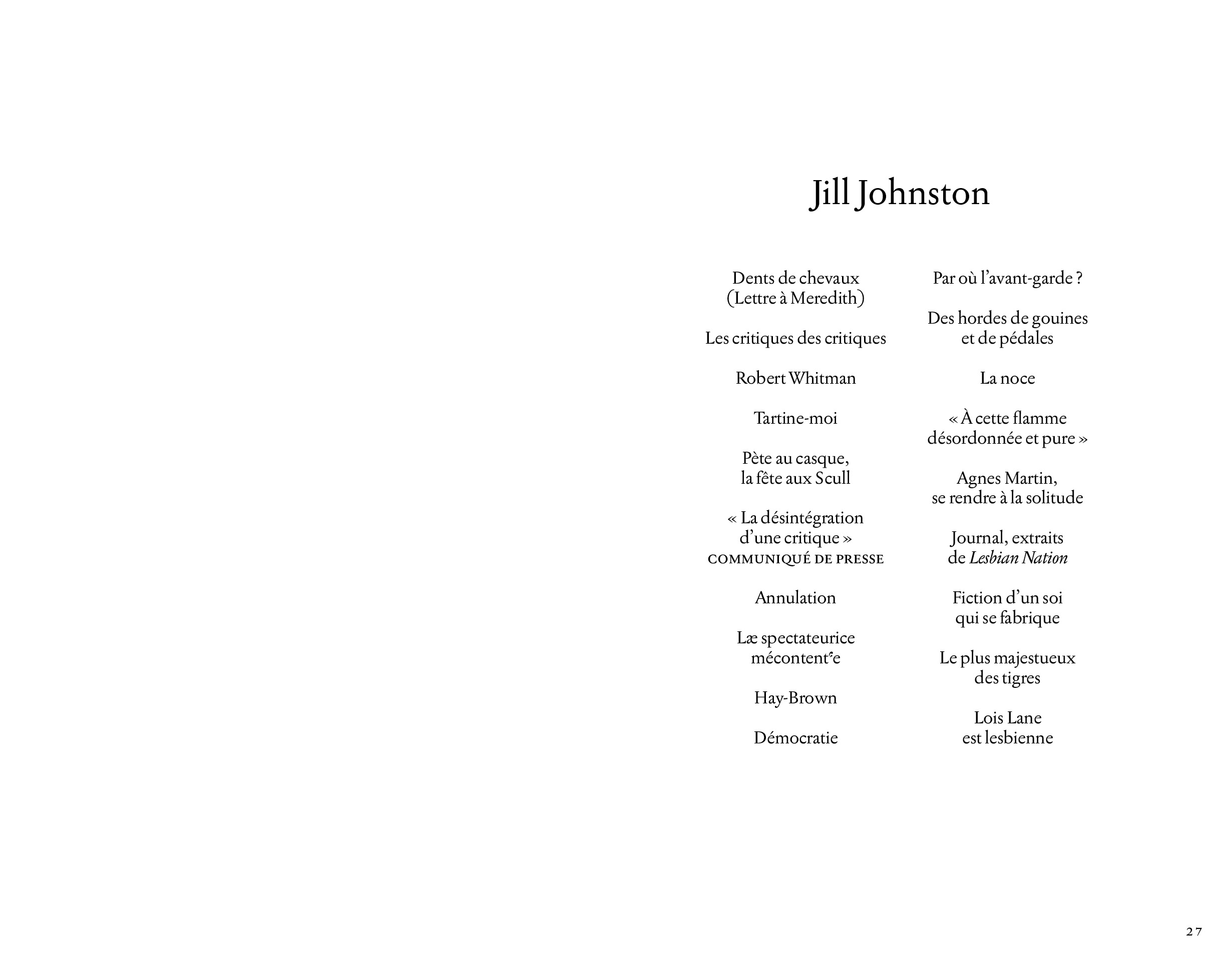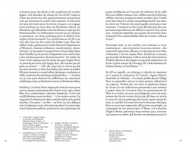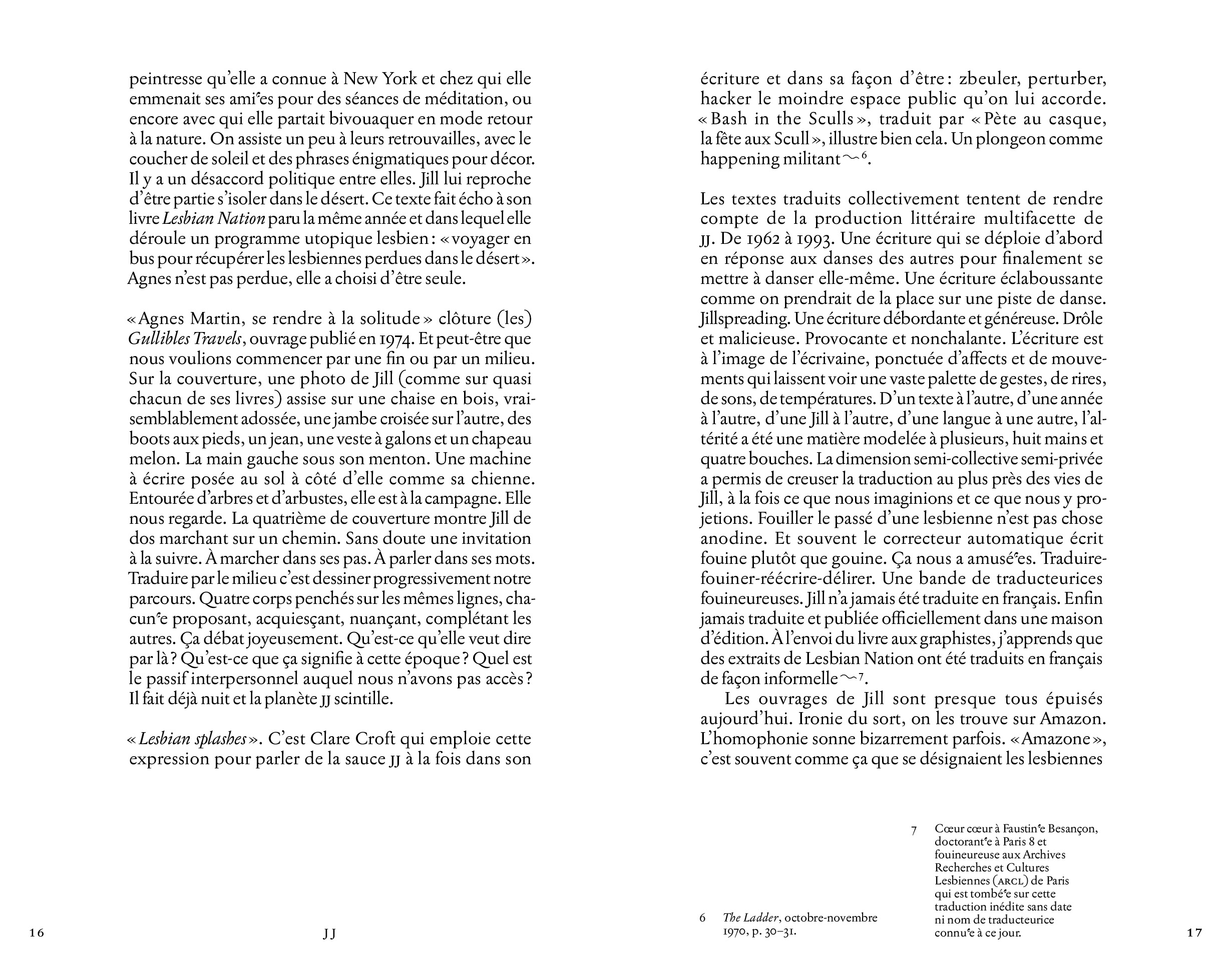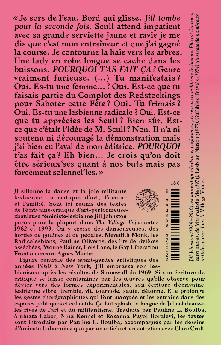 JJ brings together articles by cultural critic, auto/biographer, and lesbian icon Jill Johnston, translated into French for the first time, as well as texts, poems and drawings by Pauline L. Boulba, Aminata Labor, Nina Kennel and Rosanna Puyol.