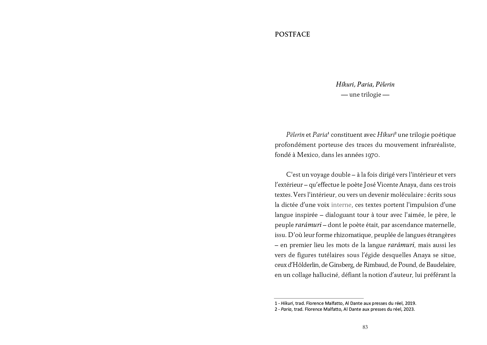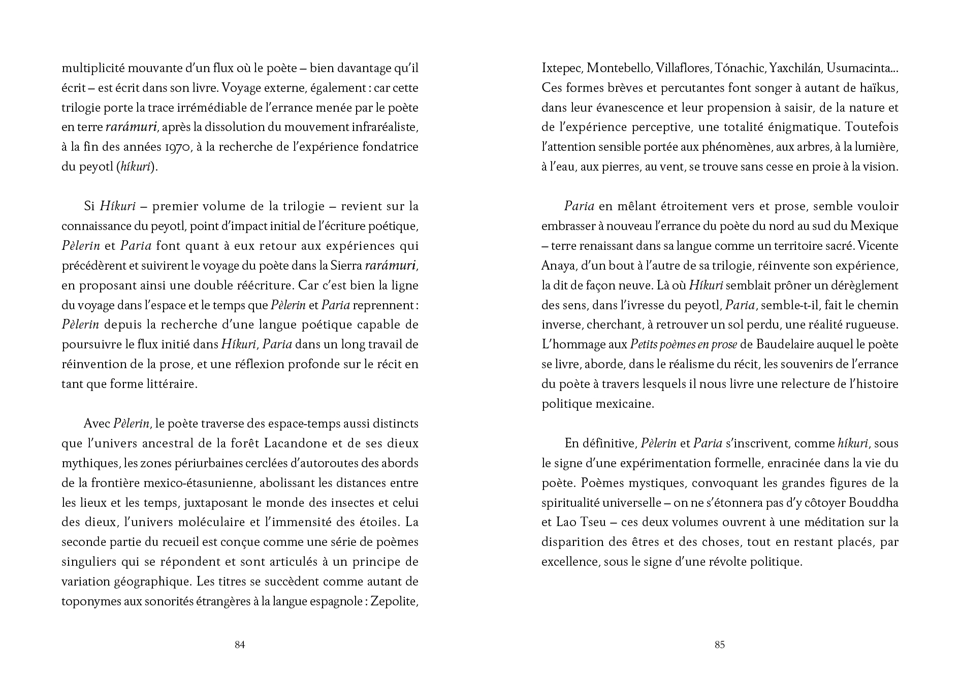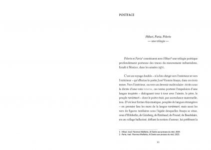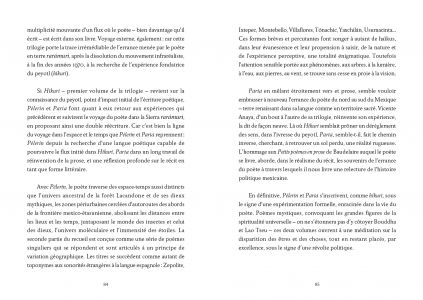 The second part of José Vicente Anaya's poetic trilogy (started with a href="ouvrage.php?id=6981">Híkuri and closed with Paria), deeply rooted in the infra-realist movement founded in Mexico City in the 1970s, combining verse and prose, is marked by a formal experimentation anchored in the poet's life and his wanderings from the north to the south of Mexico.