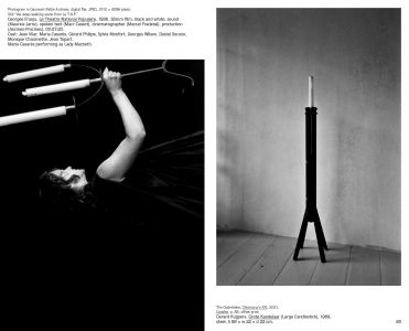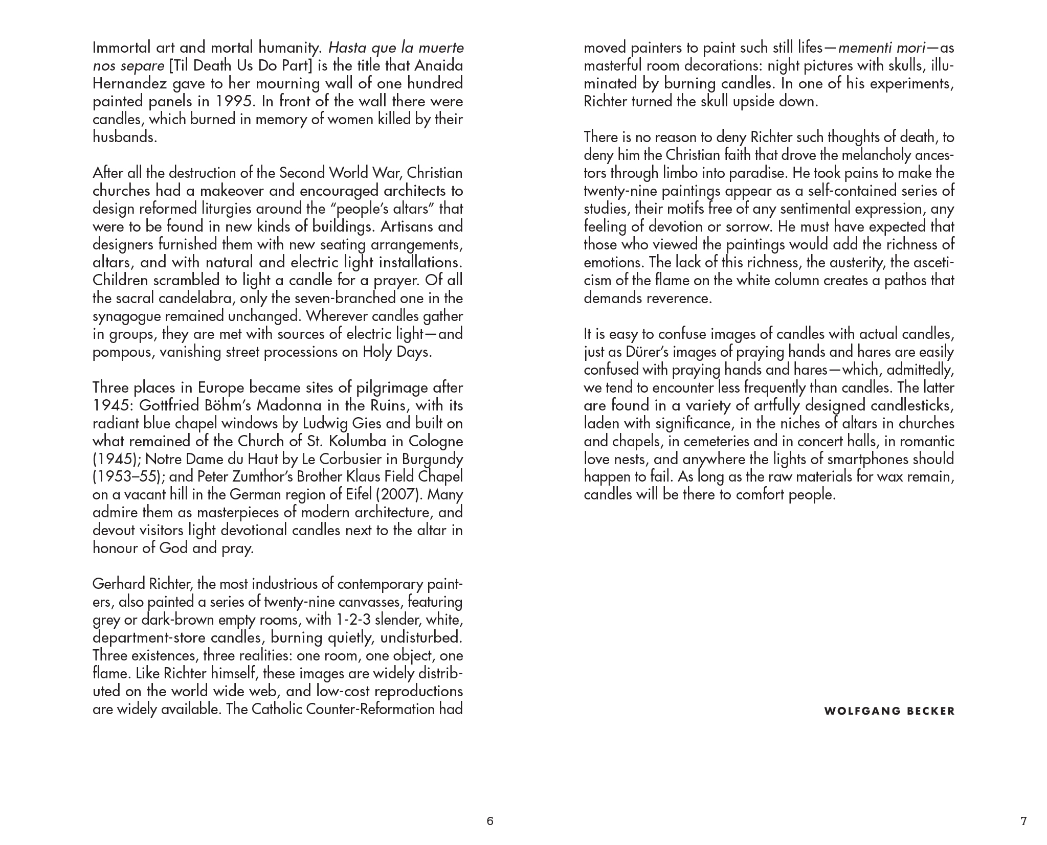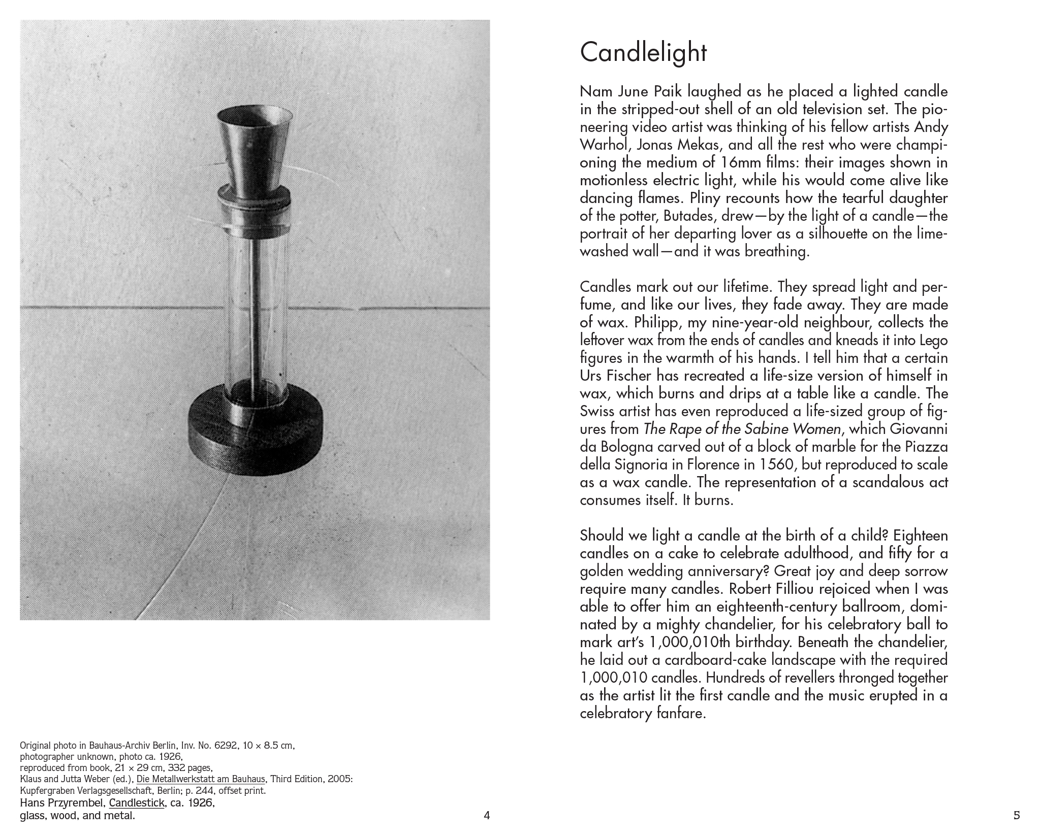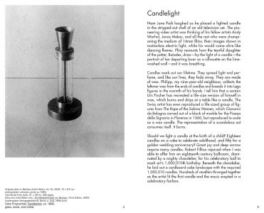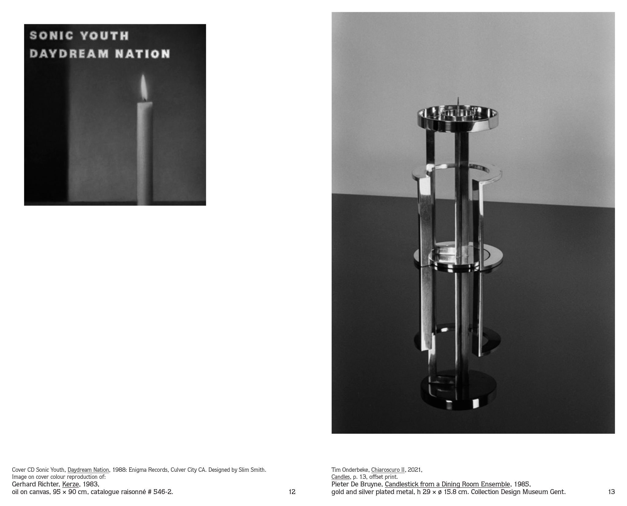 Candles is a photographic essay by Tim Onderbeke. Fascinated by the sacred, ritual, and cerebral act of lighting a candle, the artist began collecting images of candles and candlesticks in an artistic or art-historical context. In Candles, Onderbeke uses his own work and that of others to research what he calls "the colour of darkness," or negative space—a concept he borrowed from the Japanese writer and essayist Jun'ichirō Tanizaki. Tanizaki describes this intense experience he had in a large, dark room of a Japanese tea house where the light of a few candles made the surrounding darkness feel tangible, as if it turned into monolithic matter. Onderbeke sees a burning candle as an implosion of architectural space where the centre is usually kept empty. A burning candle in a dark room reverses that experience, and influences our perception of space, time and atmosphere.