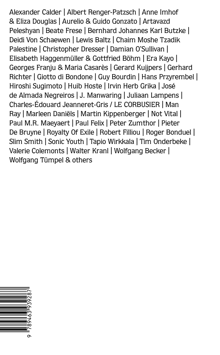Works by Alexander Calder, Albert Renger-Patzsch, Anne Imhof & Eliza Douglas, Aurelio & Guido Gonzato, Artavazd Peleshyan, Beate Frese, Bernhard Johannes, Karl Butzke, Deidi Von Schaewen, Lewis Baltz, Chaim Moshe, Tzadik Palestine, Christopher Dresser, Damian O'Sullivan, Elisabeth Haggenmüller & Gottfried Böhm, Era Kayo, Georges Franju & Maria Casarès, Gerard Kuijpers, Gerhard Richter, Giotto di Bondone, Guy Bourdin, Hans Przyrembel,Hiroshi Sugimoto, Huib Hoste, Irvin Herb Grika, José de Almada Negreiros, J. Manwaring, Juliaan Lampens, Charles-Édouard Jeanneret-Gris / Le Corbusier, Man Ray, Marleen Daniëls, Martin Kippenberger, Not Vital, Paul M.R. Maeyaert, Paul Felix, Peter Zumthor, Pieter De Bruyne, Royalty Of Exile, Robert Filliou, Roger Bonduel, Slim Smith, Sonic Youth, Tapio Wirkkala, Tim Onderbeke, Valerie Colemonts, Walter Kranl, Wolfgang Becker, Wolfgang Tümpel...