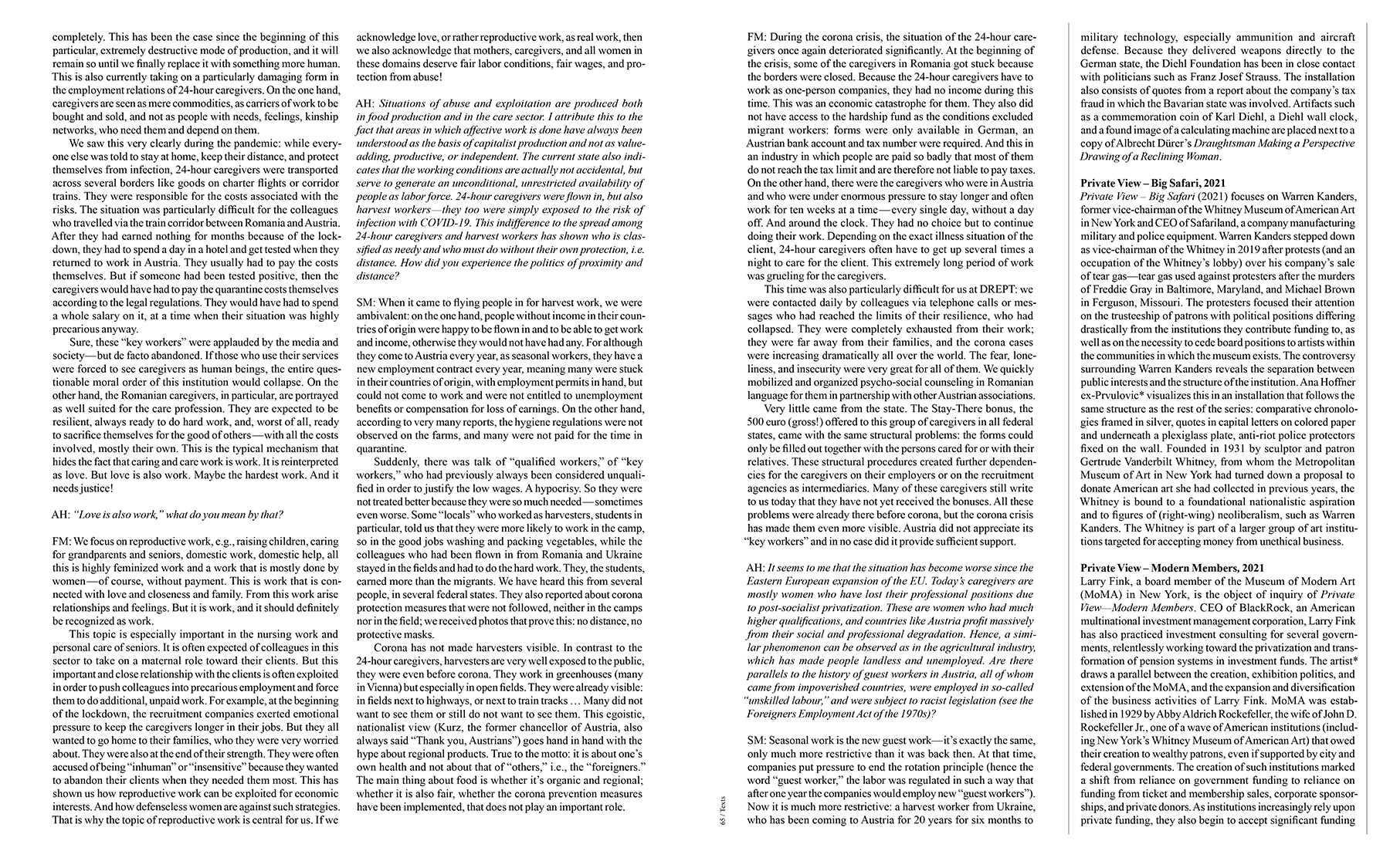 The series Private View tackles investment in art institutions from the weapons industry, hedgefund companies, and investors of Nazi heritage, thus, in a self-reflexive movement, questioning the capacity of the art field itself to welcome, support, and stand for minoritarian alternatives and non-aligned thought. In Active Intolerance, Ana Hoffner ex-Prvulovic's research tackles diverse forms of exploitation of labor in enclosed environments, namely the factory and the prison. The artist once again investigates the liberal and capitalist political project and its relentless construction of, on the one hand, working, consuming, complying, and reproducing bodies and, on the other, of those, who are to be exploited.