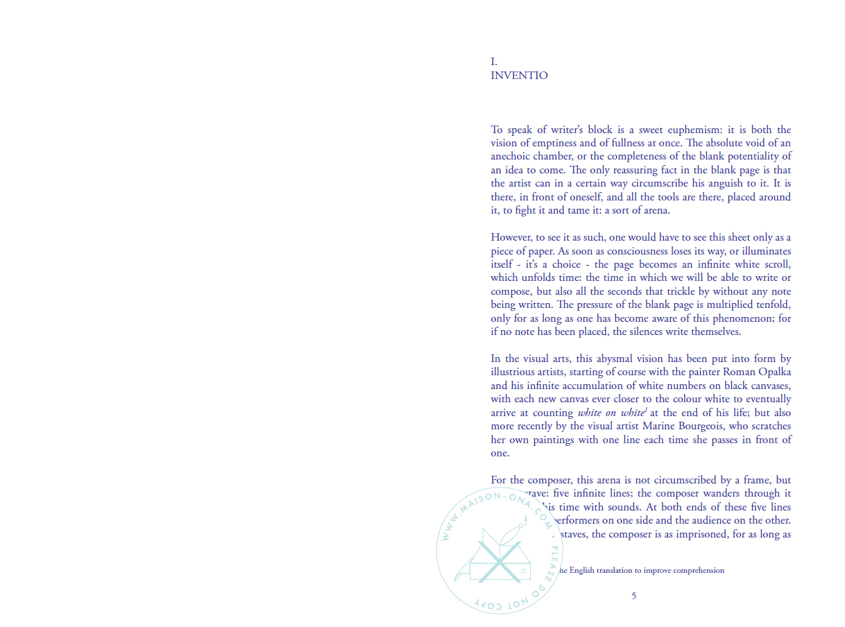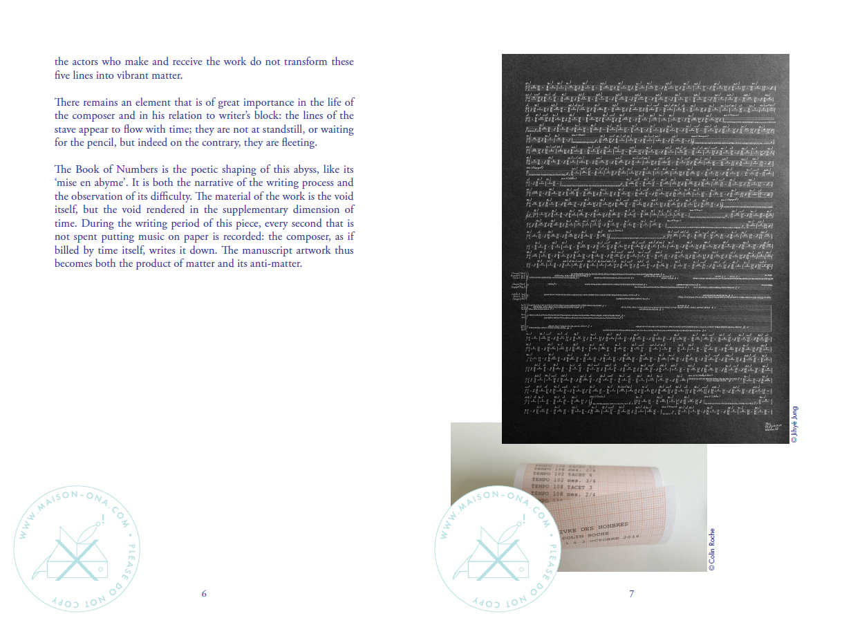 The book of numbers is the trace of a performance. Writing a "register" of the solitary world of creators disrupts our relation to time as much as it does the way of recording, listing and of listening to it. The heart — in the physical sense — is invoked here. It is the articulation of an "imaginary".