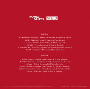 Extra Muros – Switzerland is a 12-track vinyl compilation composed in the framework of the 2022 Extra Muros music residency, which took place within the Museum of Ethnography of Geneva. Within the centre for creation and archiving of the Geneva-based museum, the musicians were able to discover one of Europe's largest sonic archives dedicated to field recordings and regrouping over 120.000 entries and had a rare occasion to experiment on traditional instruments as well as contribute to the creation of a new unique sonic database.