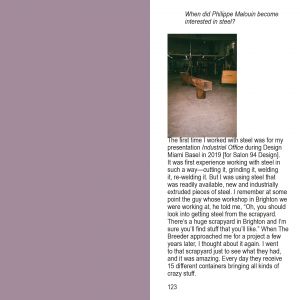 On the occasion of his solo show at The Breeder (Athens, 2021), while spending time in scrapyards from the UK to Greece, Philippe Malouin got particularly interested in salvaged steel. Borrowing the Dadaist technique of "cutting out," the materials were cut out and reassembled according to a surprising formal language. 35 objects—seats, tables, coffee tables, lamps, etc.—came to life to achieve new forms without using anything new. The publication discloses Malouin's "design by making" approach, documenting his creative process from the early experimentation to the final shape.