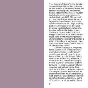 British-Canadian Philippe Malouin holds a bachelor's degree in Design from the Design Academy Eindhoven. He has also studied at the École Nationale Supérieure de Création Industrielle in Paris and University of Montreal. He set up his studio in 2008 after working for English designer Tom Dixon. He has also taught at the Royal College of Art in London between 2012-2015.