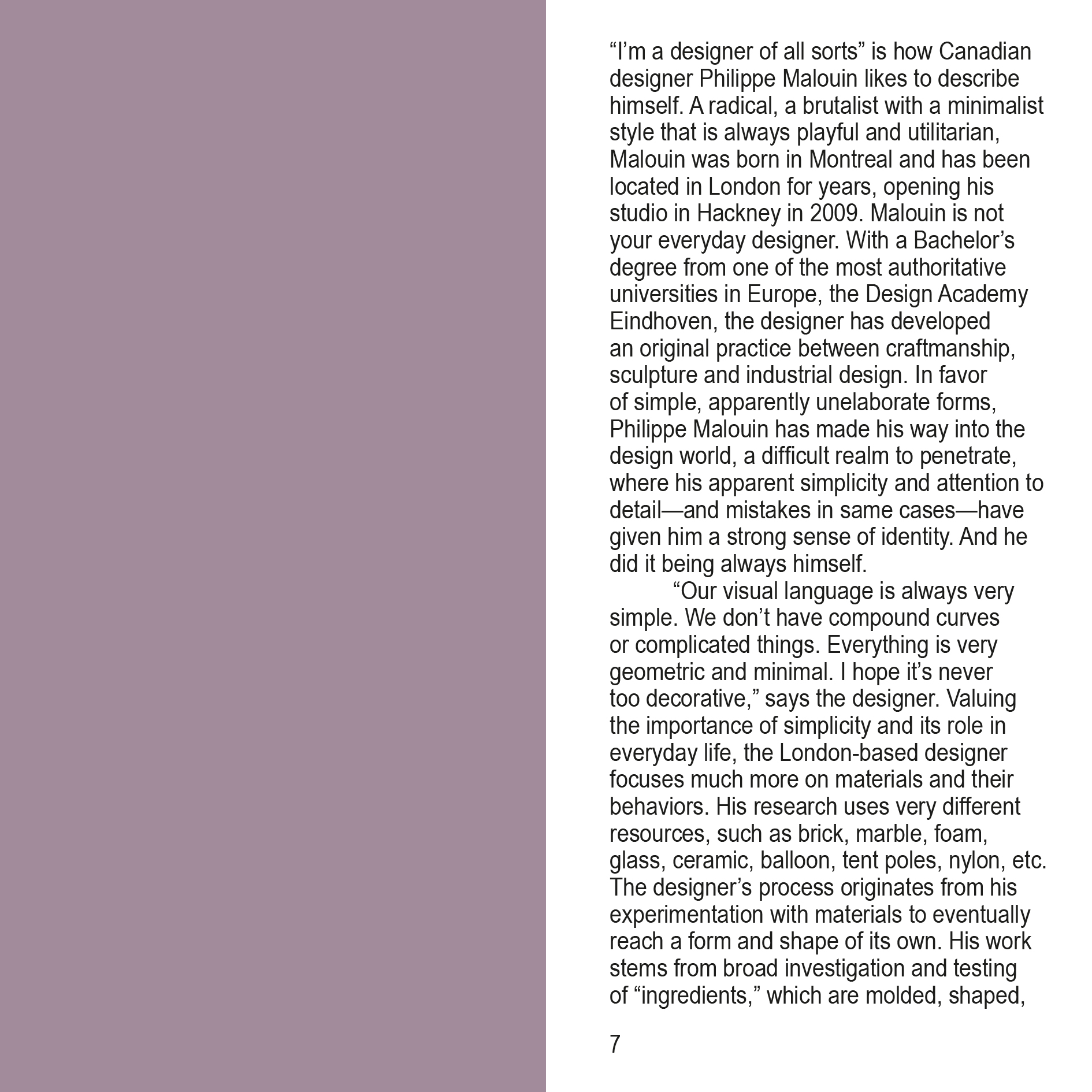 A radical, a brutalist with a minimalist style that is always playful and utilitarian, Philippe Malouin has developed an original practice between craftsmanship, sculpture and industrial design. The designer's process originates from his experimentation with materials to eventually reach a form and shape of its own. His work stems from broad investigation and testing of "ingredients," which are molded, shaped, and handcrafted, and almost by chance, they become visually compelling objects and products for everyday use.