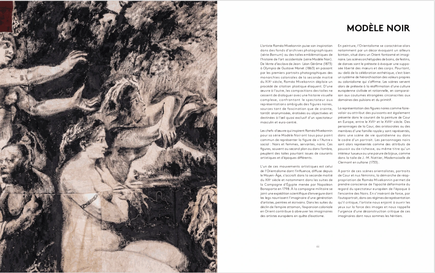 It consists of a text by critic and art history professor Nadeije Laneyrie-Dagen, as well as introductory texts to the two major series of the artist, "Black Model" and "Barnum" and to his installation The Souls of Black Folk. The catalog also contains exhibition views and reproductions of works and details.