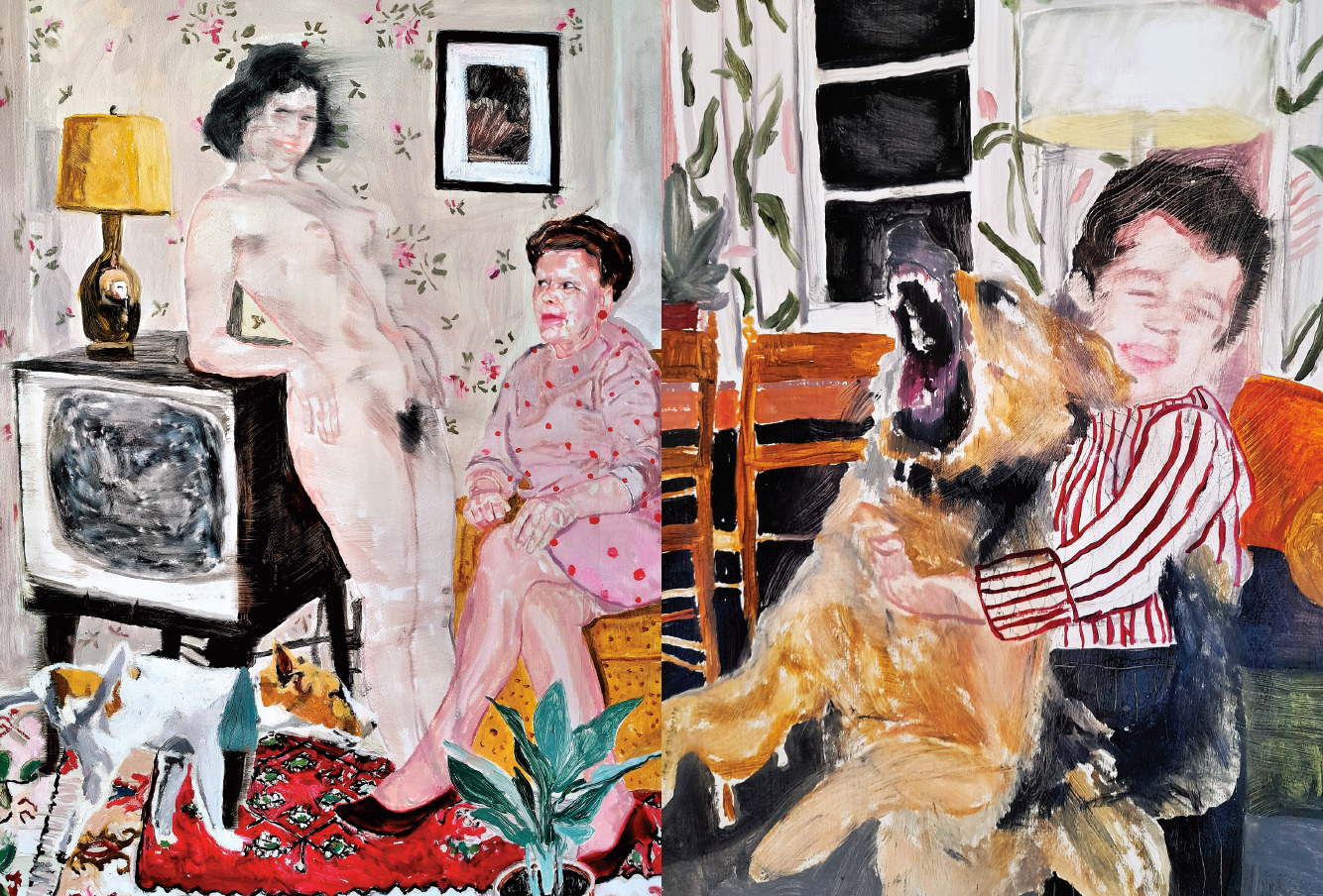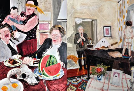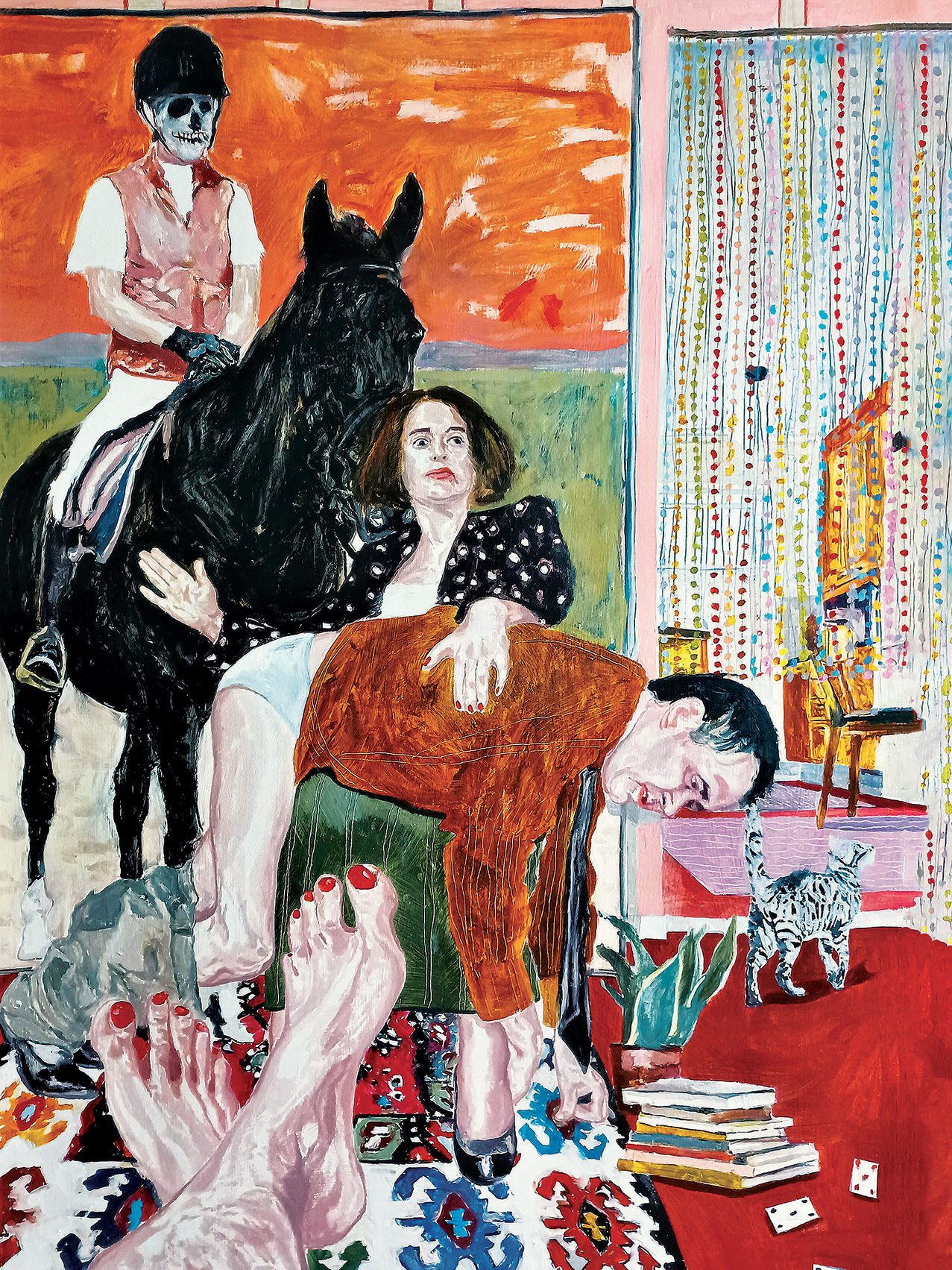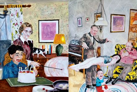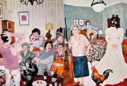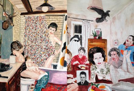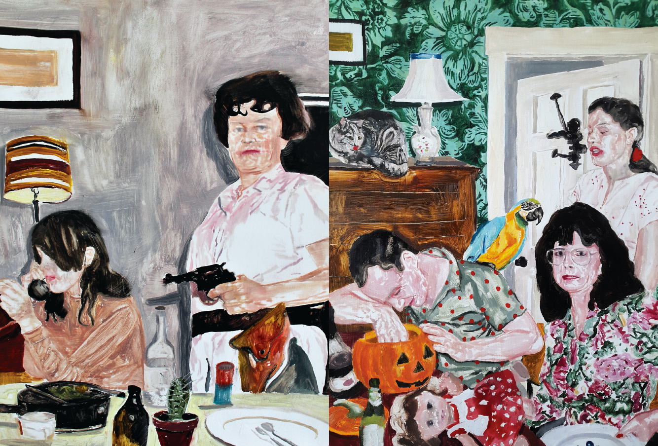 First monograph of the Finnish painter: a series of troubling family scenes whose deviance shines through under a veneer of normality, grotesque stacks of characters, objects and animals in decors with tapestries and furniture from another age, twisted and disturbing images that appear like reminiscences of a childhood marked by drama and war, never far from the living room.