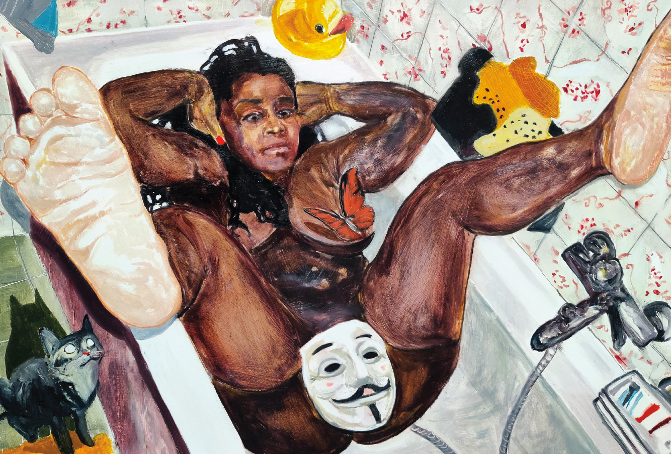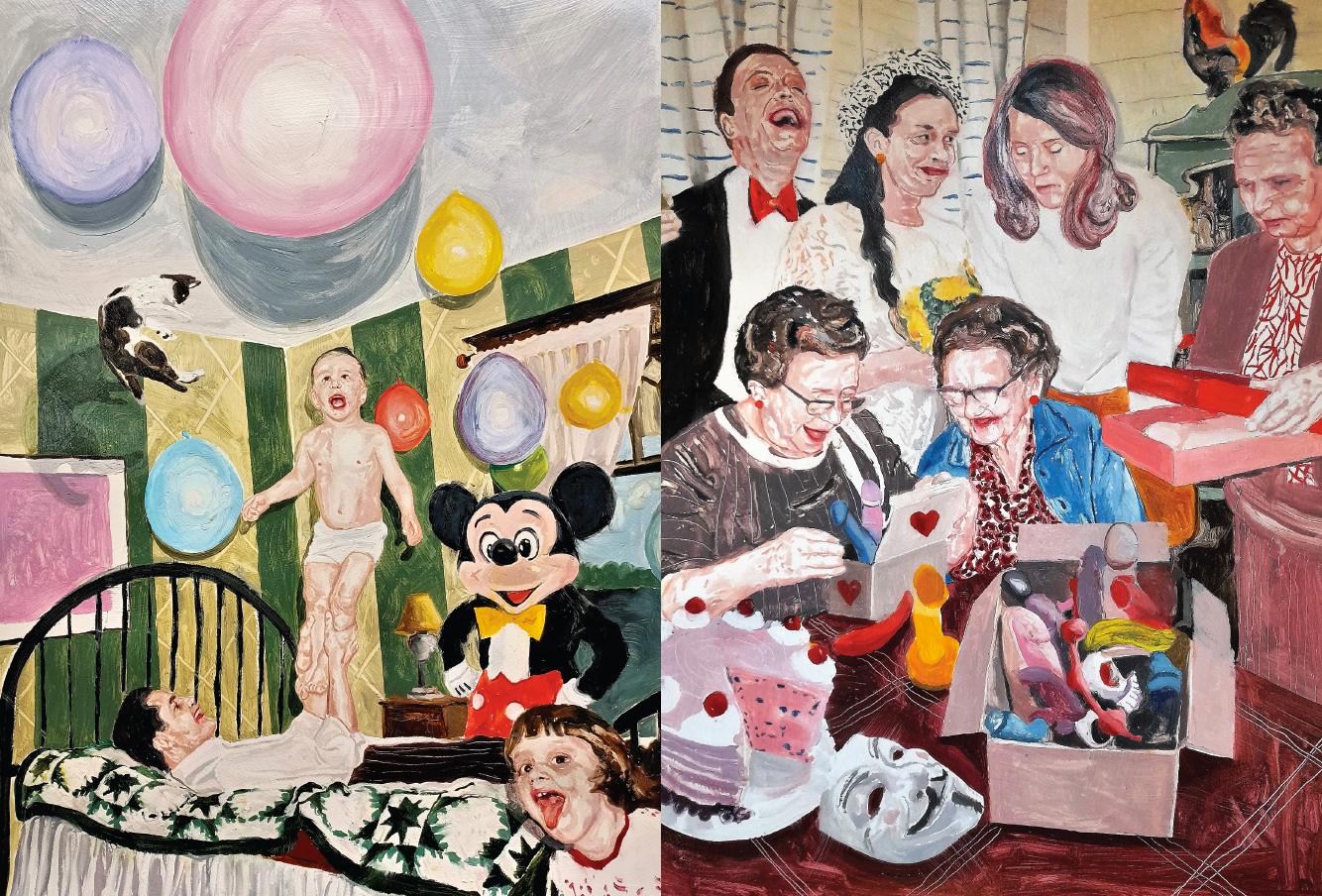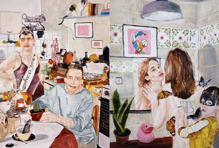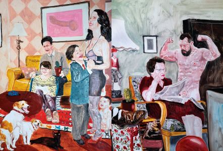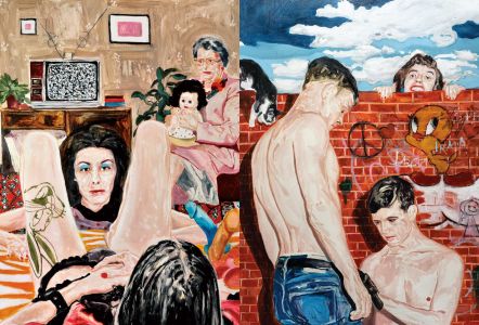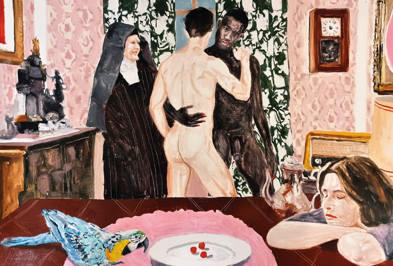 First monograph of the Finnish painter: a series of troubling family scenes whose deviance shines through under a veneer of normality, grotesque stacks of characters, objects and animals in decors with tapestries and furniture from another age, twisted and disturbing images that appear like reminiscences of a childhood marked by drama and war, never far from the living room.