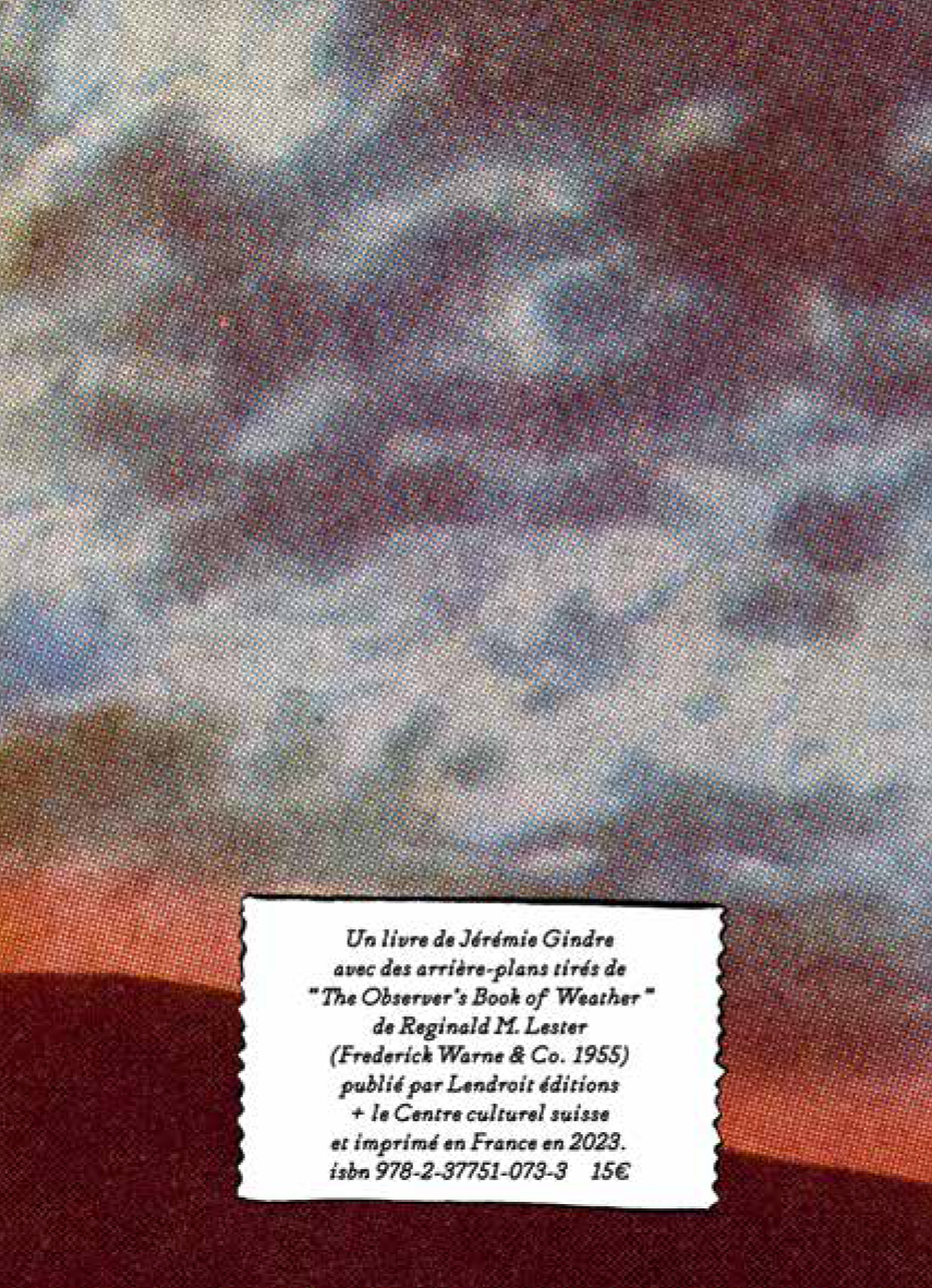 An artist's book by Jérémie Gindre with backgrounds taken from The Observer's Book of Weather by Reginald M. Lester (1955): a picture book of meteorological oracles, a wink as much to cinema and comics as to the natural history museum.