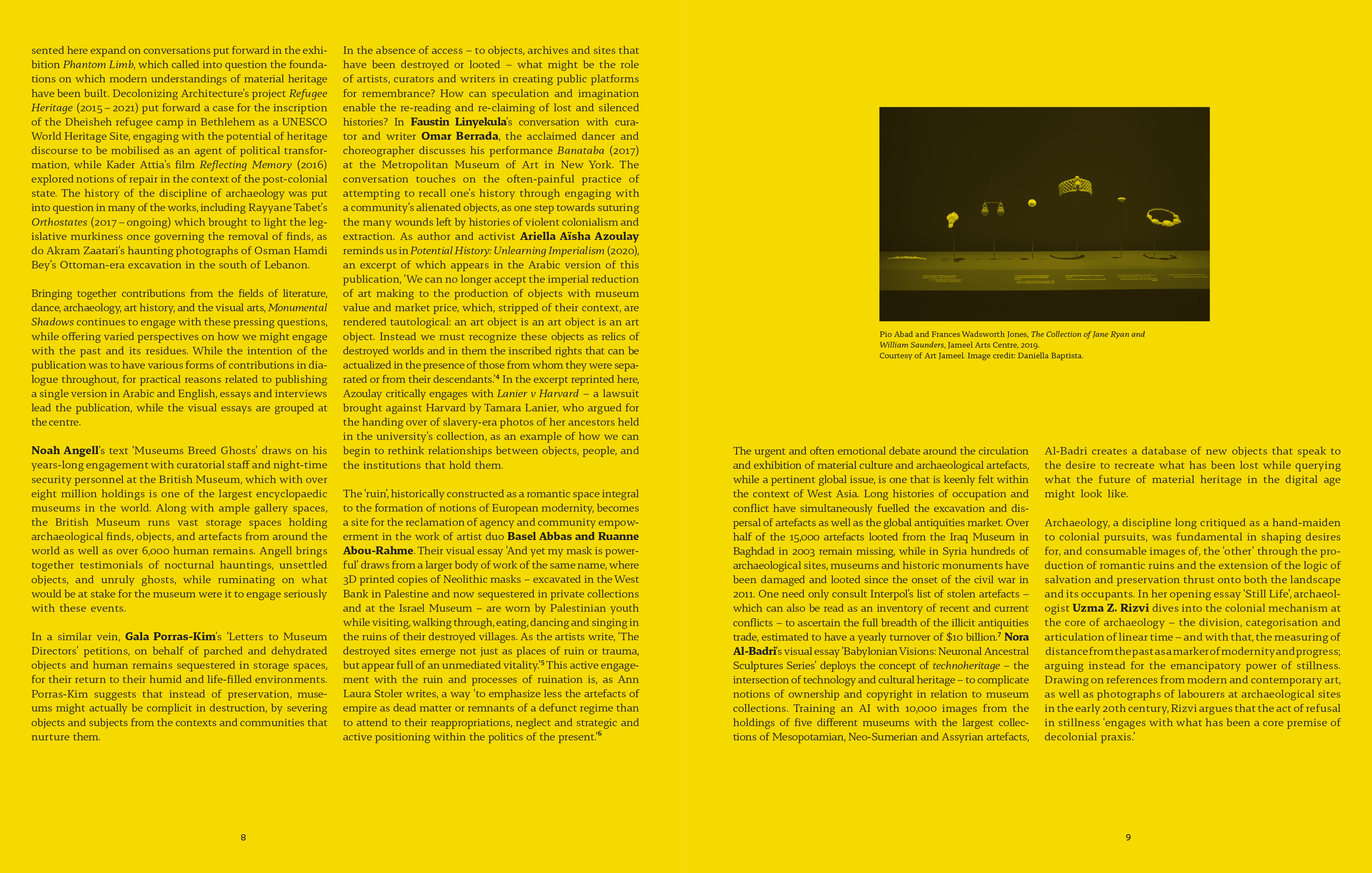 The publication includes commissioned essays, interviews, and visual contributions from artists and writers currently exploring the terrain of material heritage, colonial heritage, reparation and museology. It gives room to speculation and imagination in dealing with these histories. The publication stems from and expands on conversations that took place through the group exhibition 'Phantom Limb' at Jameel Arts Centre, Dubai, 2019.