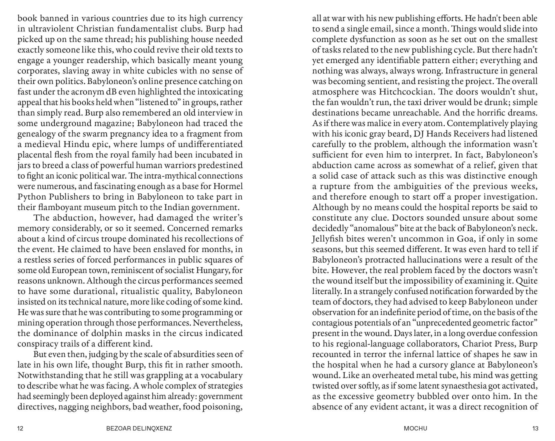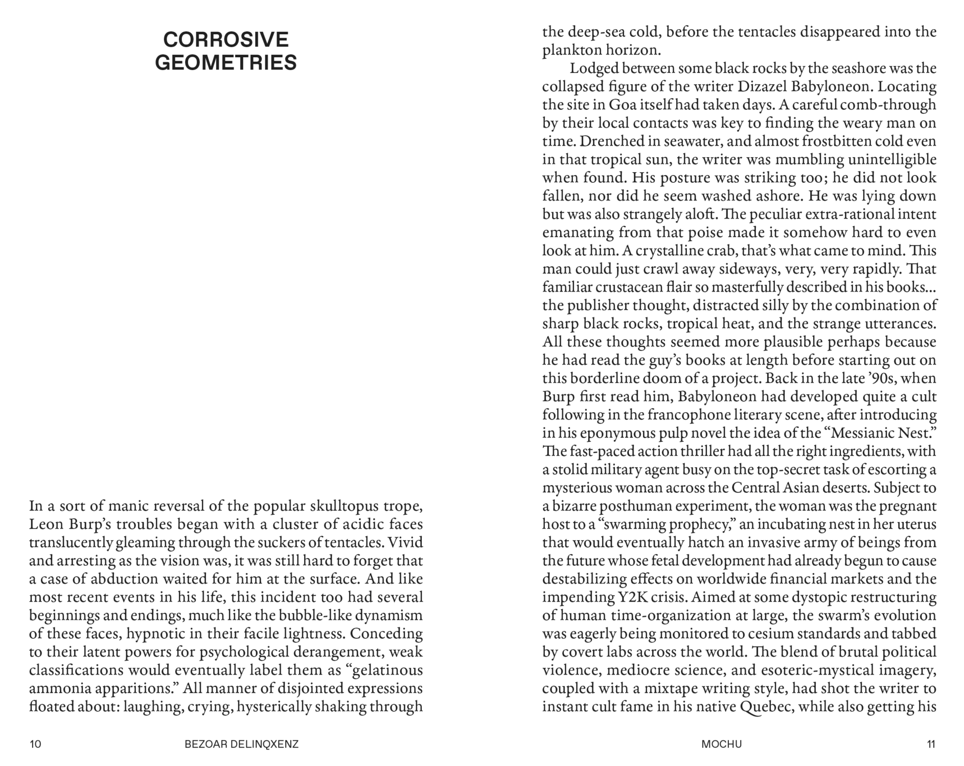 Reactionary behavior on the internet, having spawned numerous retroactive origin stories for itself, takes on a tentacular presence across diverse political spectrums, time periods, and cultural contexts, giving the impression of a vast and tangled entity with distributed intelligence. Fatally fused by a common hatred for the legacies of the Enlightenment, popular manifestations go by terms like "alt-right" and "neo-reaction," powered by nerdy forums and blog posts across the web. Stationing conspiracy theory itself as the central form of thinking, acting, and concept-making in the twenty-first century, Bezoar Delinqxenz is a mixtape simulation of these entanglements at the borderlands of fiction, insanity, and political emancipation.