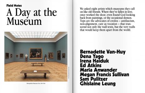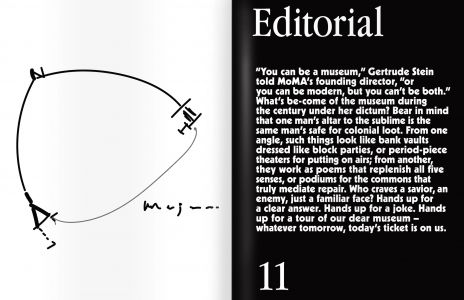 This issue is a guestbook to be leafed through at half-light, to be reminded among all the petitions to should of what the museum already is: a trove of our symbols and the histories they shift for; a stubborn beauty mark amid everything's turning smoother; an agora and a target and a legacy of timeless becoming. If it is a half-light of dawn, let it be a new chapter; and if dusk, then a eulogy of many voices.