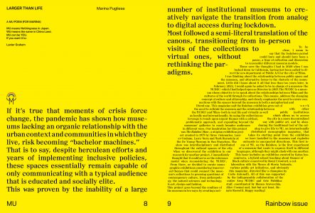 While providing extensive information about the exhibition to which it is linked, it is not a catalogue. It is a pure magazine, a third object, arising from the generative process of ideas (visuals first and foremost) coming out of the Museum and opening it to the world.