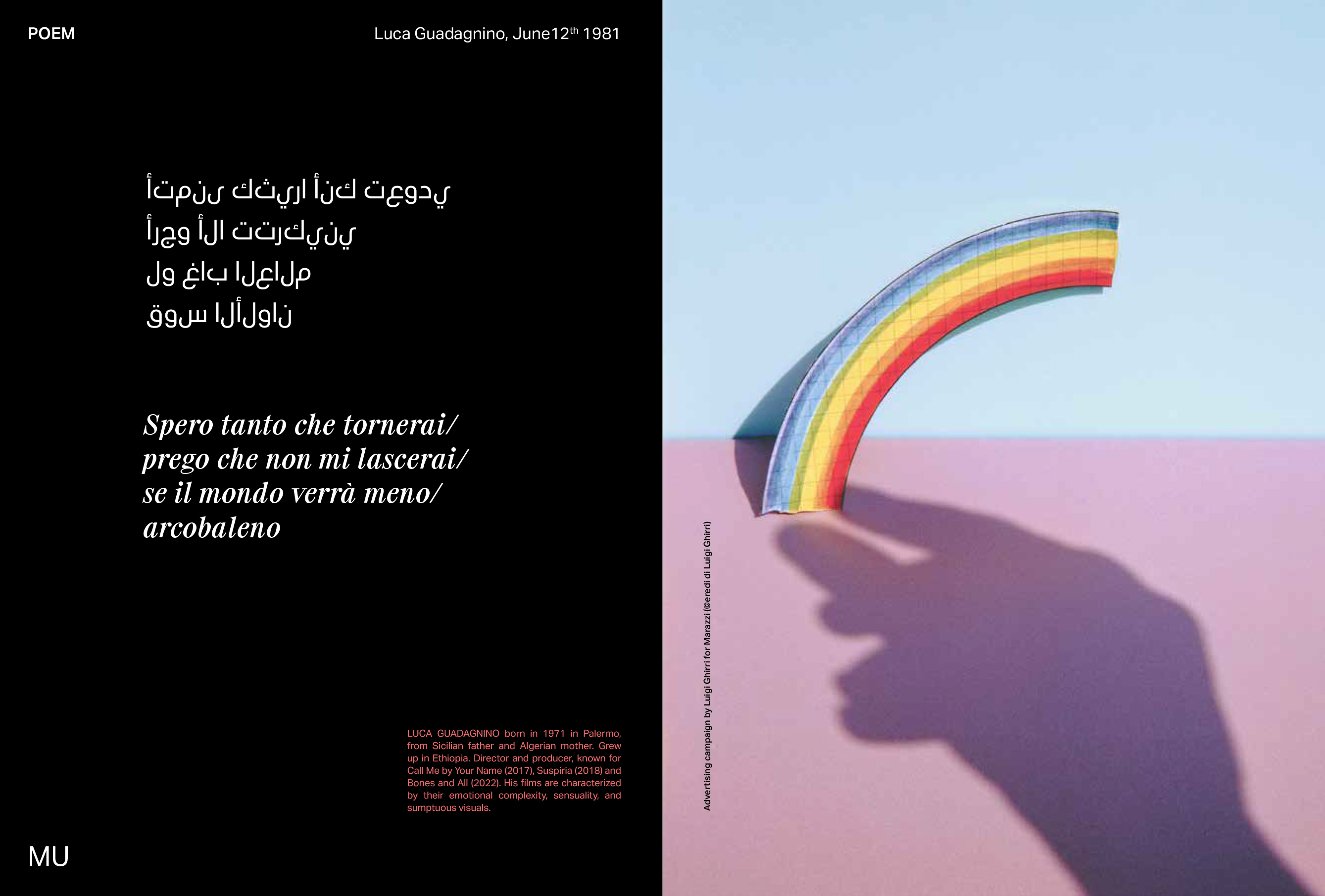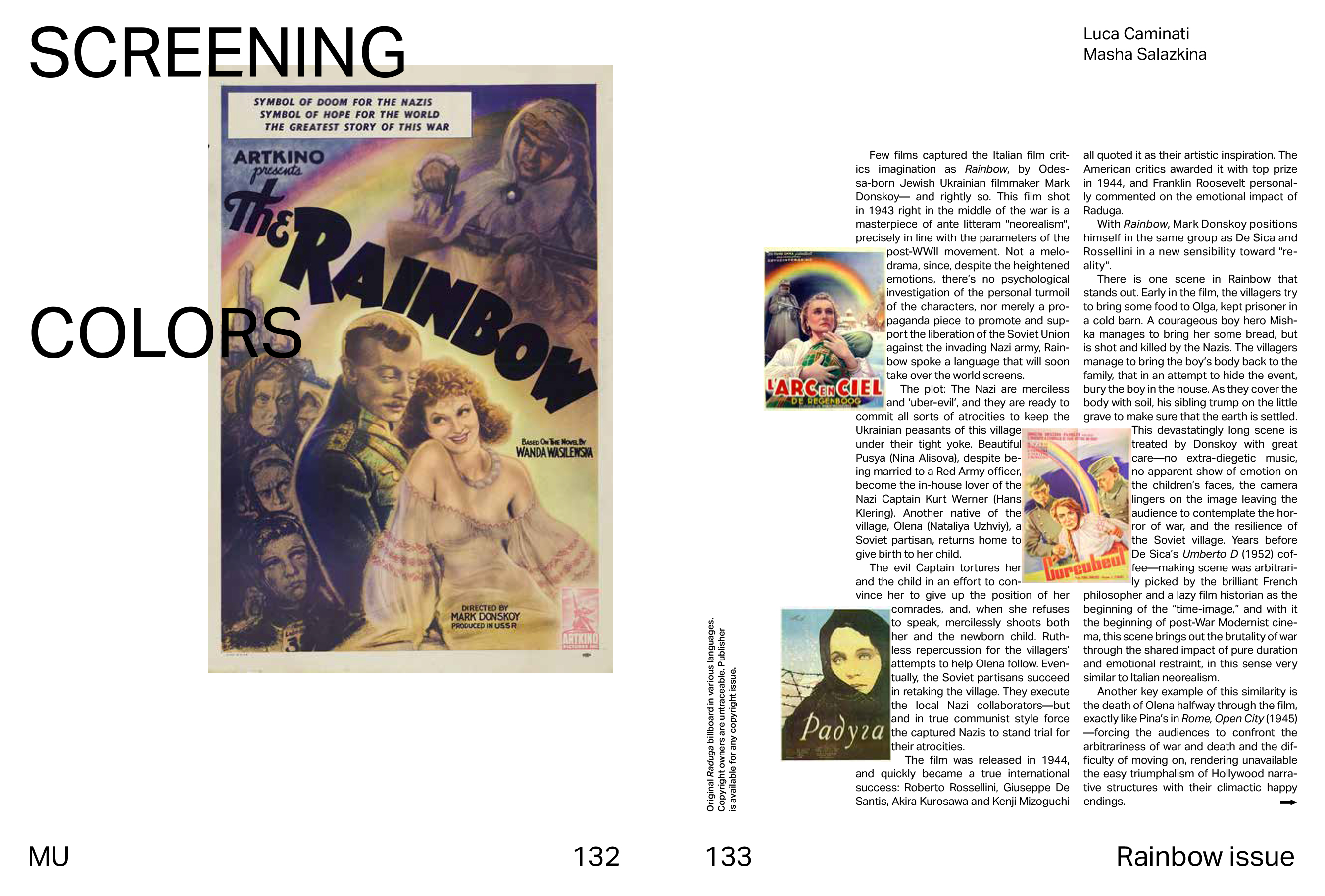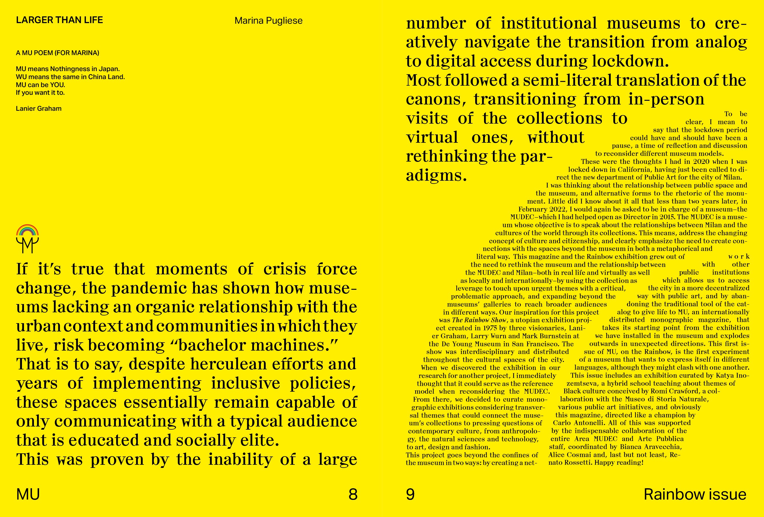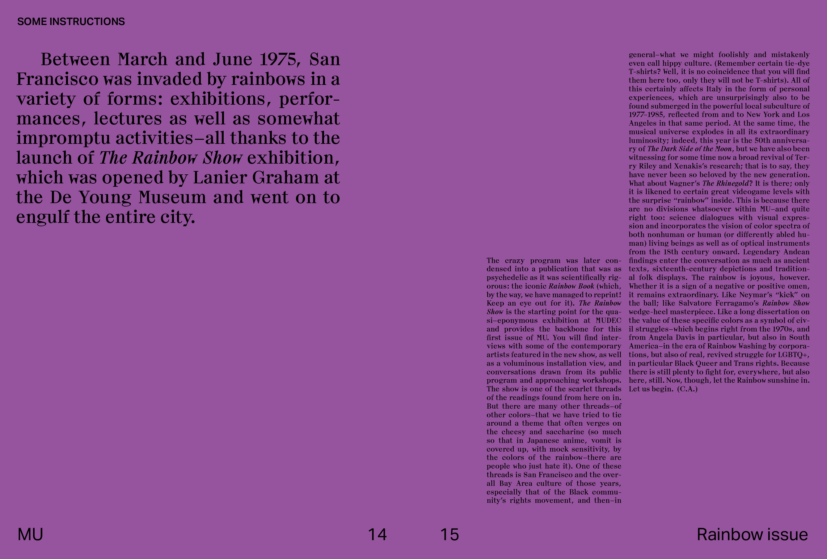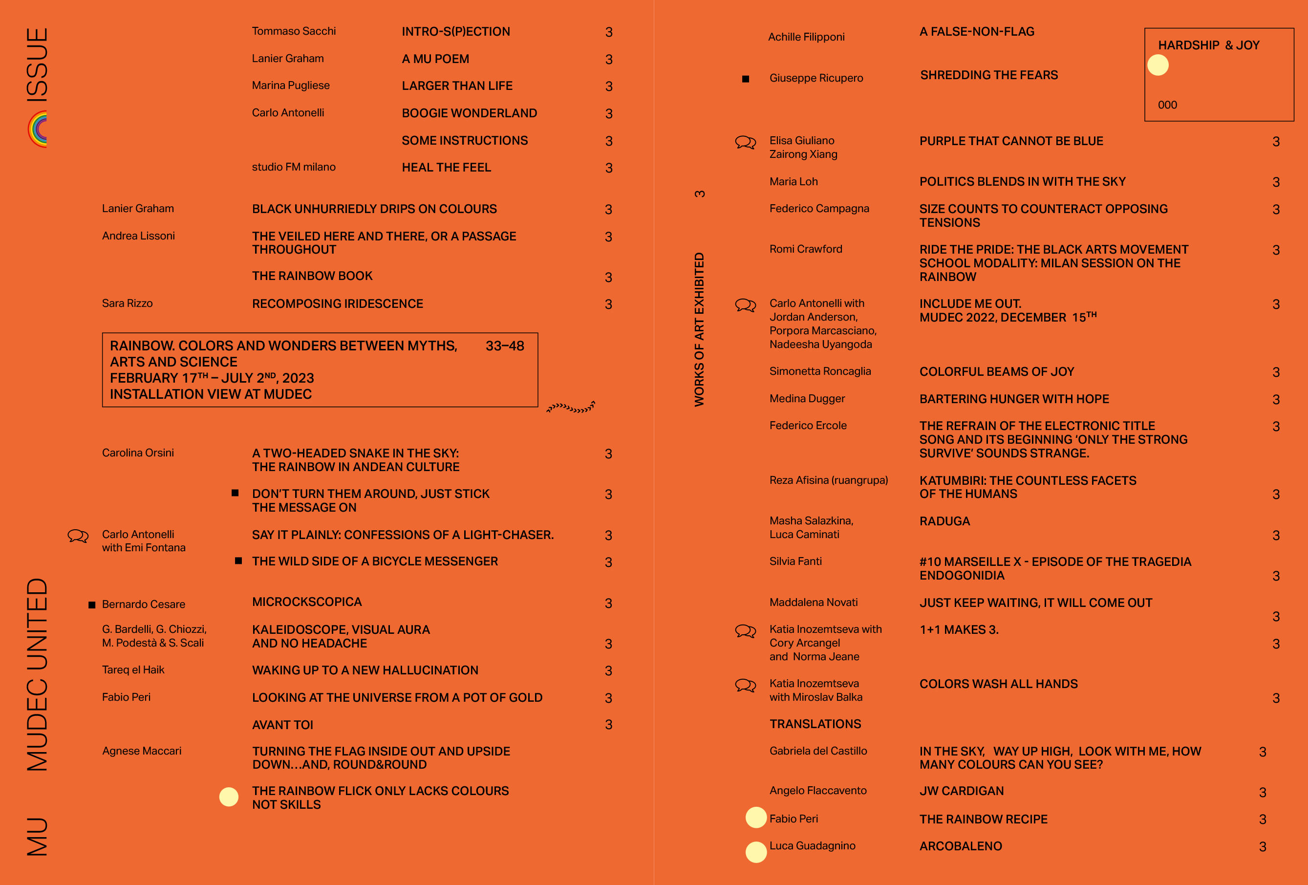 Each issue of MUdec United addresses a different theme, starting with the Museum's exhibitions. Rainbow, the first issue, is linked to the exhibition of the same name, opening Feb. 16, 2023 at MUDEC. It includes contributions from artists, writers, and researchers—among others: Carlo Antonelli, Marina Pugliese, Lanier Graham, Carolina Orsini, Katia Inozemtseva, Tarek Elhaik, Giorgio Bardelli, Giorgio Chiozzi, Michela Podestà & Stefano Scali, Agnese Maccari, Maria Loh, Federico Campagna, Romi Crawford, ruangrupa, Elisa Giuliano + Zairong Xiang, Masha Salazkina, Luca Caminati, Medina Dugger, Federico Ercole, Maddalena Novati, Gabriela Del Castillo, Cesare Bernardo, Flavio Favelli, Franco Summa, Miltos Manetas, Michael Roman, Nawal El Saadawi, Terry Riley, Cory Arcangel, Norma Jeane, Emi Fontana, Porpora Marcasciano, Jordan Anderson, Nadeesha Uyangoda.