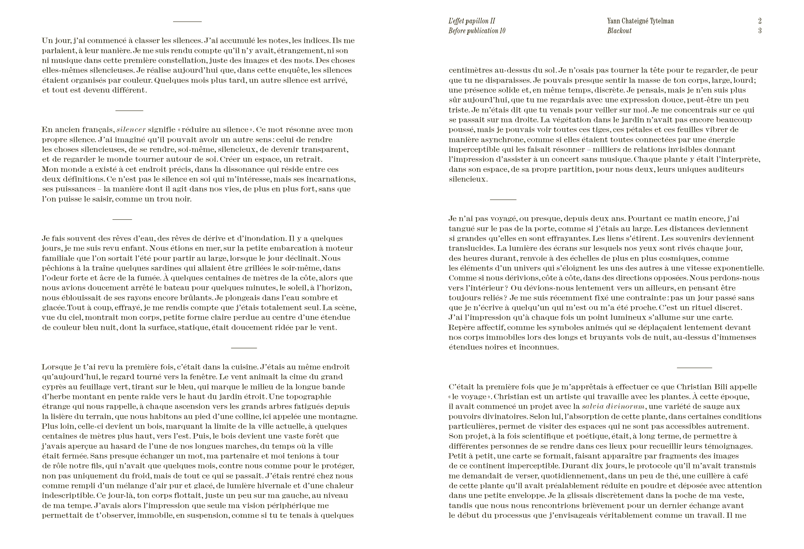 "It all started with a letter to my father. It had been about ten years since his death, and I suddenly felt like writing to him about the silence, his silence, the silence between us. It started in 2020, as a necessity. The silence, then, was striking. It resonated with other erased voices, other voids, other emotions. I thought I would not be able to stop. Neither diary, nor essay, nor short story, Blackout is a weaving, a braid made of these lines of silence, and tells, in fragments, the story of a dispossession, of an entry into darkness."