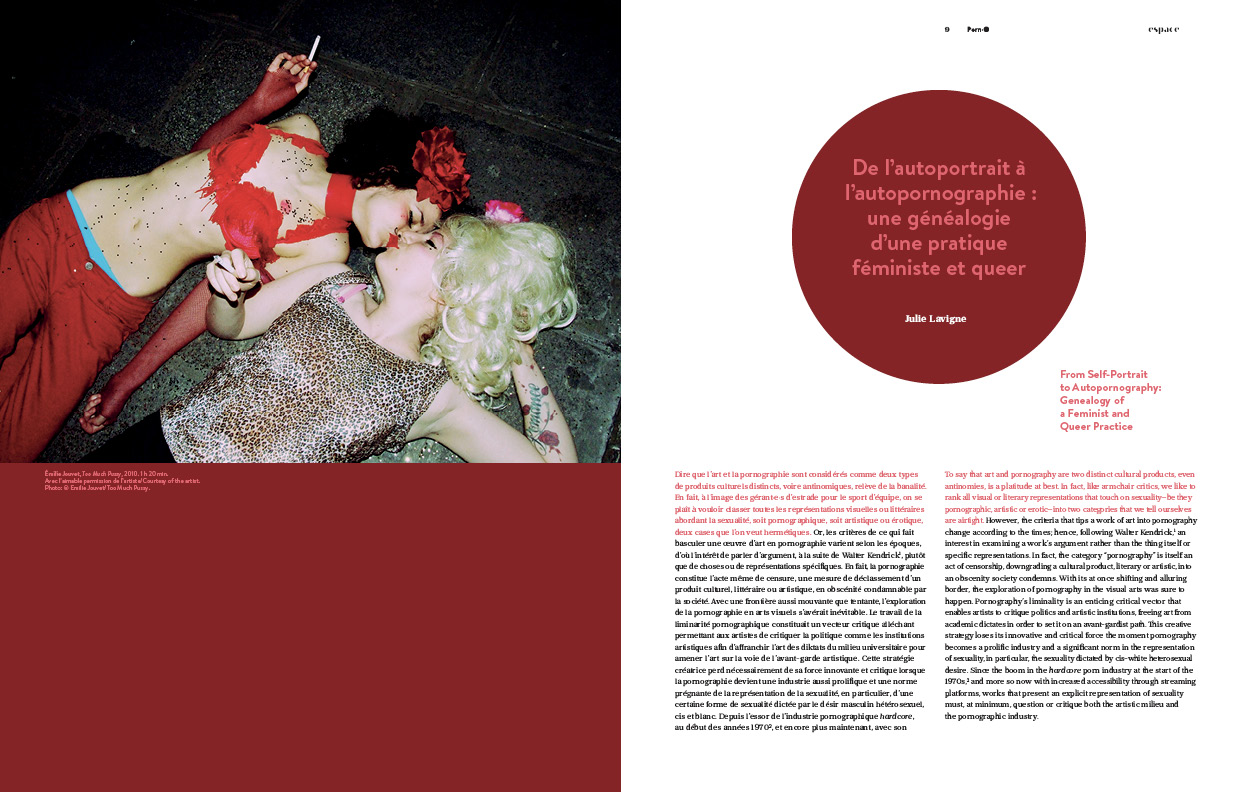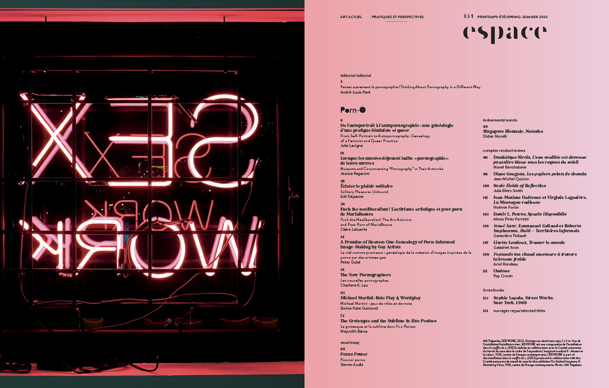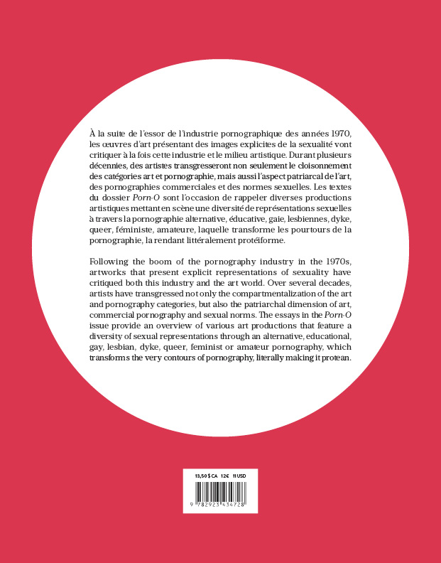 Following the boom of the pornography industry in the 1970s, artworks that present explicit representations of sexuality have critiqued both this industry and the art world. Over several decades, artists have transgressed not only the compartmentalization of the art and pornography categories, but also the patriarchal dimension of art, commercial pornography and sexual norms. The essays in the Porn·O issue provide an overview of various art productions that feature a diversity of sexual representations through an alternative, educational, gay, lesbian, dyke, queer, feminist or amateur pornography, which transforms the very contours of pornography, literally making it protean.