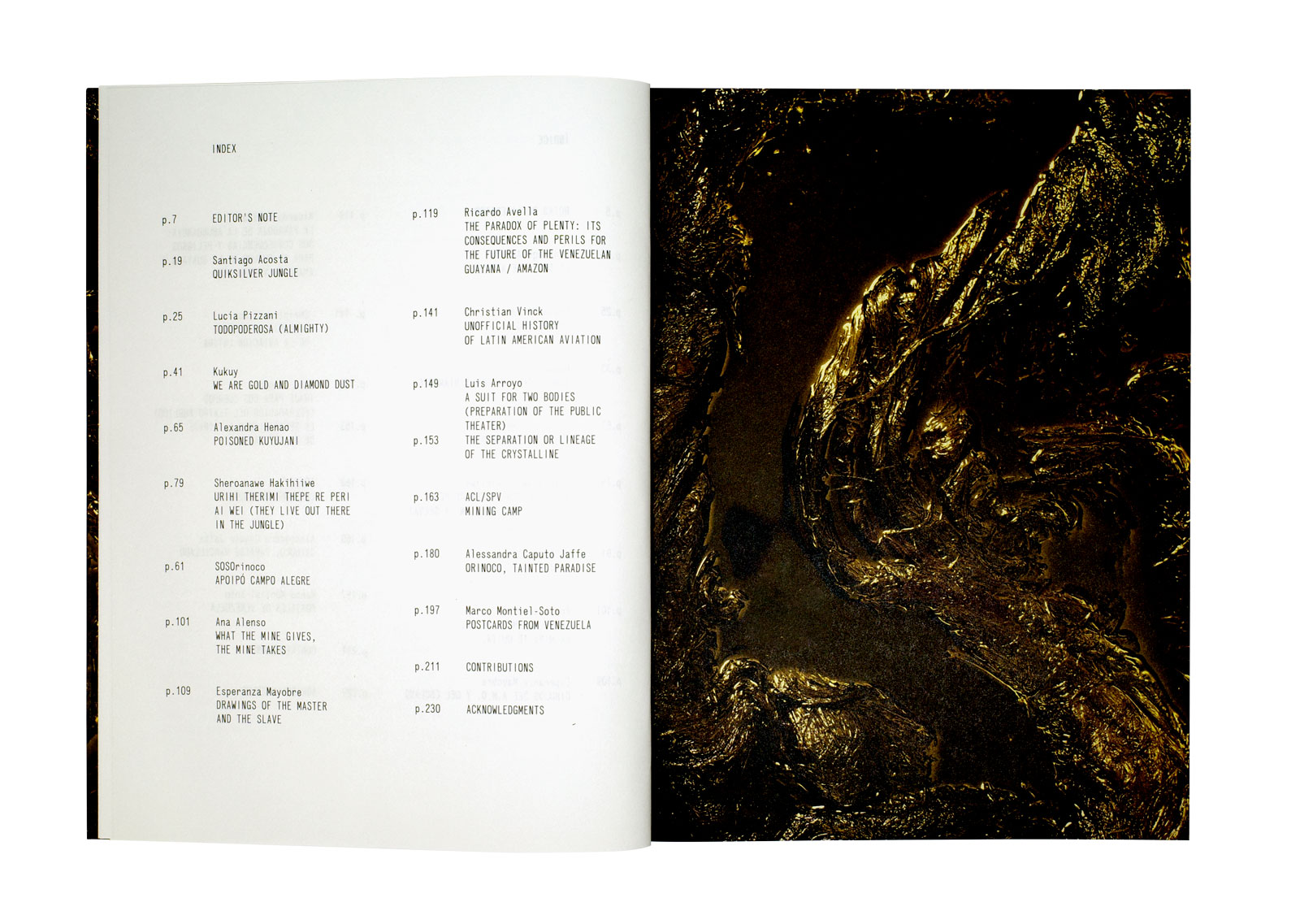 Like a mighty river that flows and deviates from its course, this publication invites us on a journey to decipher the hidden predatory logic within the mechanisms of gold mining exploitation and the resulting socio-ecological devastation in the Guayana and Venezuela's Amazon regions. More than a warning, What the Mine Gives, the Mine Takes presents a collective and sensitive cartography of this mining conflict through a diversity of art projects, poems, essays, diagrams, satellite visions, and documentary images.