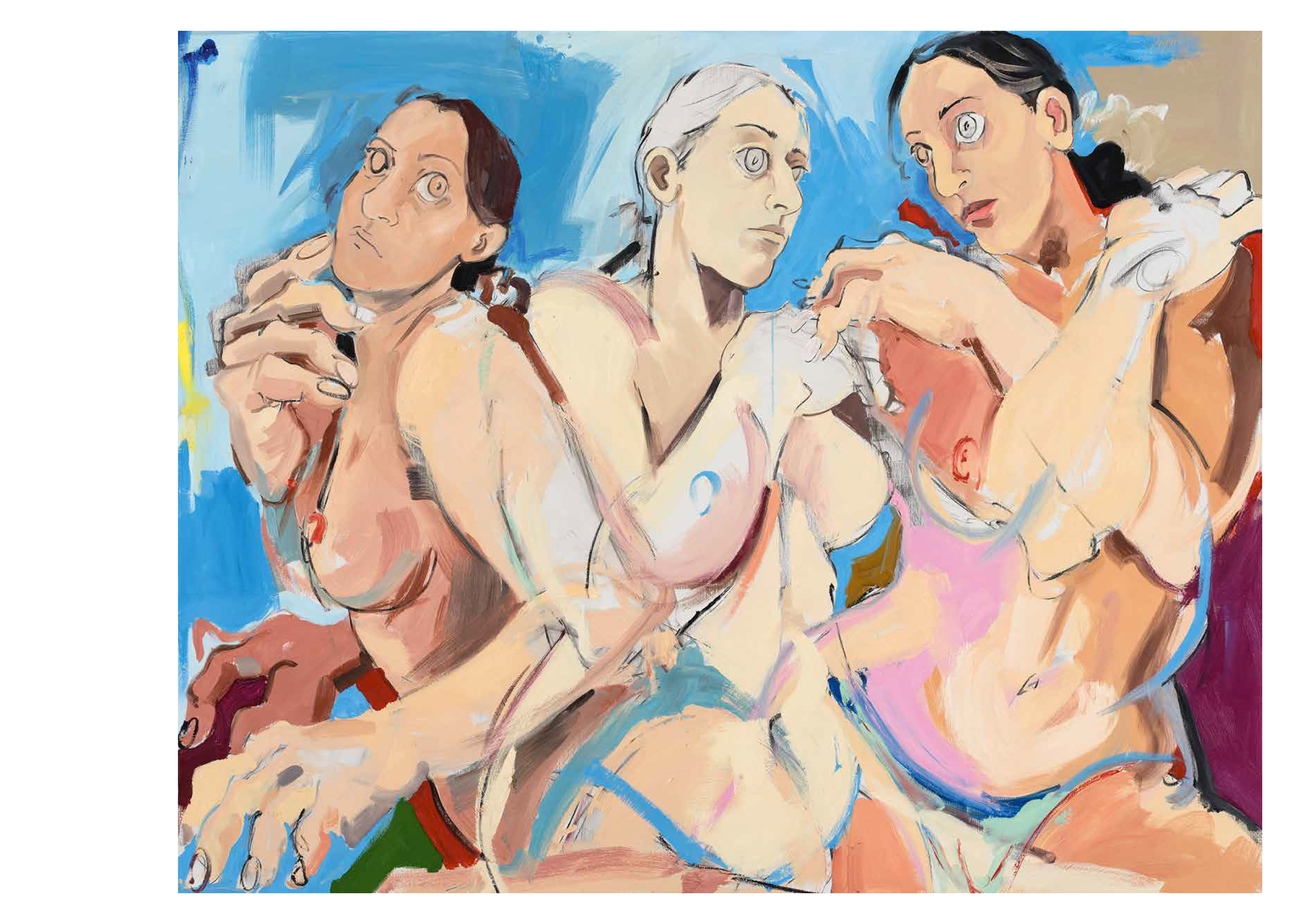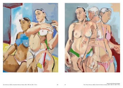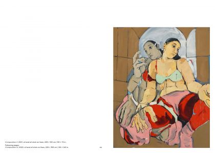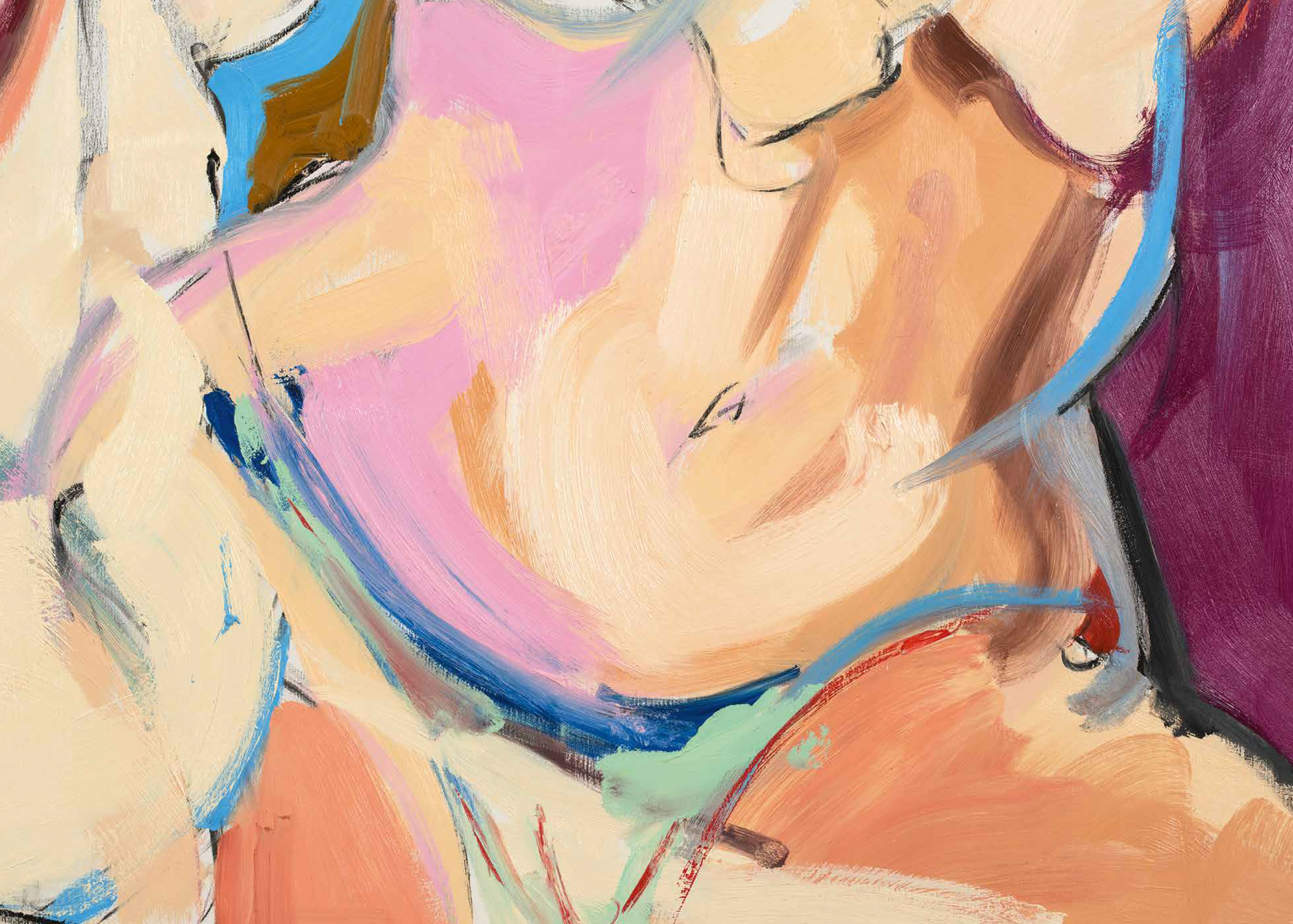 The paintings of Cristina BanBan (born 1987 in Spain) are firmly centered on the female form. She depicts voluptuous figures in a palette of fleshy hues whose forms often overlap and stretch expansively toward the canvas' edge. BanBan's work combines elements associated with modernist European figuration with traces of gestural abstraction. Energetic forms emerge and withdraw from the canvases amidst a rapid attack of loose brushstrokes, punctuated by fields of color that build into layered textured compositions full of expressive motion.