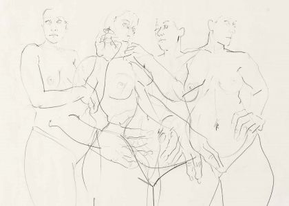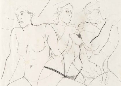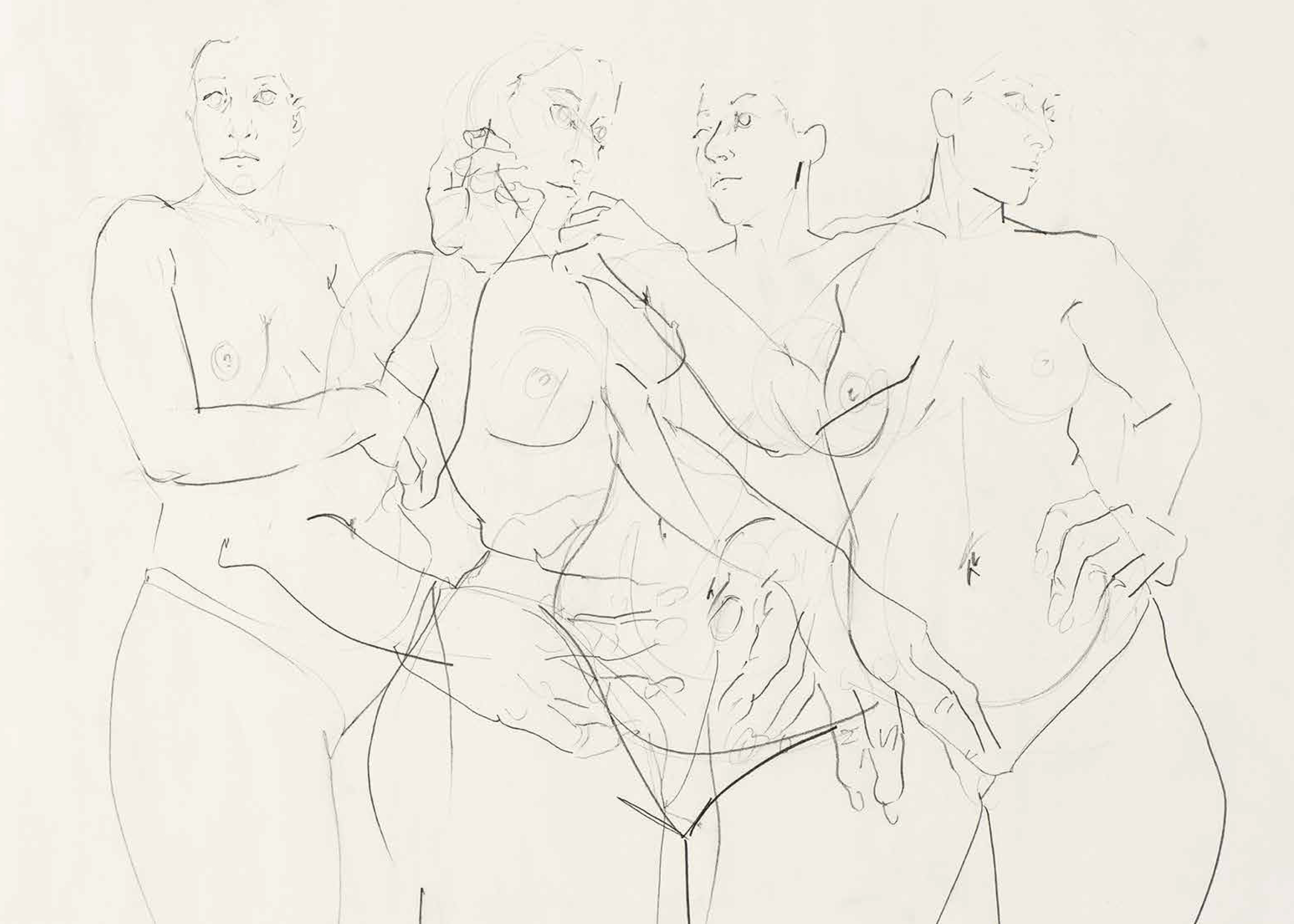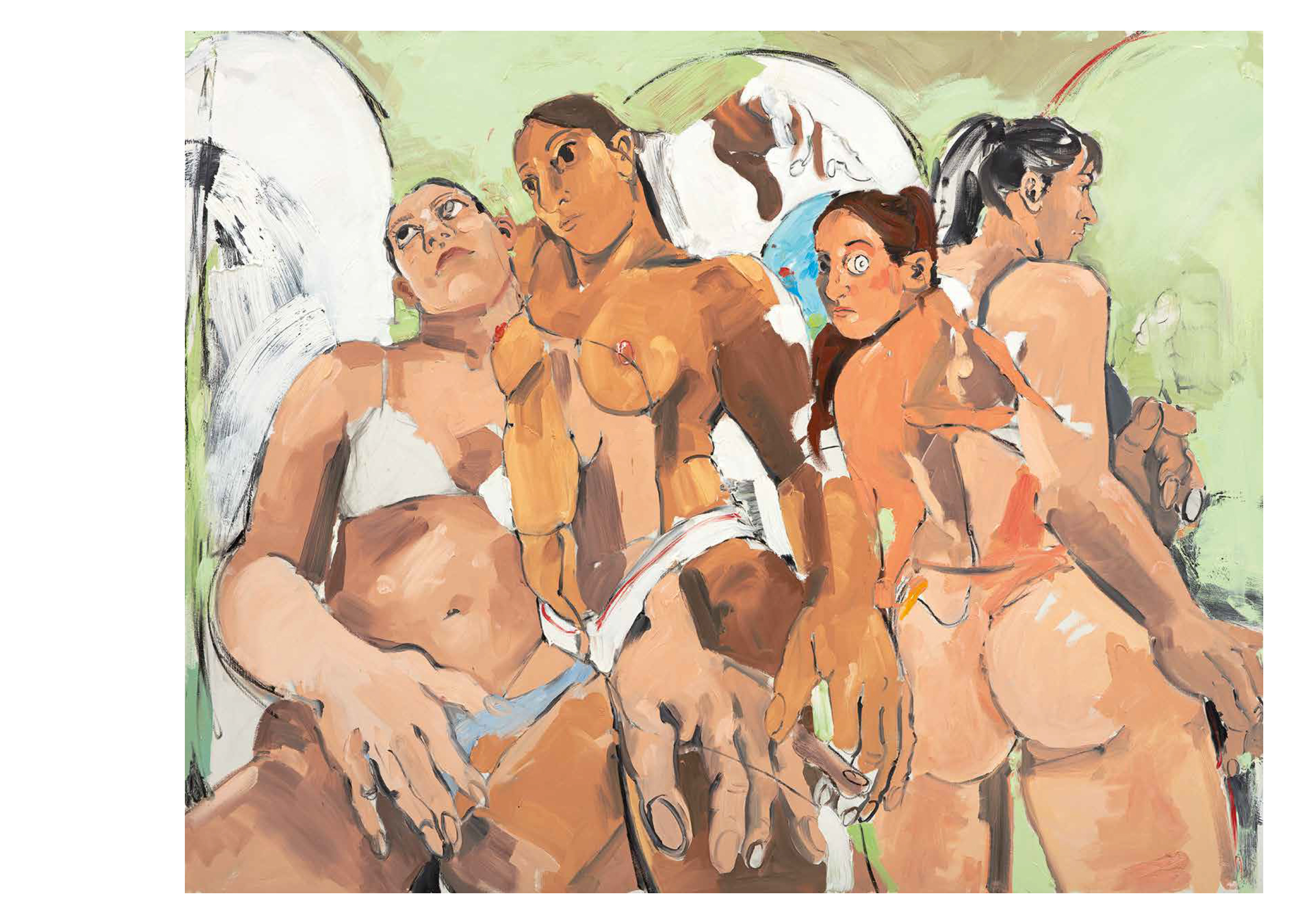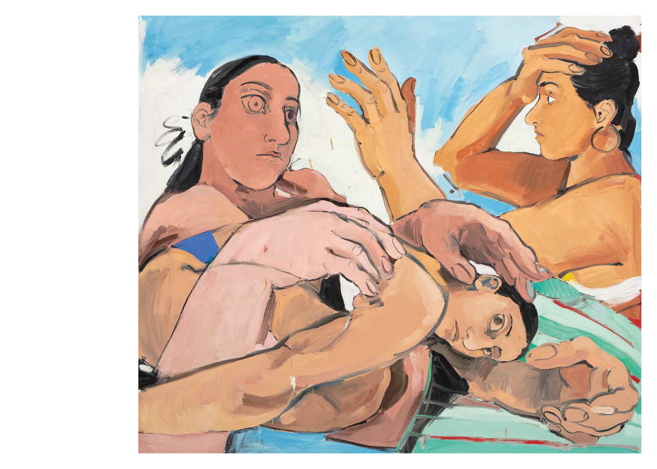 The paintings of Cristina BanBan (born 1987 in Spain) are firmly centered on the female form. She depicts voluptuous figures in a palette of fleshy hues whose forms often overlap and stretch expansively toward the canvas' edge. BanBan's work combines elements associated with modernist European figuration with traces of gestural abstraction. Energetic forms emerge and withdraw from the canvases amidst a rapid attack of loose brushstrokes, punctuated by fields of color that build into layered textured compositions full of expressive motion.