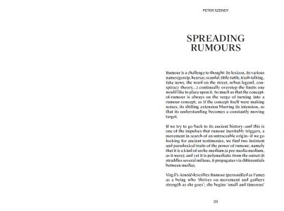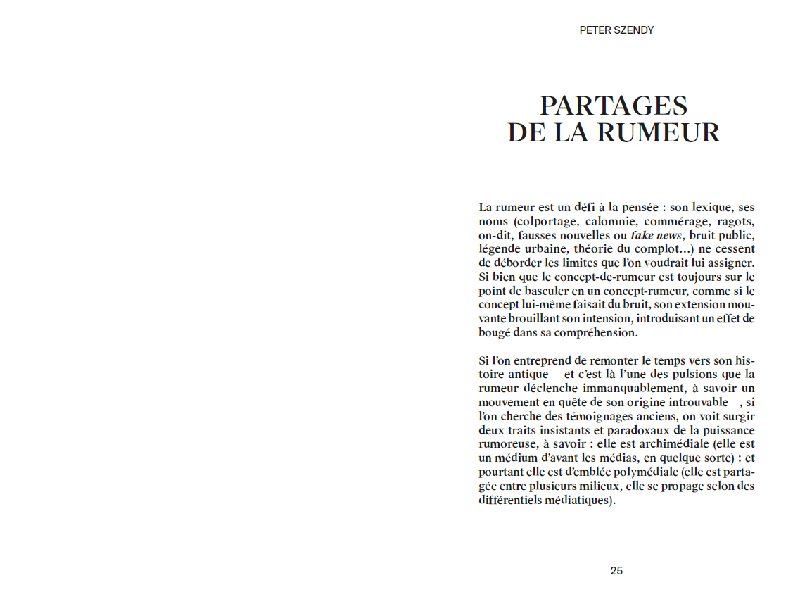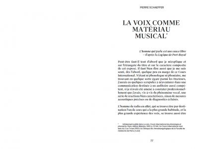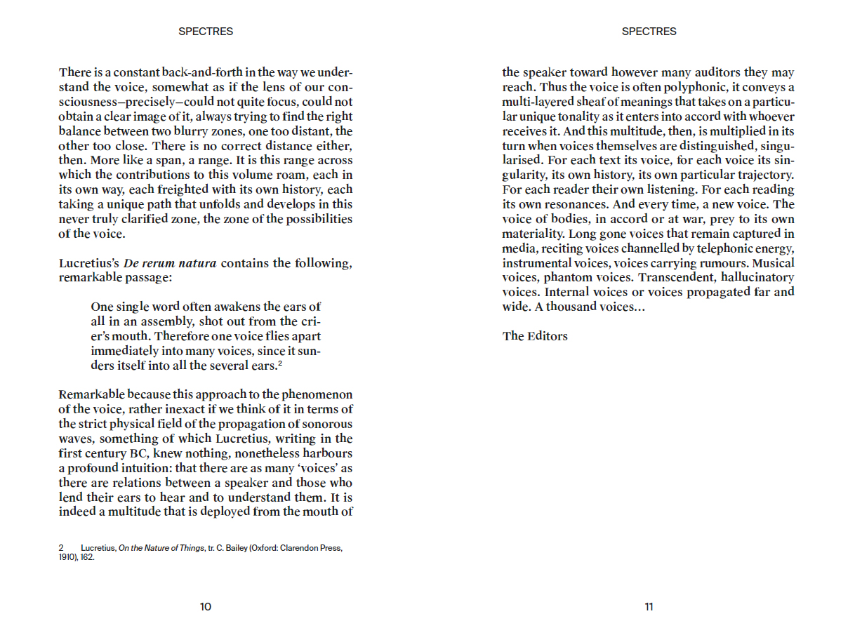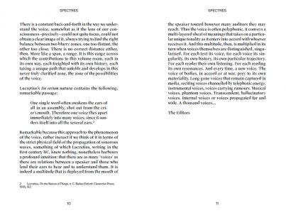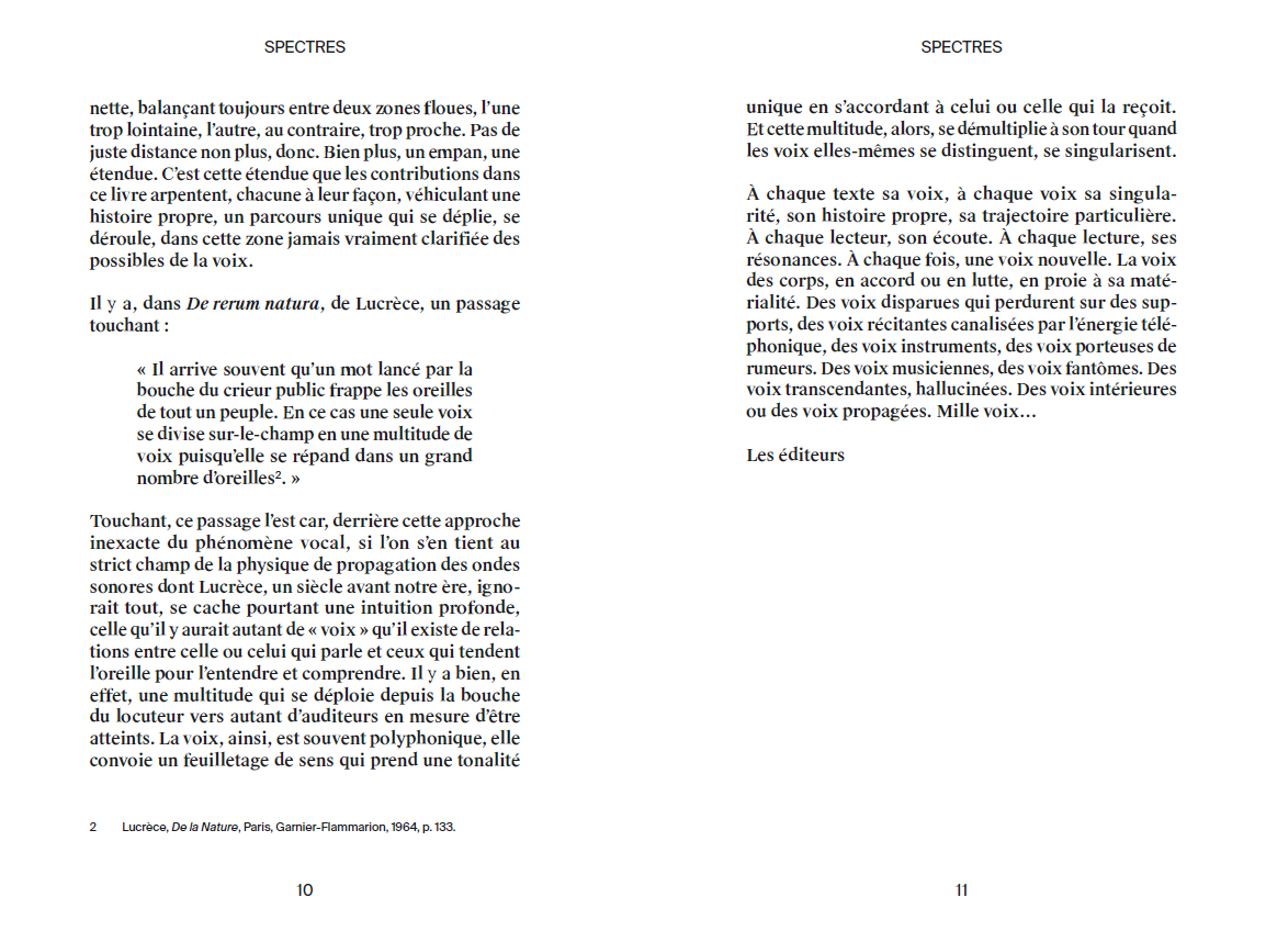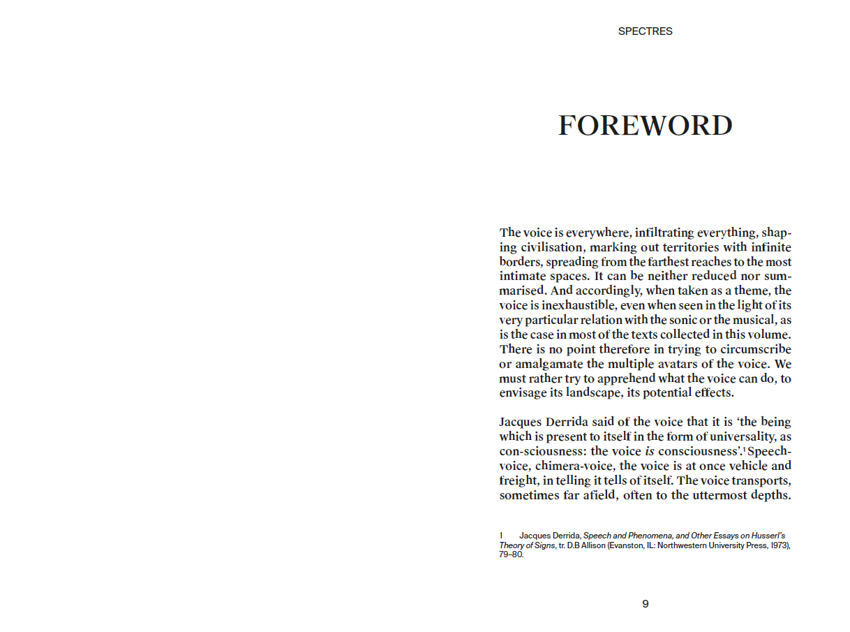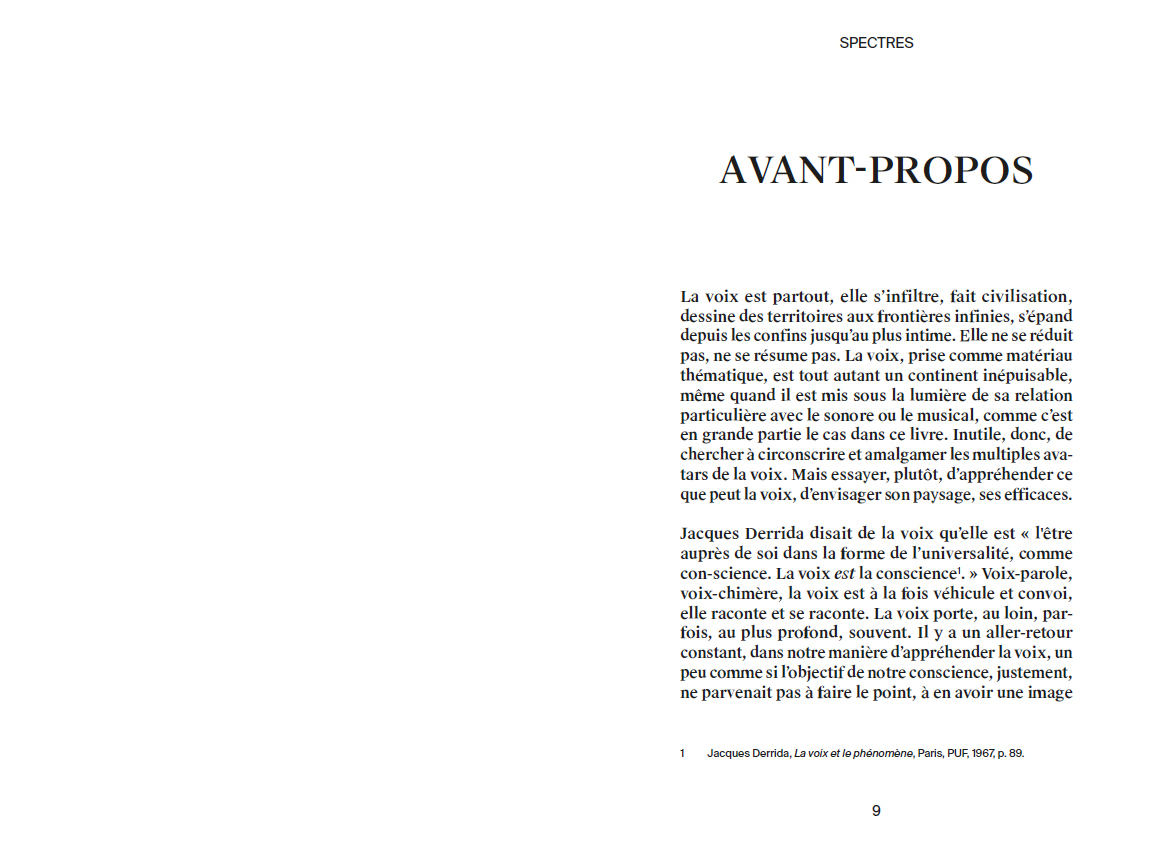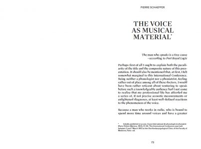 The voice is everywhere, infiltrating everything, making civilisation, marking out territories with infinite borders, spreading from the farthest reaches to the most intimate spaces. It can be neither reduced nor summarised. And accordingly, when taken as a theme, the voice is inexhaustible, even when seen in the light of its very particular relation with the sonic or the musical, as is the case in most of the texts collected in this volume. There is no point therefore in trying to circumscribe or amalgamate the multiple avatars of the voice. We must rather try to apprehend what the voice can do, to envisage its landscape, its potential effects.