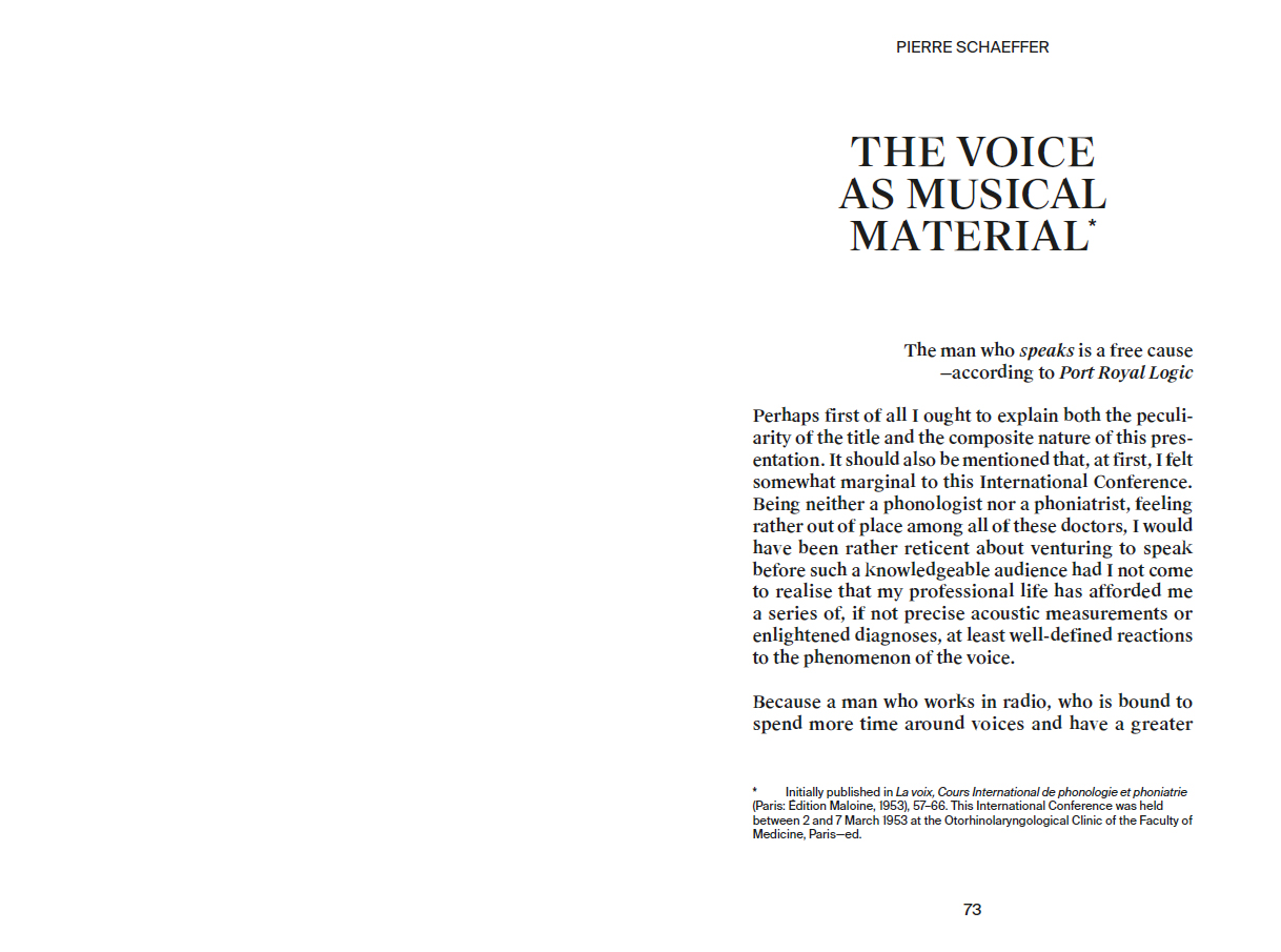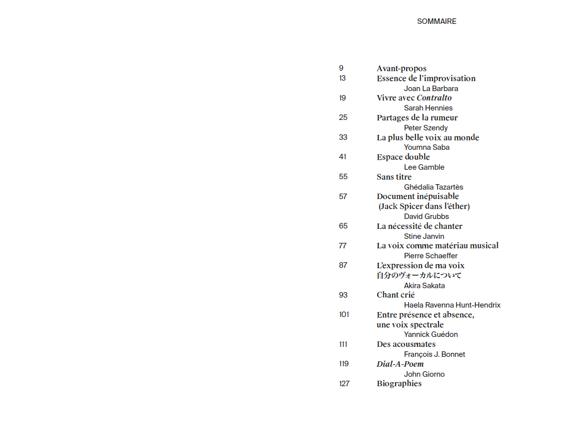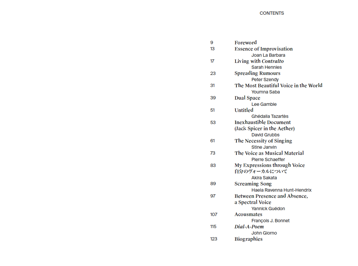 Contributions by Joan La Barbara, Sarah Hennies, Peter Szendy, Youmna Saba, Lee Gamble, Ghédalia Tazartès, David Grubbs, Stine Janvin, Pierre Schaeffer, Akira Sakata, Haela Ravenna Hunt-Hendrix, Yannick Guédon, François J. Bonnet, John Giorno.