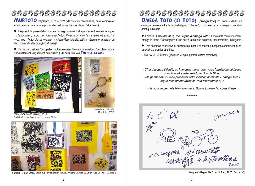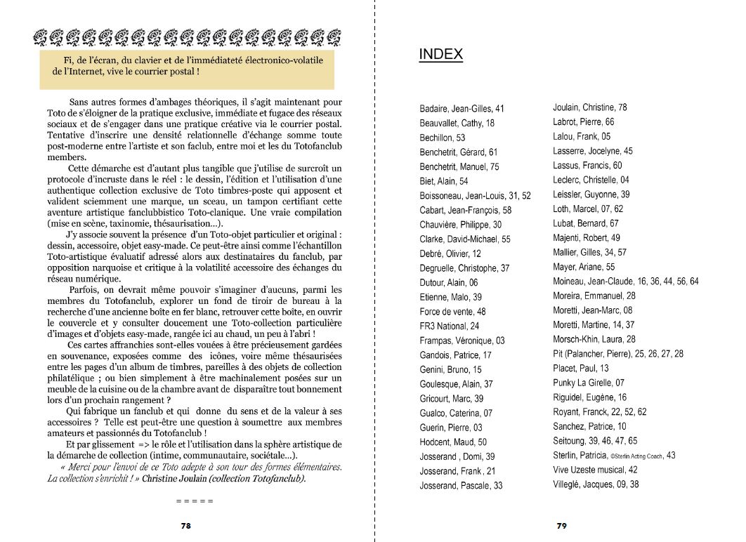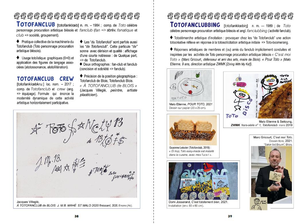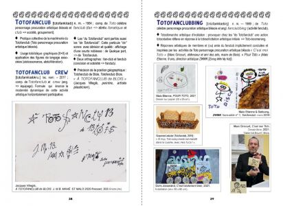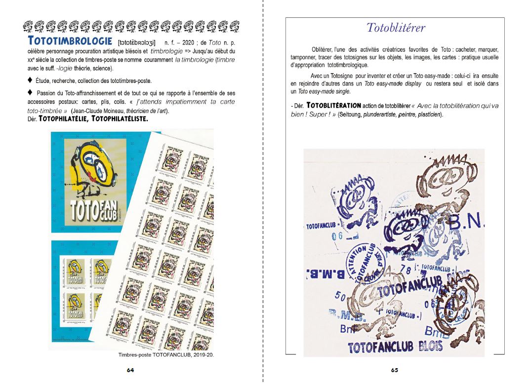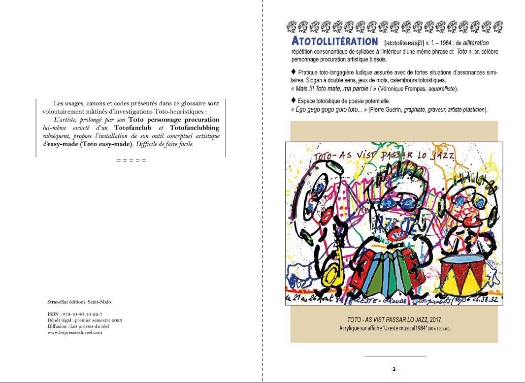 "Toto-Dico #1" is an artist's book by François Giboulet, celebrating his artistic character-procurement nicknamed Toto. This repertoire of "Toto-esque" words and phrases has been forged over the last forty years through a wide range of literary and iconographic exchanges in an informal "Totofanclub". The glossary concludes with a series of epistolary exchanges with