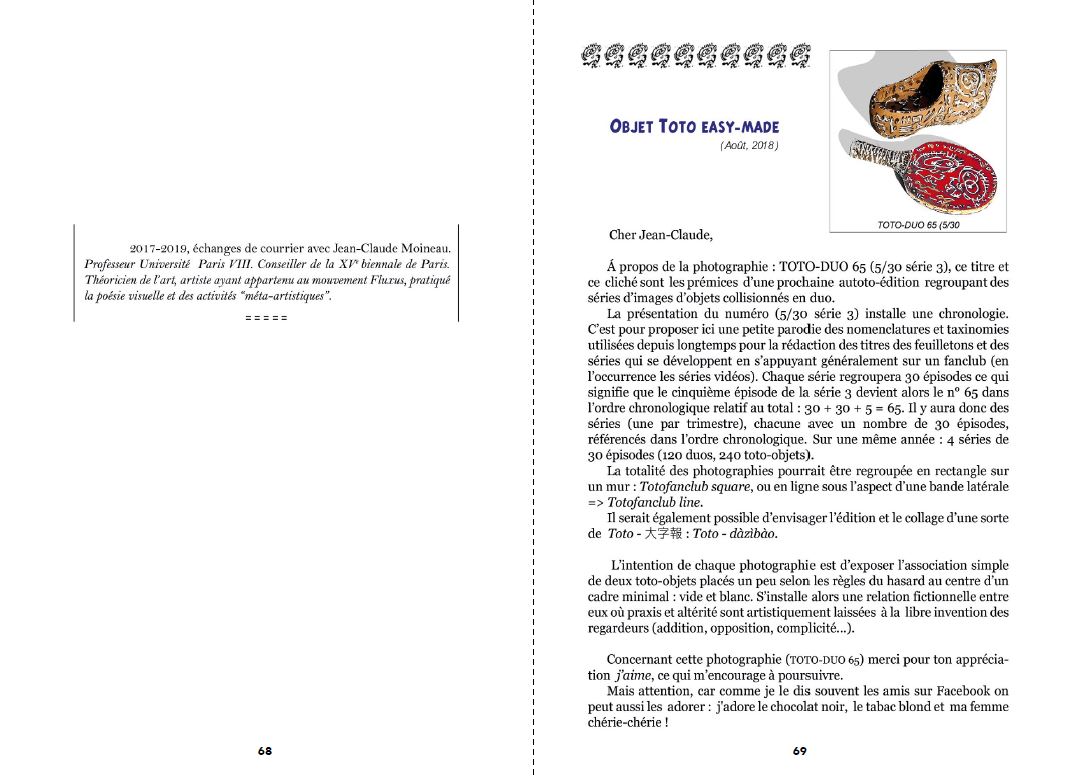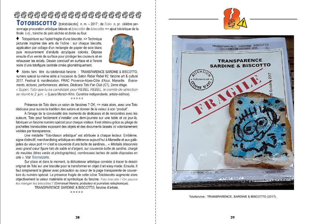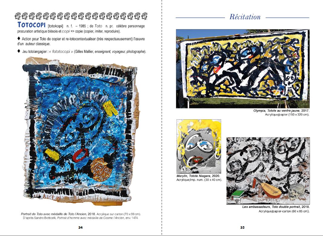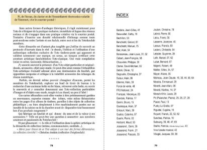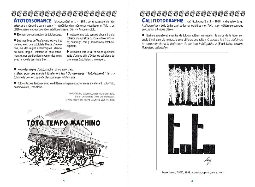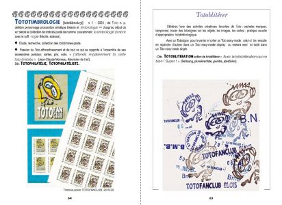 "Toto-Dico #1" is an artist's book by François Giboulet, celebrating his artistic character-procurement nicknamed Toto. This repertoire of "Toto-esque" words and phrases has been forged over the last forty years through a wide range of literary and iconographic exchanges in an informal "Totofanclub". The glossary concludes with a series of epistolary exchanges with