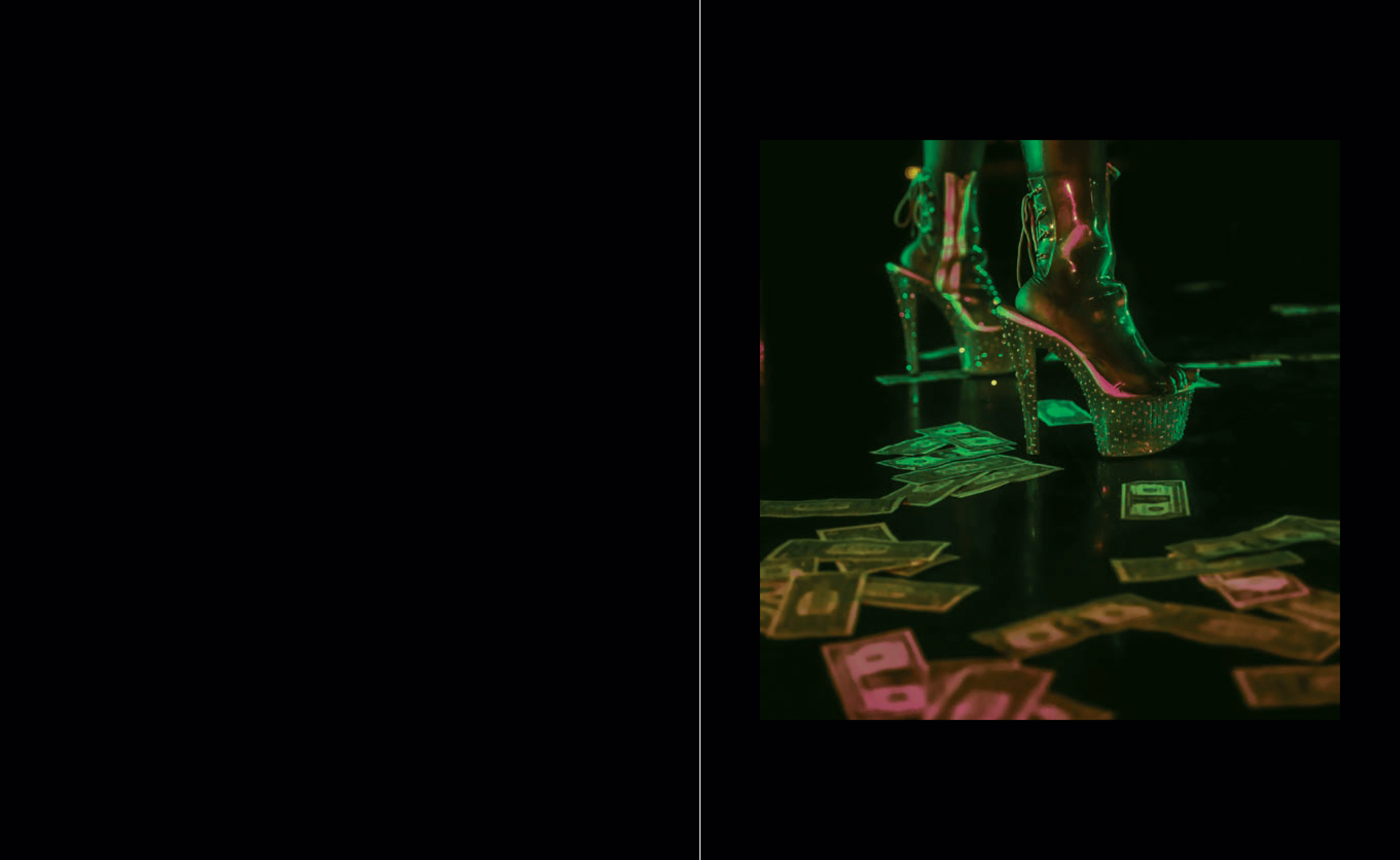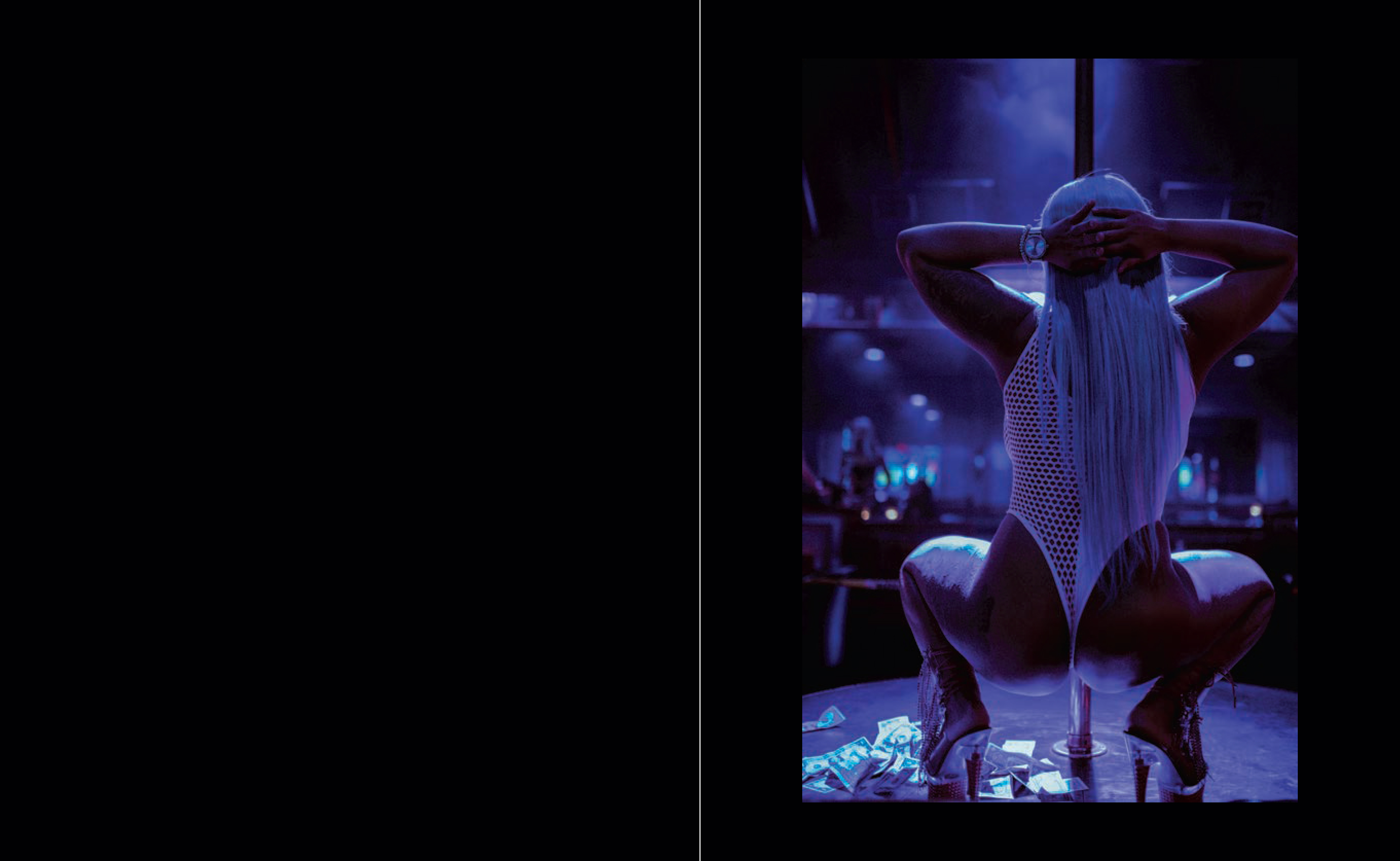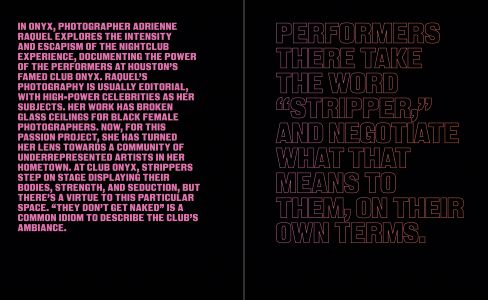 Raquel's photography is usually editorial, with high-power celebrities as her subjects. Her work has broken glass ceilings for Black female photographers. Now, for this passion project commissioned and exhibited at Fotografiska New York in 2021, she has turned her lens towards a community of underrepresented artists in her hometown. At Club Onyx, strippers step on stage displaying their bodies, strength, and seduction, but there's a virtue to this particular space. "They don't get naked" is a common idiom to describe the club's ambiance. Performers there take the word "stripper," and negotiate what that means to them, on their own terms. From powerful images of the dancers mid-movement to detailed shots and intimate portraits, Raquel's striking images put the divine beauty and compelling energy that enlivens Houston's nightlife on full display. She also takes viewers behind the scenes, giving us a window into the community the dancers have built in the privacy of the locker room. Photographed over the course of 2020, "ONYX" displays the empowerment and inclusivity in strip clubs that society has ignored. As captured by Raquel, the night club experience is revealed with layered meaning—granting the chance for these performers to be seen as elevated as the culture they influence.