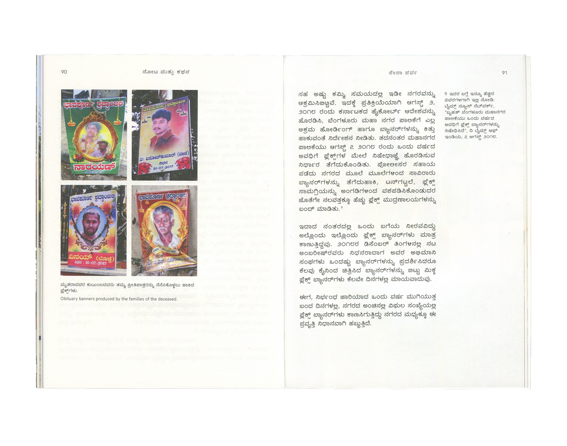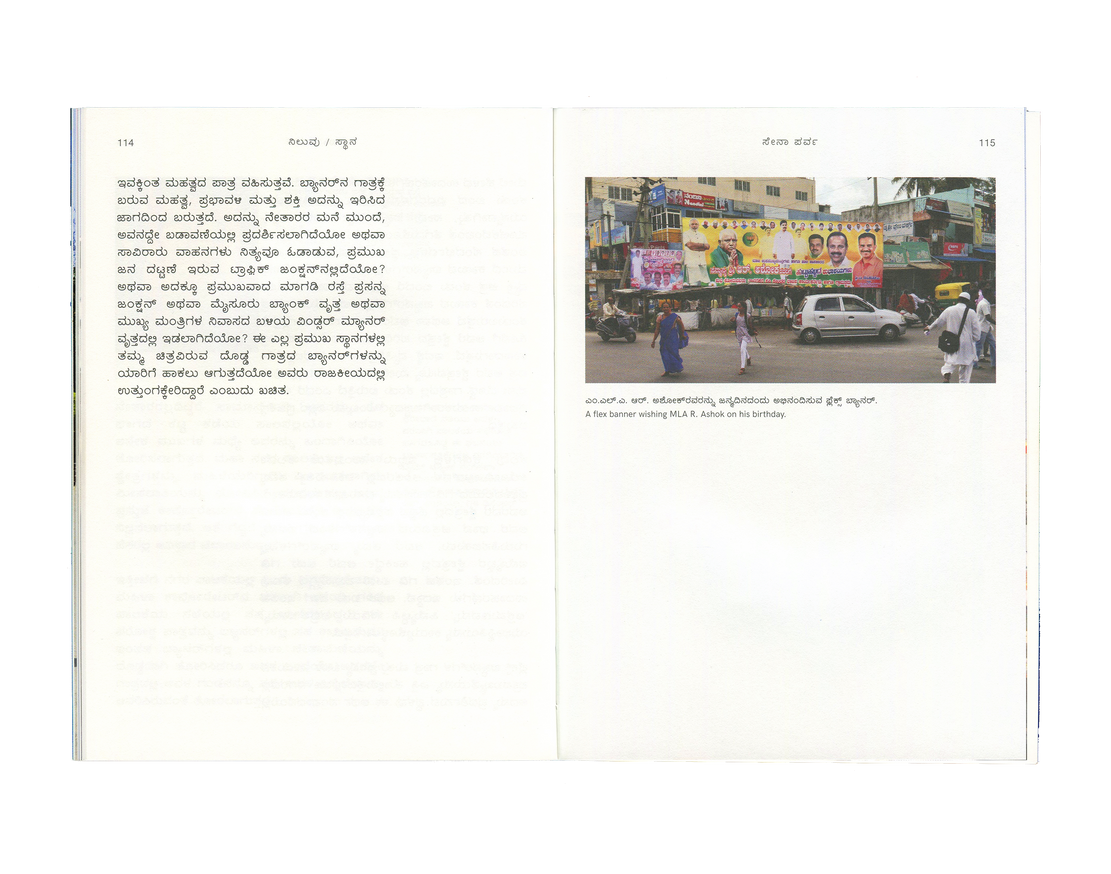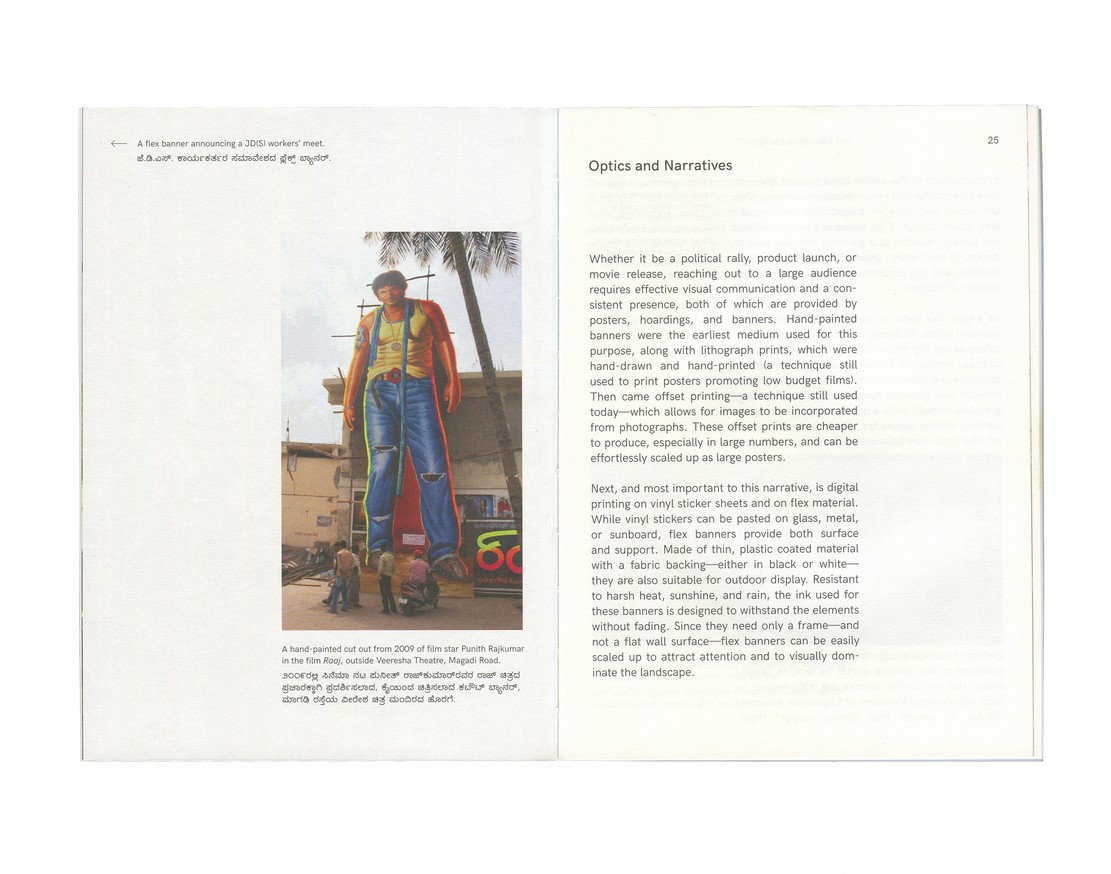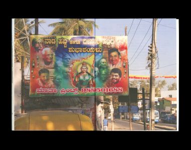 Flexing Muscles brings together an essay in Kannada and English by Ravikumar Kashi reflecting on his observations of the medium, format, and content of these banners. Illustrated with photographs collected by the artist over six years, the essay locates in these banners a portrait of the changing city of Bangalore—one increasingly attuned to aggression and vulnerability.