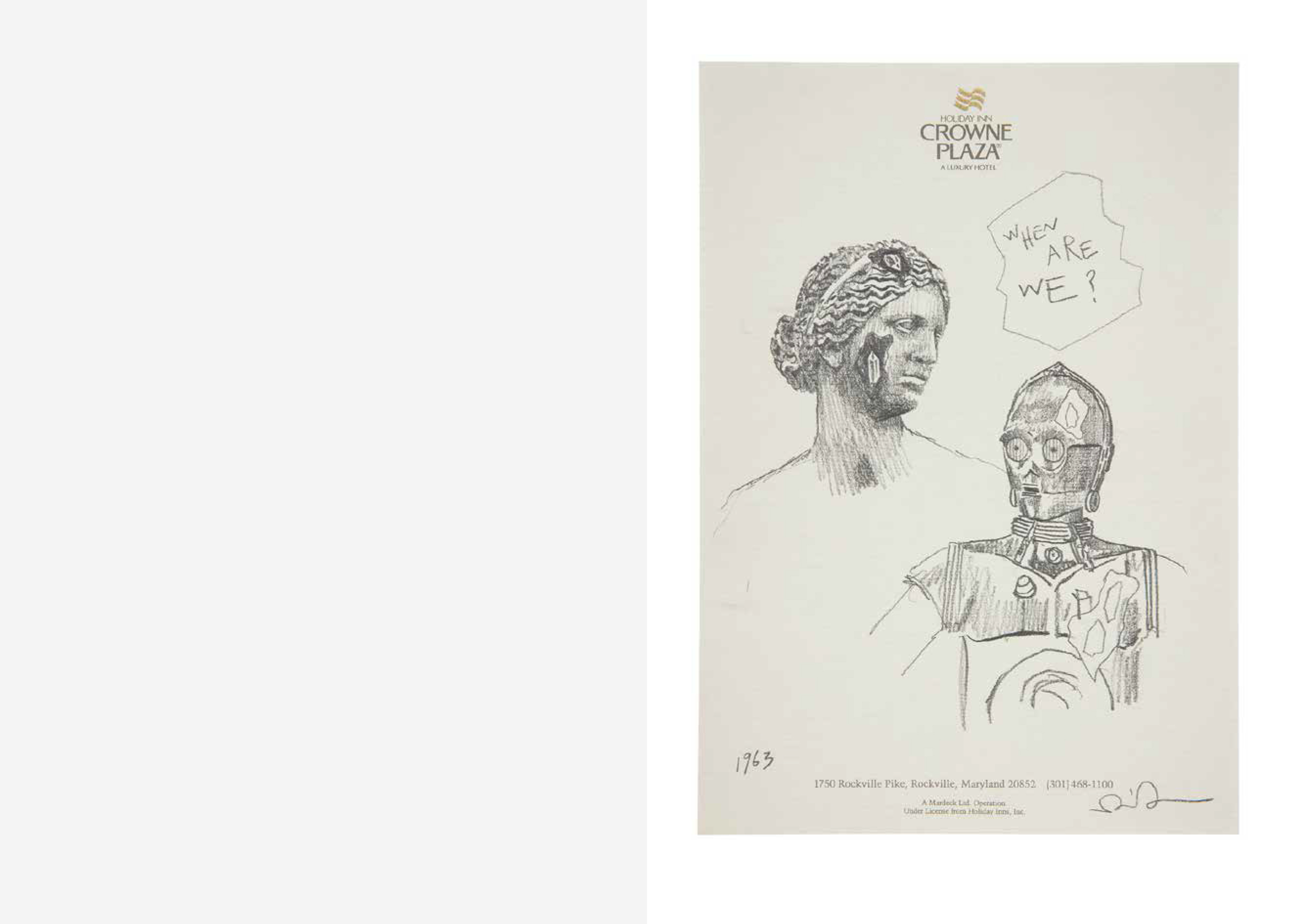 As Arsham's career has taken him across the globe, he began to incorporate the hotel stationary from his travels within his everyday sketching practice. Especially interested in working on letterhead from historic hotels, the artist composes his ideas, usually with an image and text, juxtaposing past and present, a theme echoed within his practice.