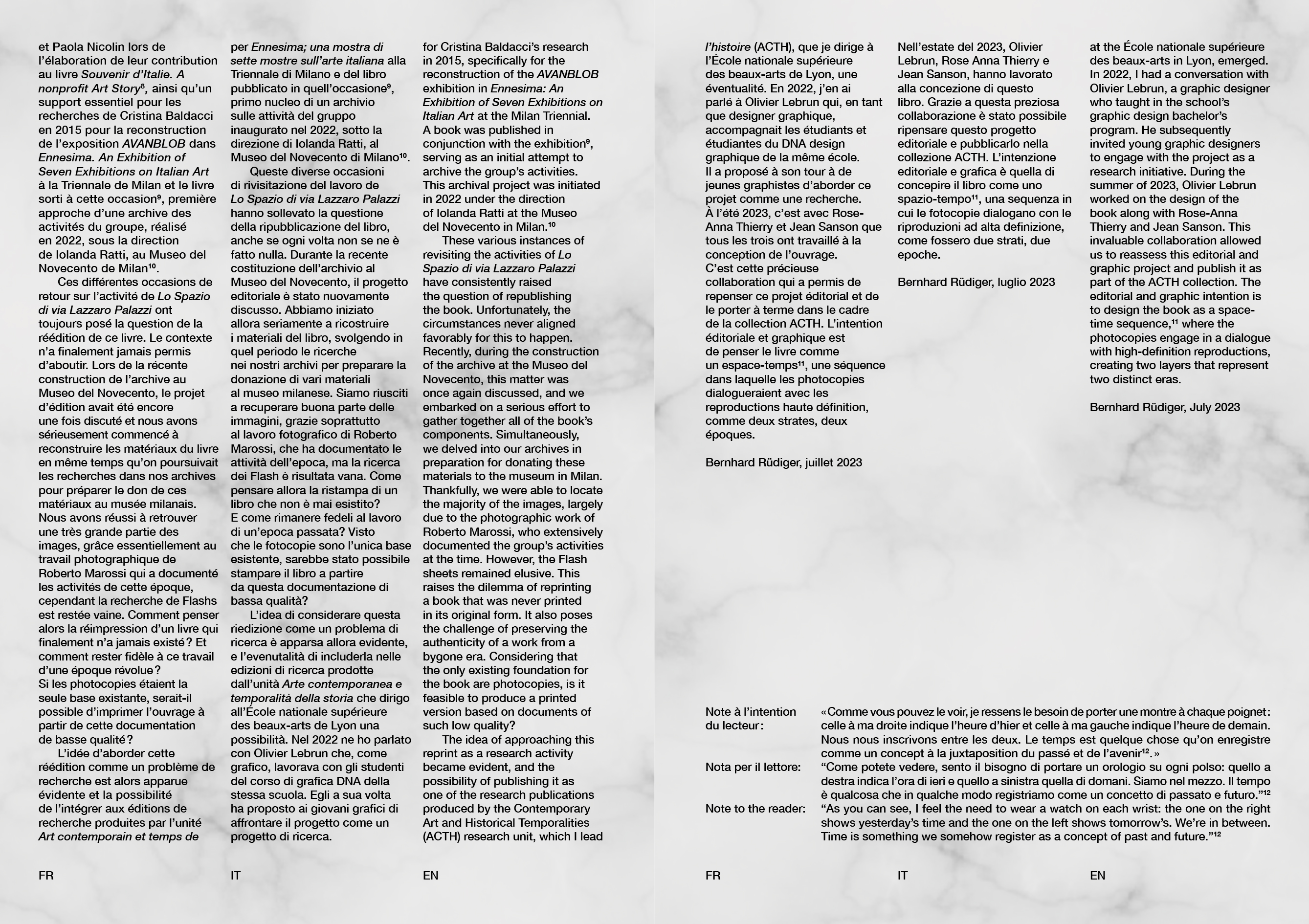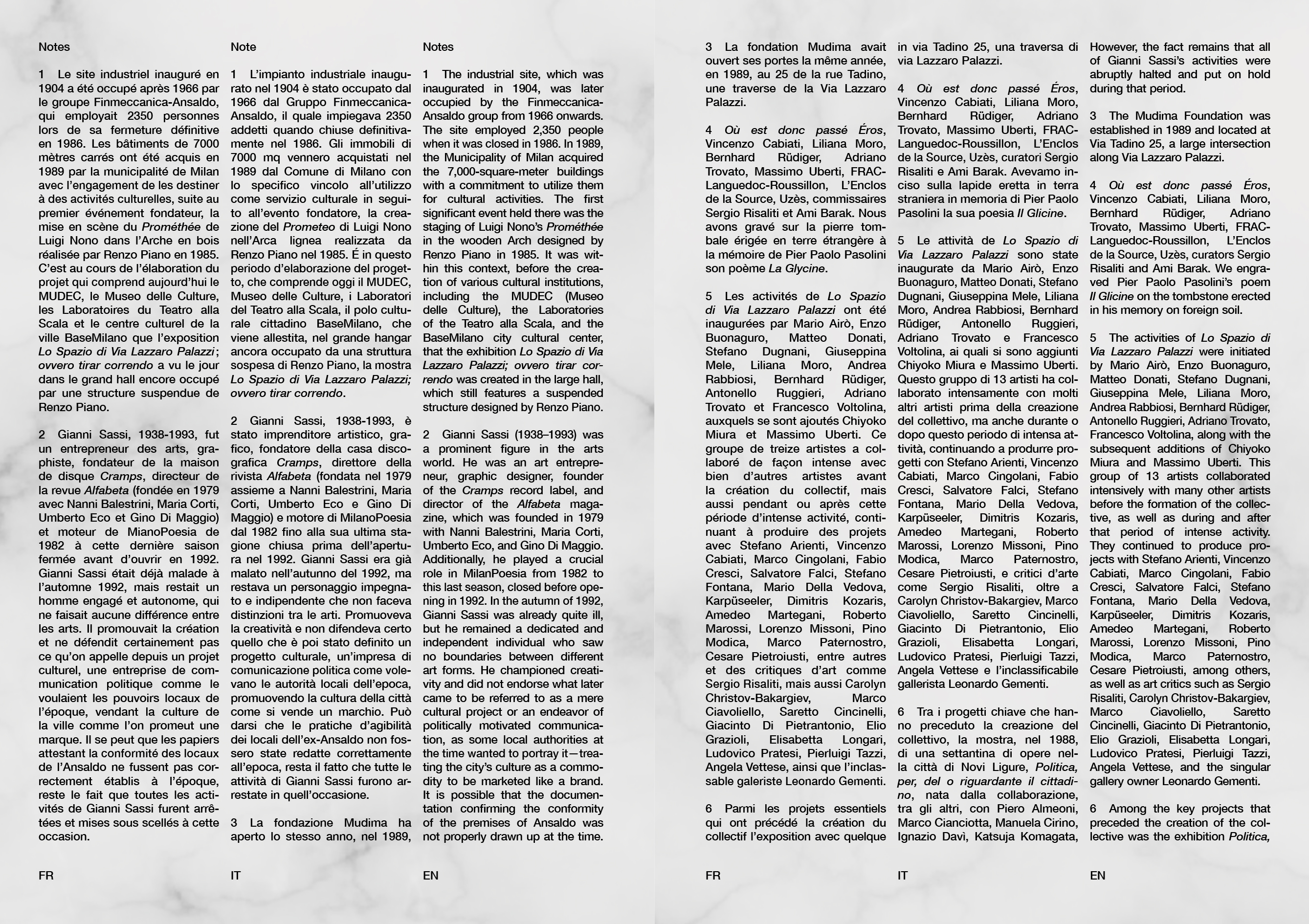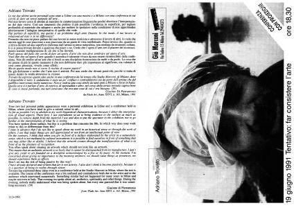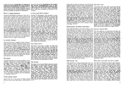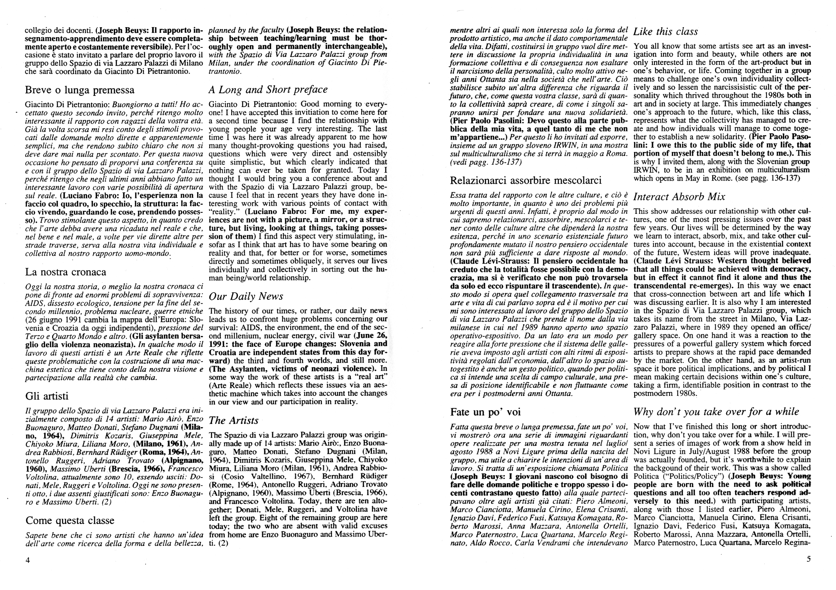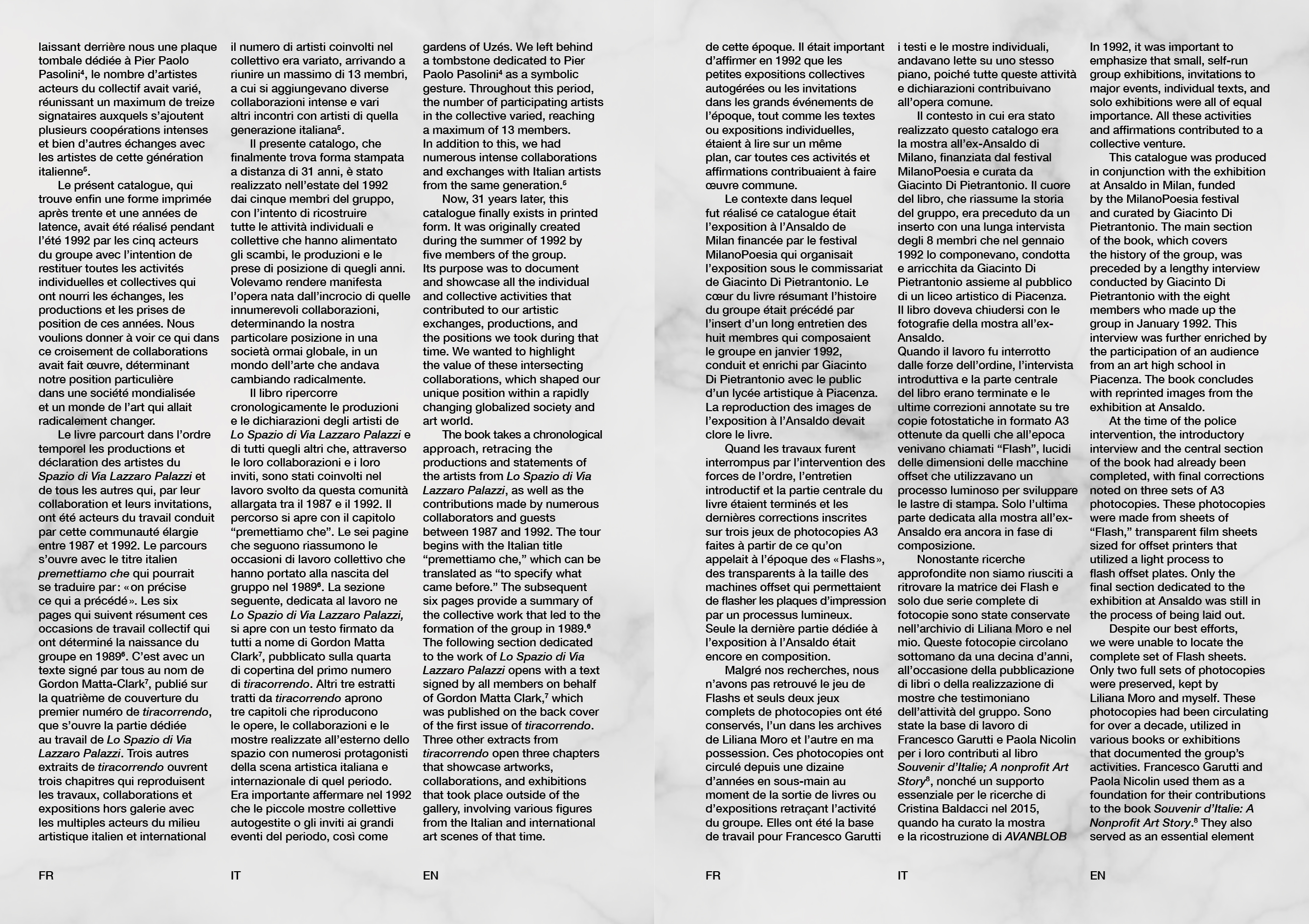 The book takes a chronological approach, retracing the productions and statements of the artists from Lo Spazio di Via Lazzaro Palazzi, as well as the contributions made by numerous collaborators and guests between 1987 and 1992.
