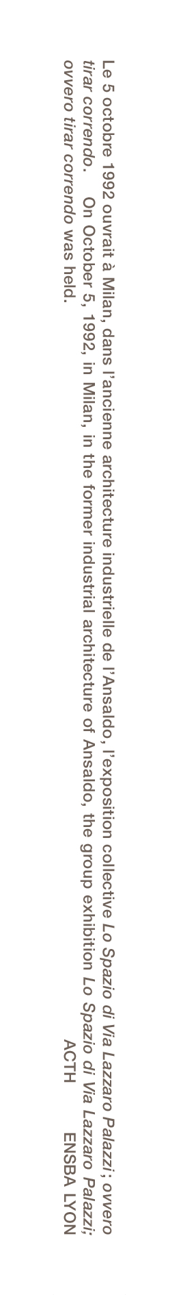 On October 5, 1992, in Milan, in the former industrial architecture of Ansaldo,1 the group exhibition Lo Spazio di Via Lazzaro Palazzi; ovvero tirar correndo was held. Approximately twenty minutes after the opening, a squadron of Carabinieri entered the space and evacuated it on the basis of an invalid permit. The artworks were seized, and all activities of MilanoPoesia, the festival responsible for the exhibition, were halted. One of the ongoing projects that was interrupted was the printing of a catalogue intended to document the activities of the group of artists who worked in and around the Lo Spazio di Via Lazzaro Palazzi exhibition space in Milan. These artists also published the magazine tiracorrendo.