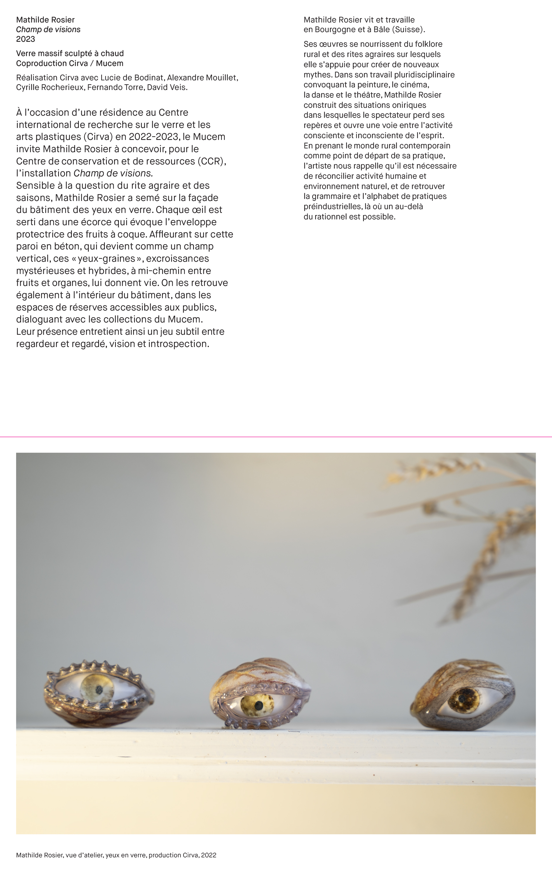 In 2023, Mathilde Rosier created an installation for the Mucem's Centre de conservation et de ressources (CCR), which she named Champ de visions. On the building's façade, the artist has planted glass "seed-eyes", which she imagined during a residency at the Cirva, Marseille.