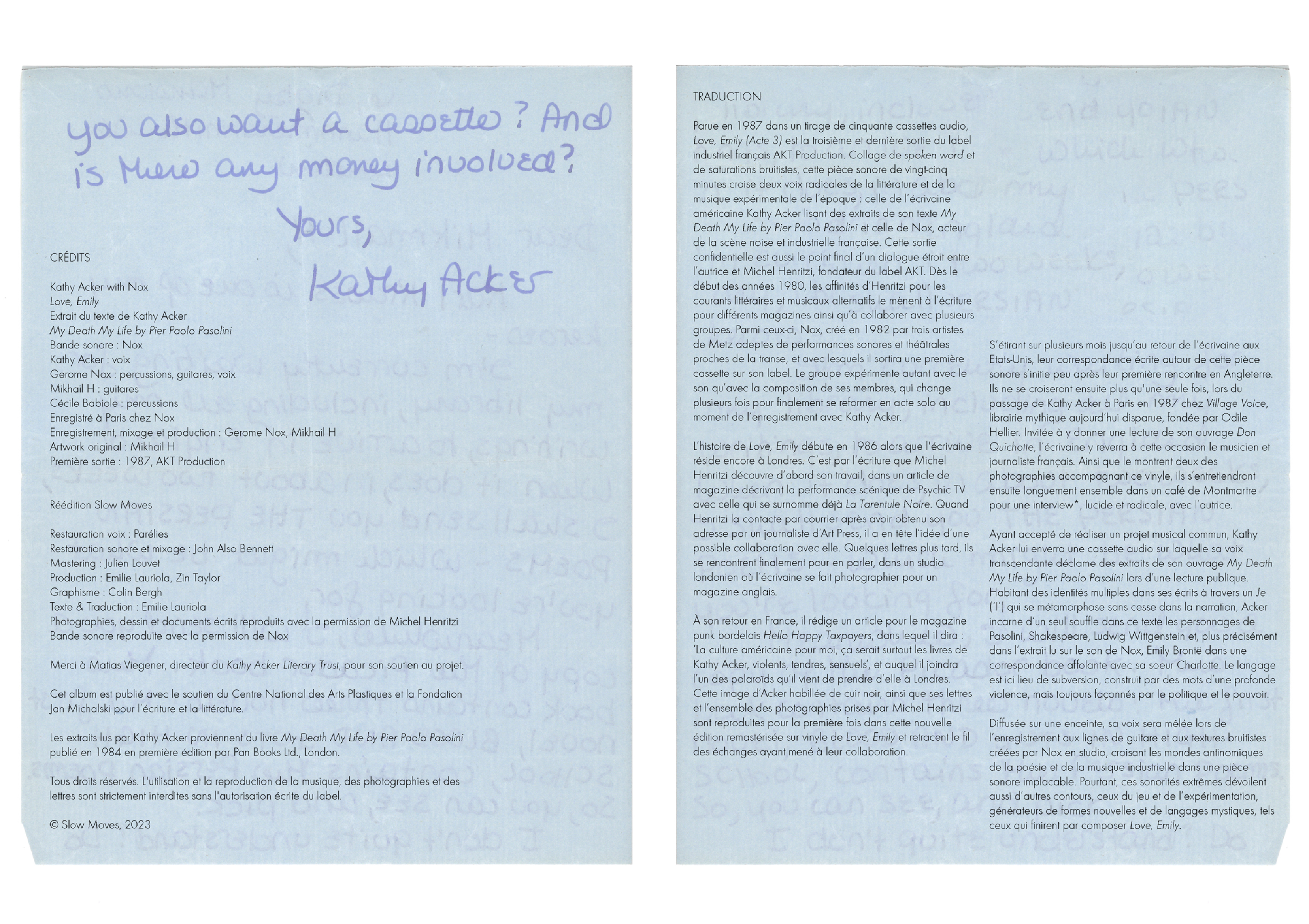 Published in a limited edition of 400 copies, this vinyl also comes with a long printed panel of previously unpublished photographs and letters from Kathy Acker, tracing the background exchanges that led to the collaboration between the groundbreaking writer, Henritzi and Nox, a poster of Kathy Acker with French translations and a download code featuring both music and extra archival material (interview and articles).