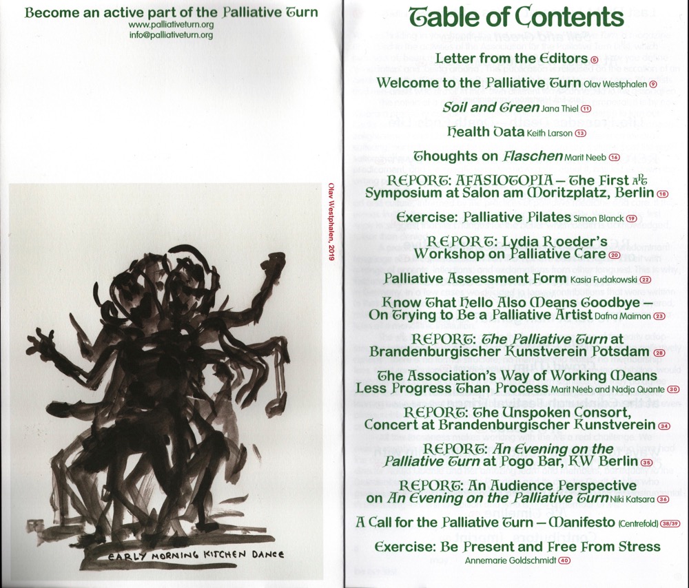 The first issue of The Palliative Turn magazine was conceived and produced in the context of the exhibition and program of events The Palliative Turn at Künstlerhaus Bremen. It documents APTs activities so far and features individual contributions by members of the APT. The contributions were collected by an open call to members and associates of the APT and selected by an editorial team consisting of Simon Blanck, Kasia Fudakowski, Teal Griffin, Harry Haddon, Dafna Maimon, Marit Neeb, Nadja Quante and Olav Westphalen.