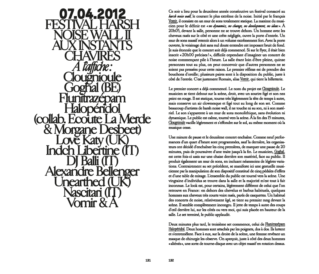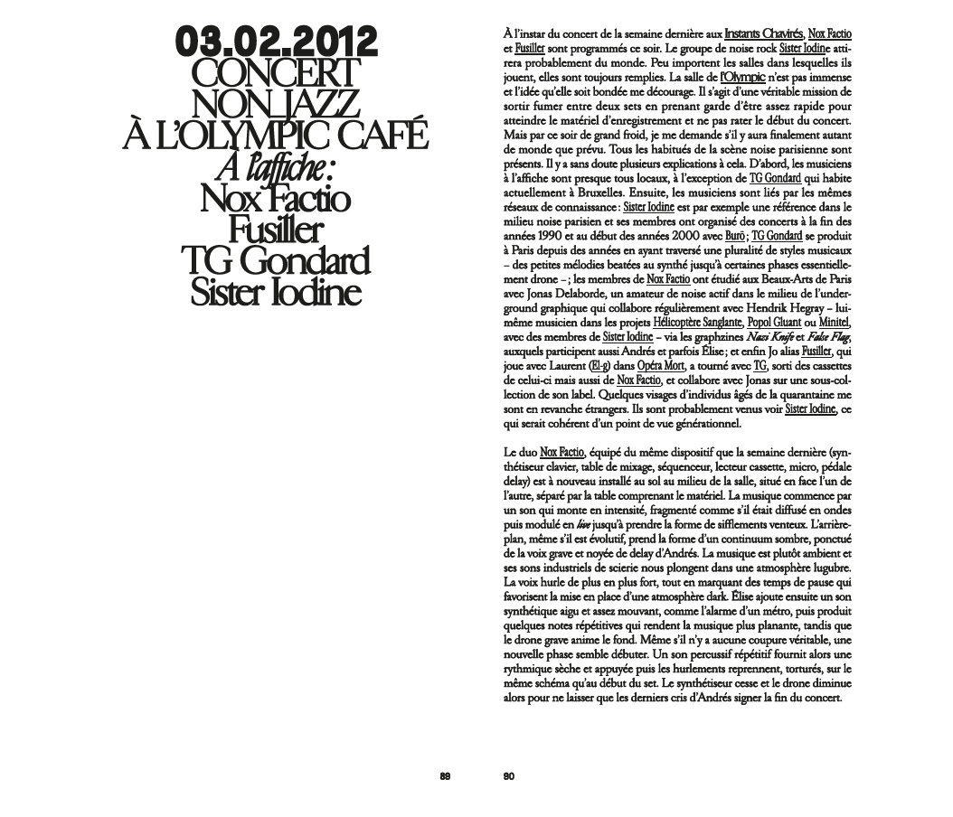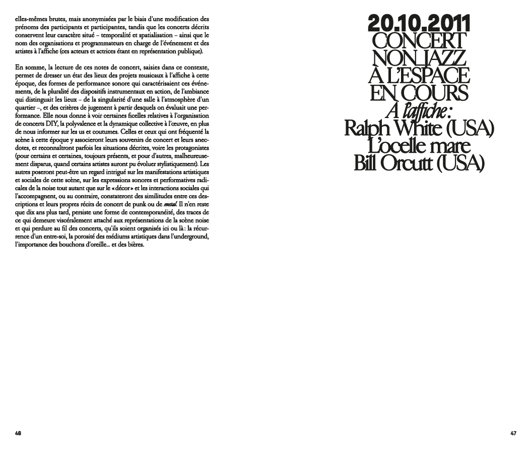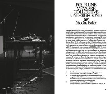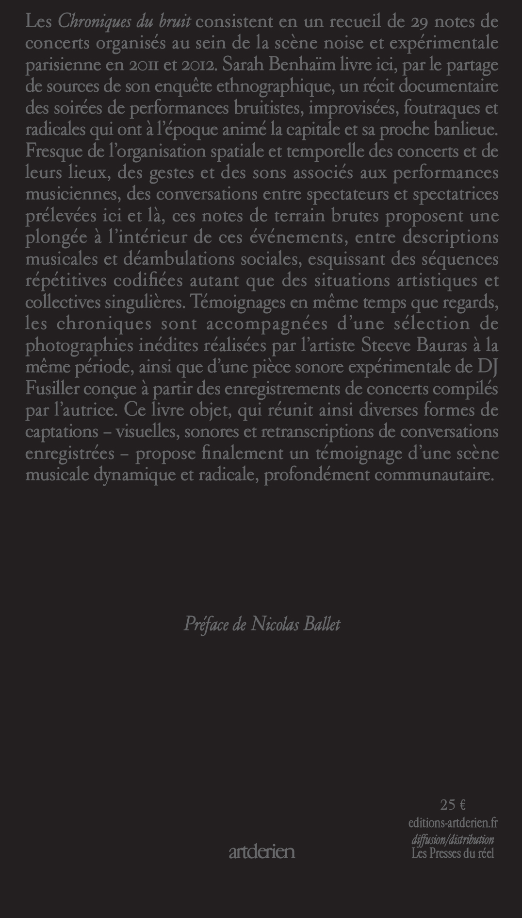 An object book (with CD) featuring 29 concert reviews from the Parisian noise and experimental music scene in 2011 and 2012. It provides insights into a dynamic, radical, and deeply communal music scene. The reviews are accompanied by a selection of 22 unpublished photographs taken by the artist Steeve Bauras during the same period. Additionally, there is an experimental sound piece by DJ Fusiller created from concert recordings compiled by the author. Period flyers are randomly inserted throughout the book.