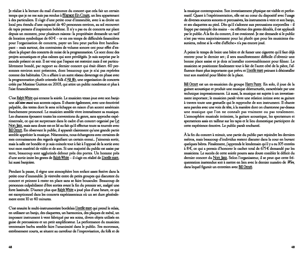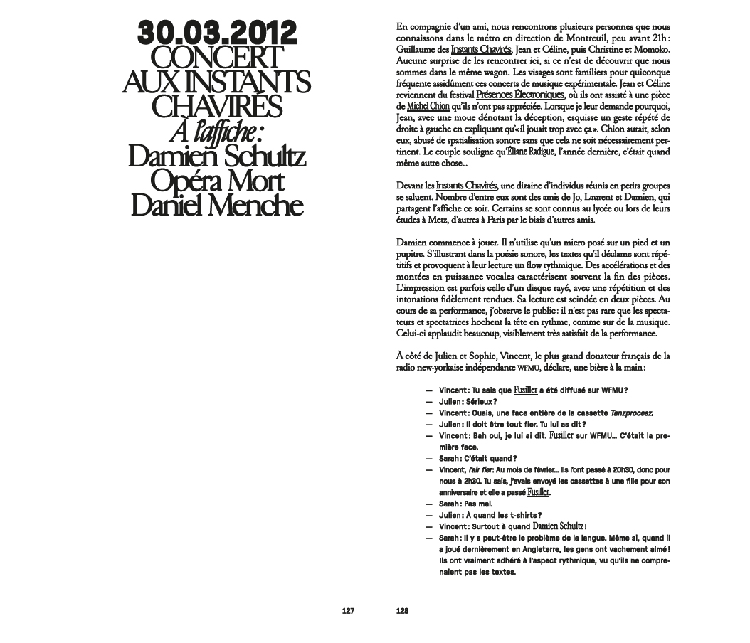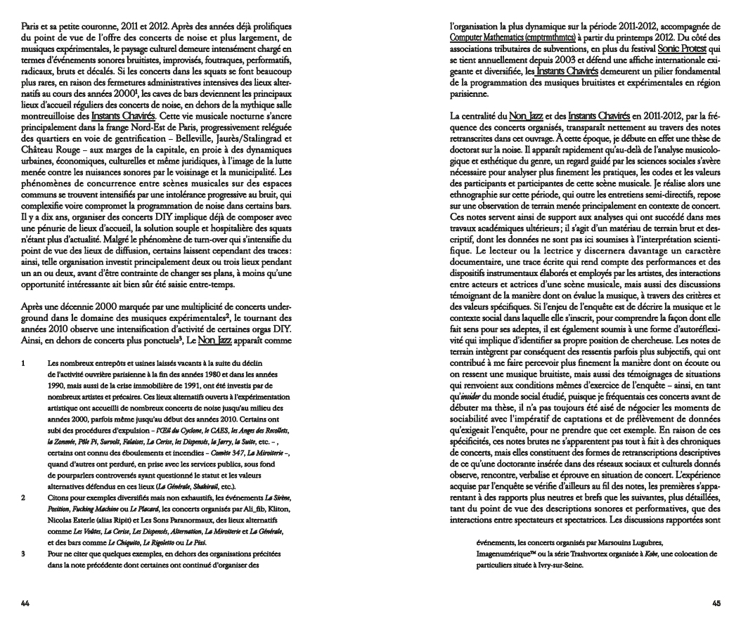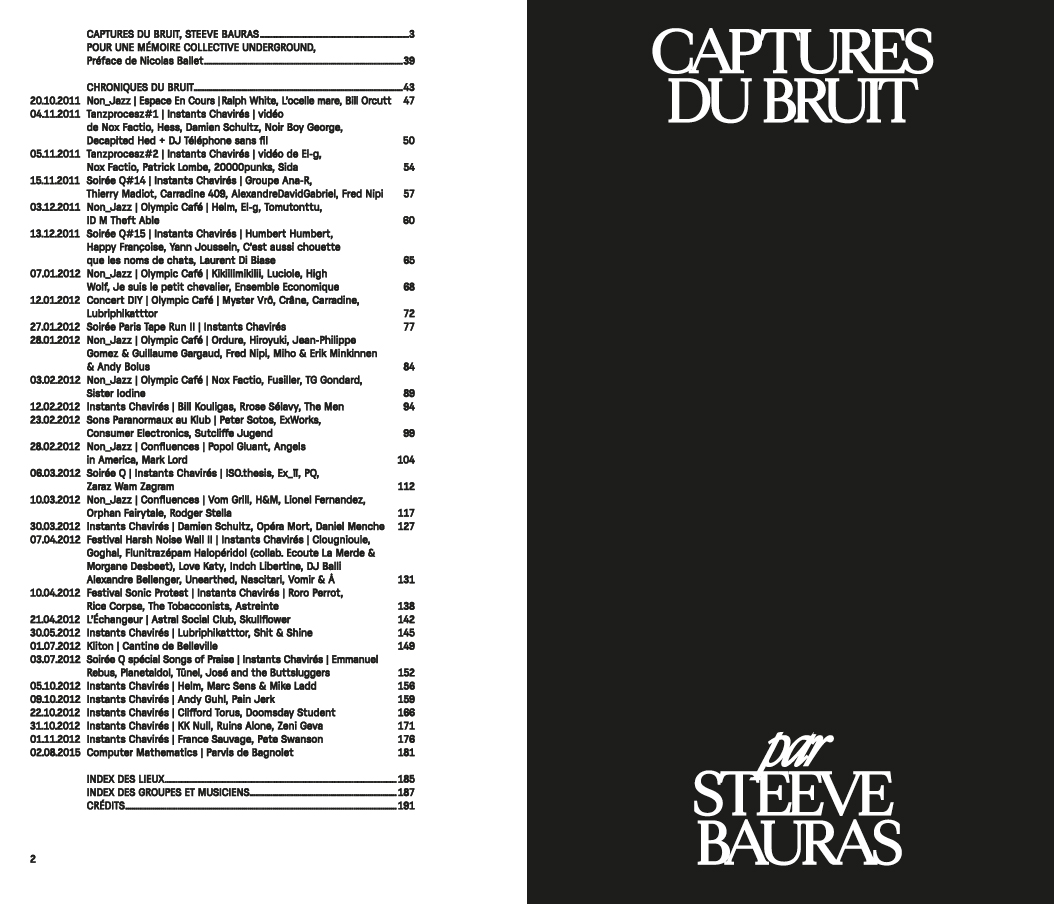 An object book (with CD) featuring 29 concert reviews from the Parisian noise and experimental music scene in 2011 and 2012. It provides insights into a dynamic, radical, and deeply communal music scene. The reviews are accompanied by a selection of 22 unpublished photographs taken by the artist Steeve Bauras during the same period. Additionally, there is an experimental sound piece by DJ Fusiller created from concert recordings compiled by the author. Period flyers are randomly inserted throughout the book.