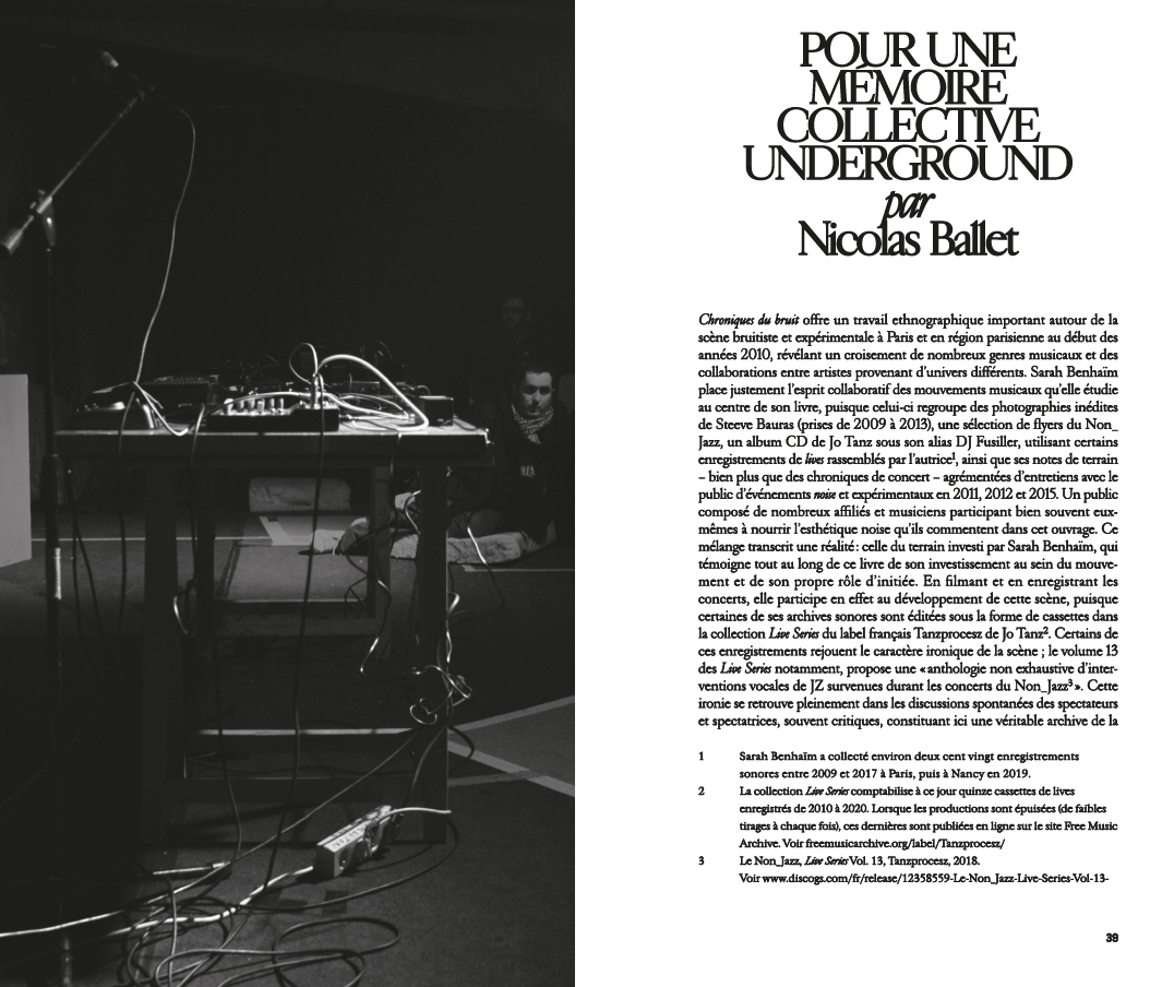 Sarah Benhaïm, after teaching art theory and graphic design history in art schools, is currently an associate professor in musicology at the University of Tours (ICD). She specializes in the history and sociology of popular music. Her doctoral thesis in social sciences, defended at EHESS in 2018, focused on noise music and DIY (Do it Yourself). Through ethnographic research conducted in Paris, including field observations, interviews, and analysis of musical material, her work explores experimental practices (instrumental play, DIY fabrication, listening behaviors) as well as discourses and representations related to underground music. Following the release of an issue of the Transposition journal dedicated to musical flops, co-edited with Lambert Dousson, she is currently working on wild lutherie and DIY instrumentations. A member of the free-noise trio DMZ, she collaborated with the Tanzprocesz label to create the Live Series, a series of cassettes based on her concert recording archives. She is a member of the editorial board of the journal Transposition, musique et sciences sociales and a member of the IASPM (International Association for the Study of Popular Music). She also serves on the Music Expert Committee of the DRAC Île-de-France and organizes experimental music concerts.