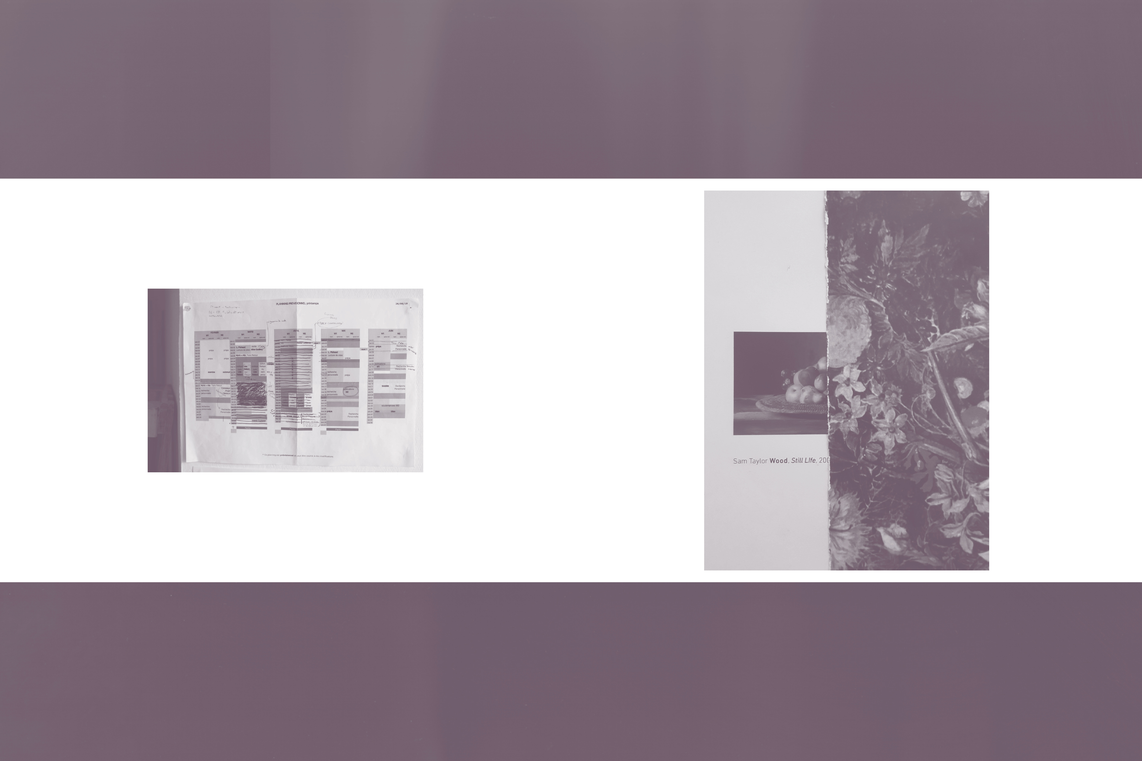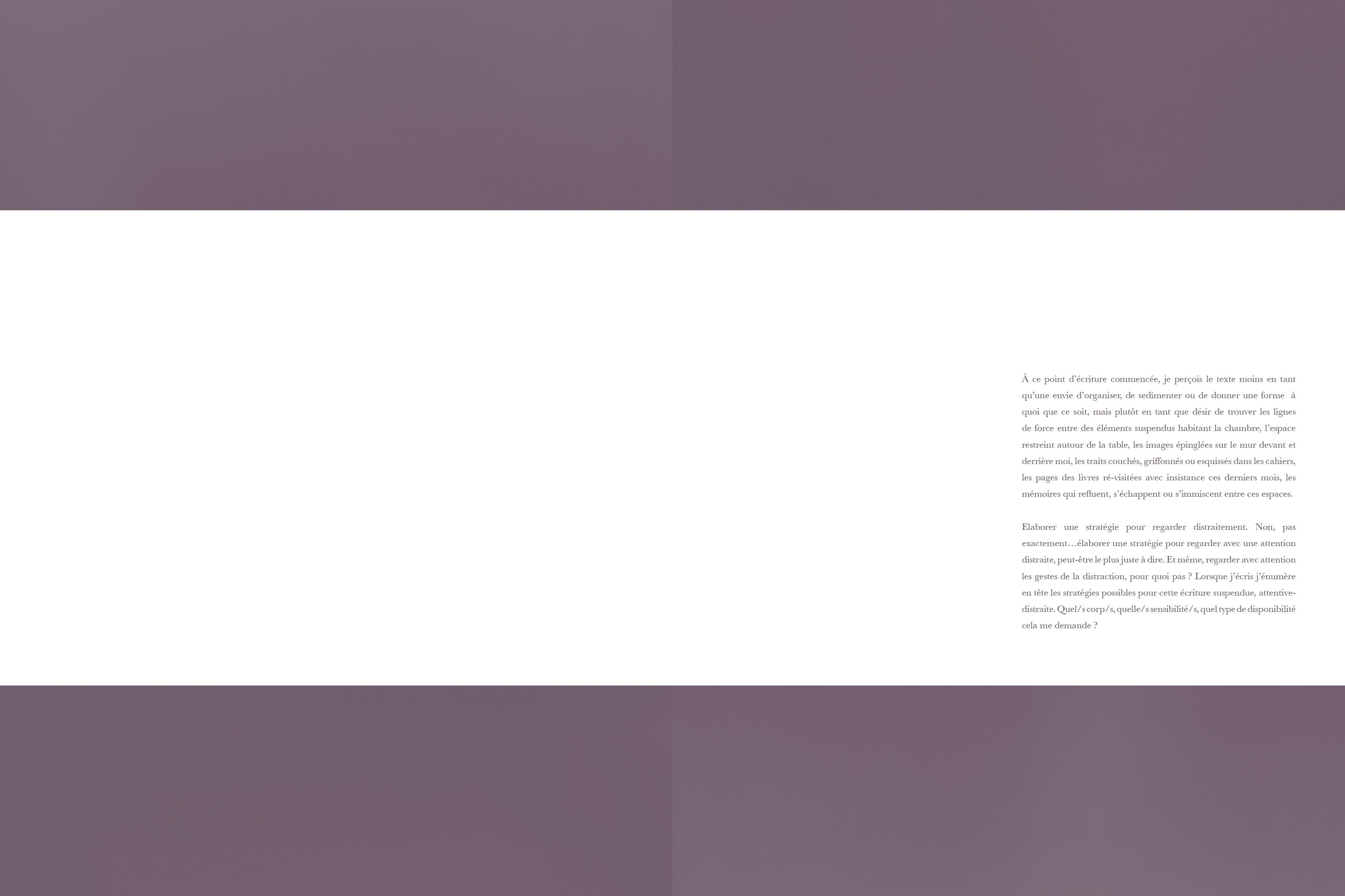 At this point in the writing, I perceive text less as a desire to organise, sediment, or give form to something, whatever it might be, but rather as a desire to find the outlines of connections between materials left hanging in the room I share with them, the tight space around the table, the images pinned to the walls in front of and behind me, the markings layered, scratched, or sketched in notebooks, the pages from books insistently revisited these last months, the memories that wane, escape, or insinuate themselves between these spaces. Developing a strategy for distracted observation."