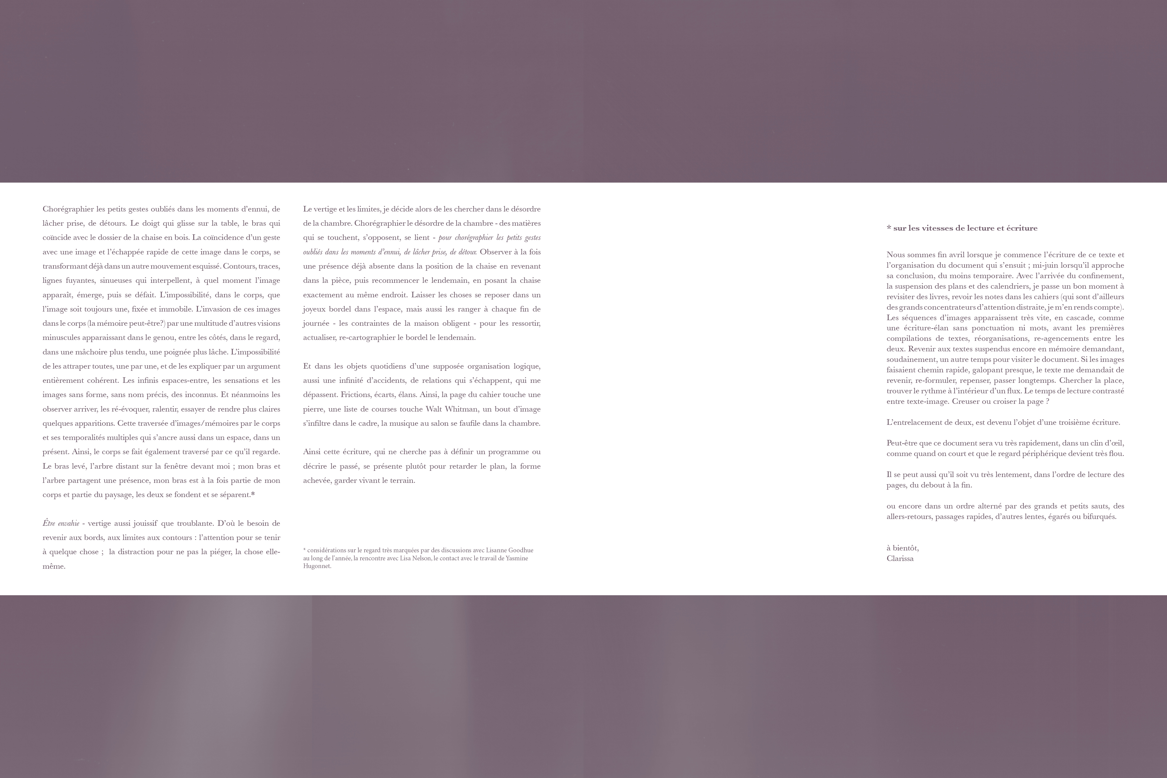 "The choreography of small, overlooked gestures from moments of boredom, letting loose, detours. The finger sliding along the table, the arm coinciding with the back of this wooden chair. The coincidence of a gesture with an image, and the instantaneous disparition of this image in the body, as it transforms into the sketch of another movement. Contours, strokes, perspective lines, everything sinuous, asking at what moment does the image appear, emerge, and then become undone? The impossibility, within the body, of an image being fixed, still, one. (…)