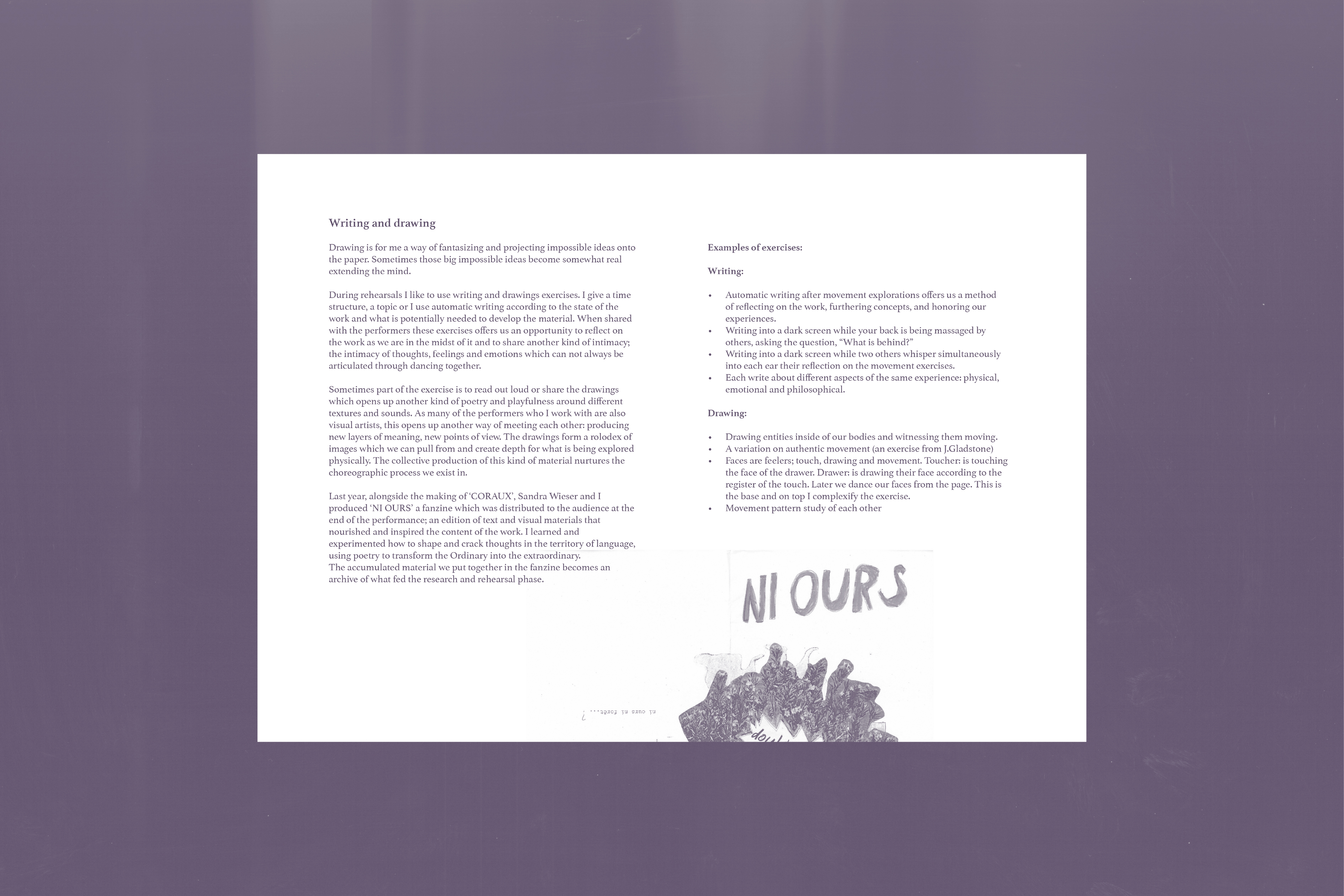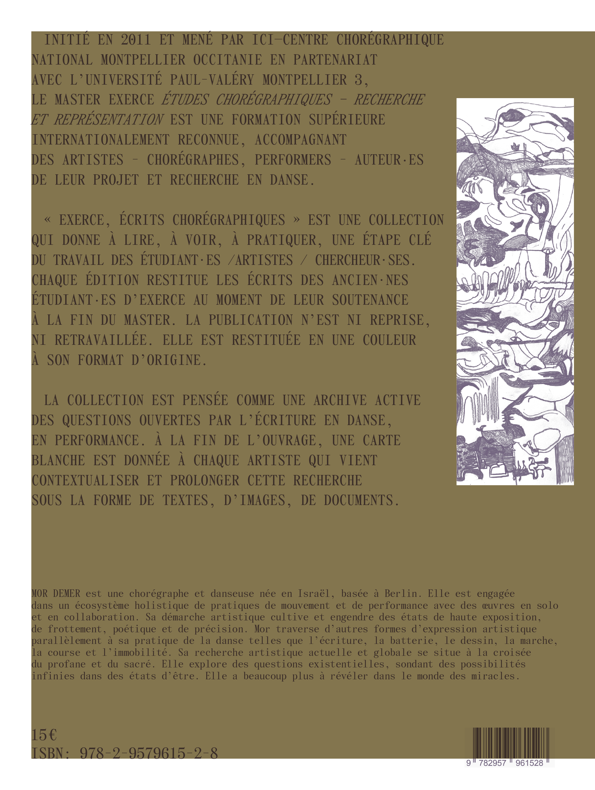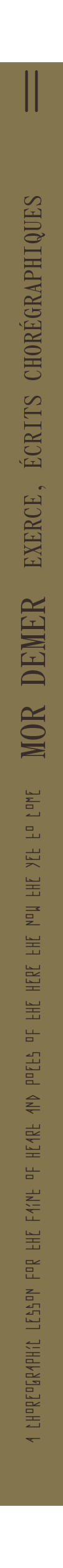 This publication presents research conducted by choreographer Mor Demer over two years, in the frame of the exerce MA in choreography and performance (National Choreographic Center of Montpellier / Occitanie). Against the backdrop of her artistic process, Mor Demer unfolds a reflection on the production and configuration of choreographic materials, as well as on the body and the practices and fictions of which it is composed.