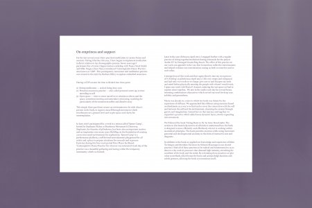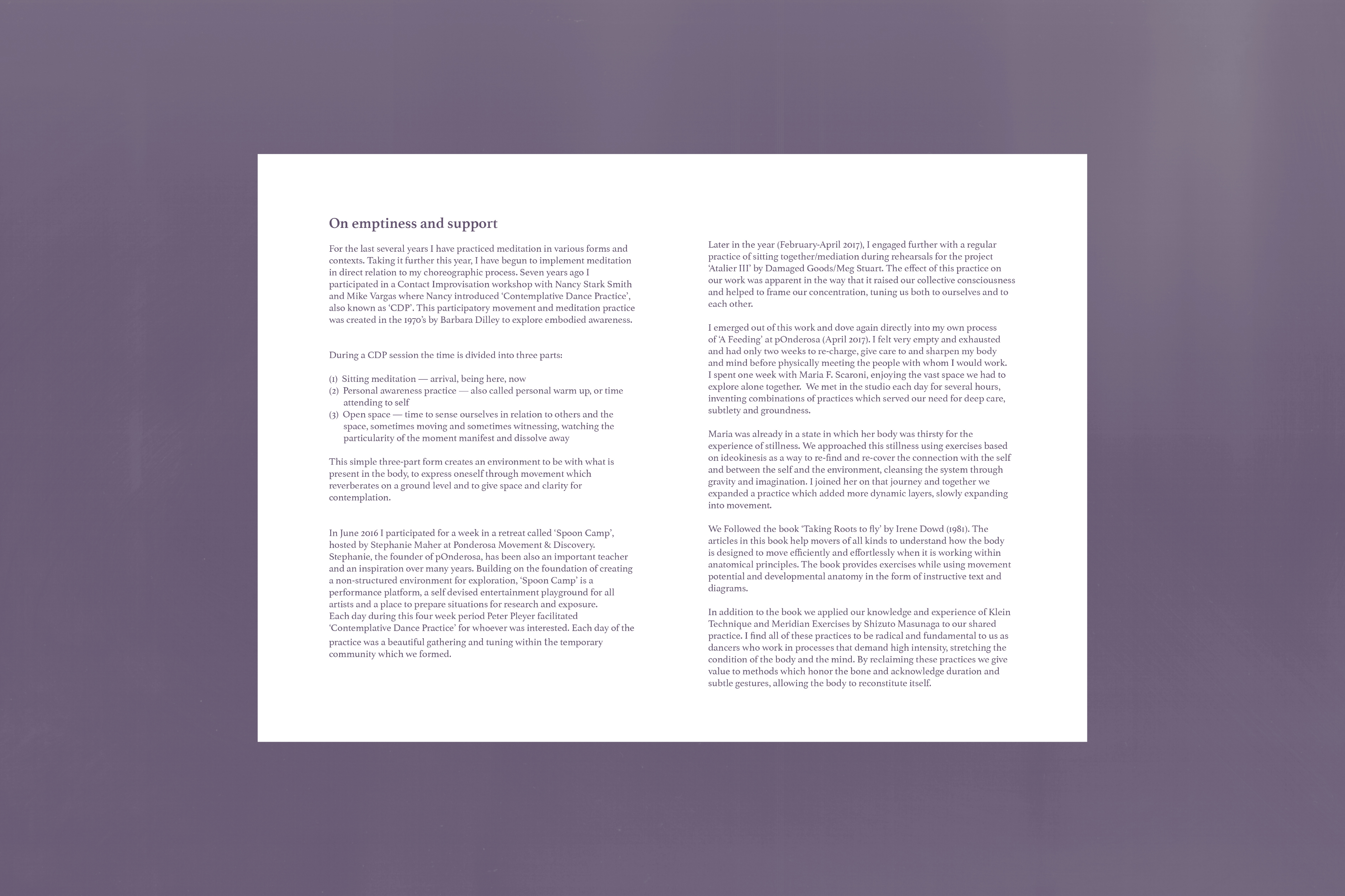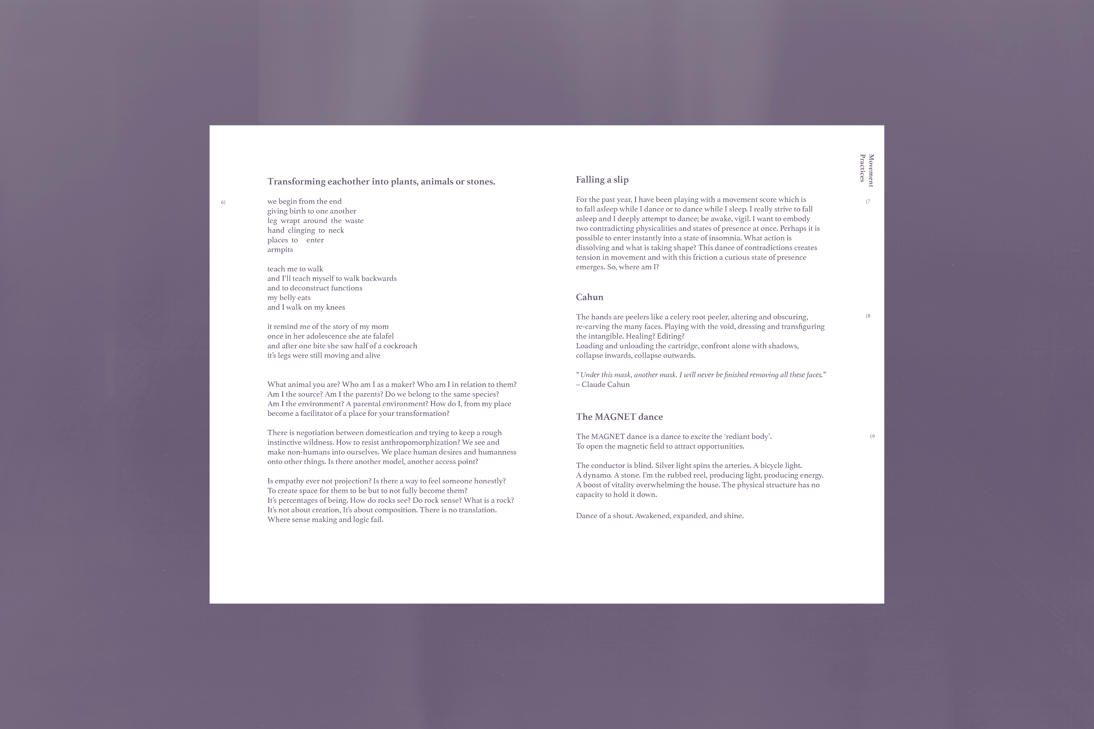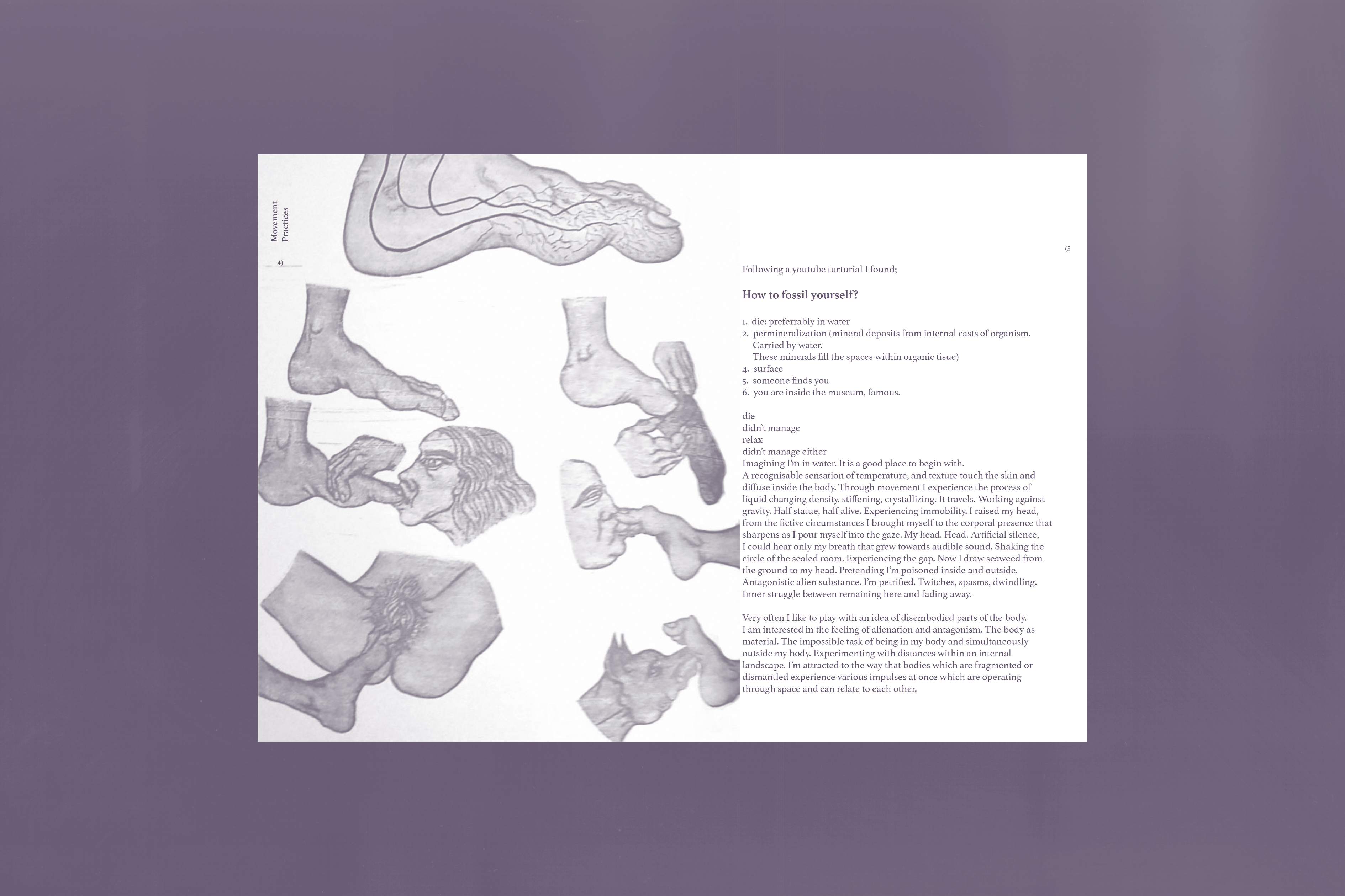 This publication presents research conducted by choreographer Mor Demer over two years, in the frame of the exerce MA in choreography and performance (National Choreographic Center of Montpellier / Occitanie). Against the backdrop of her artistic process, Mor Demer unfolds a reflection on the production and configuration of choreographic materials, as well as on the body and the practices and fictions of which it is composed.