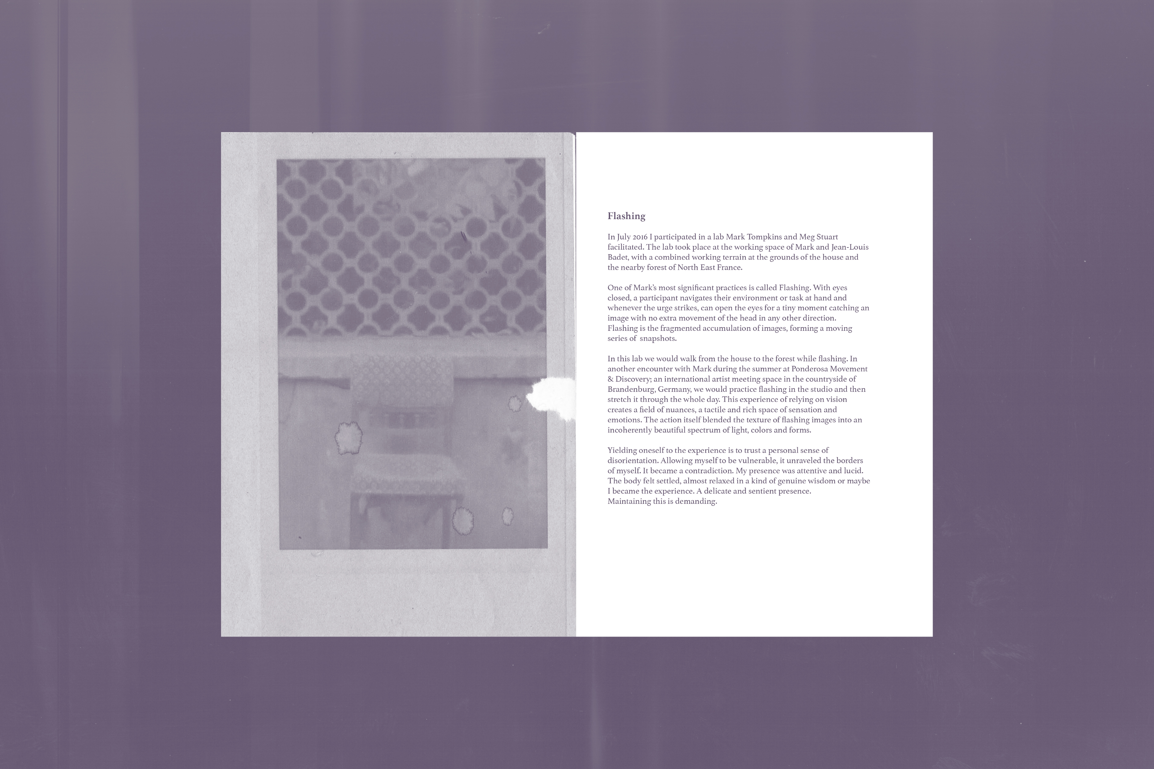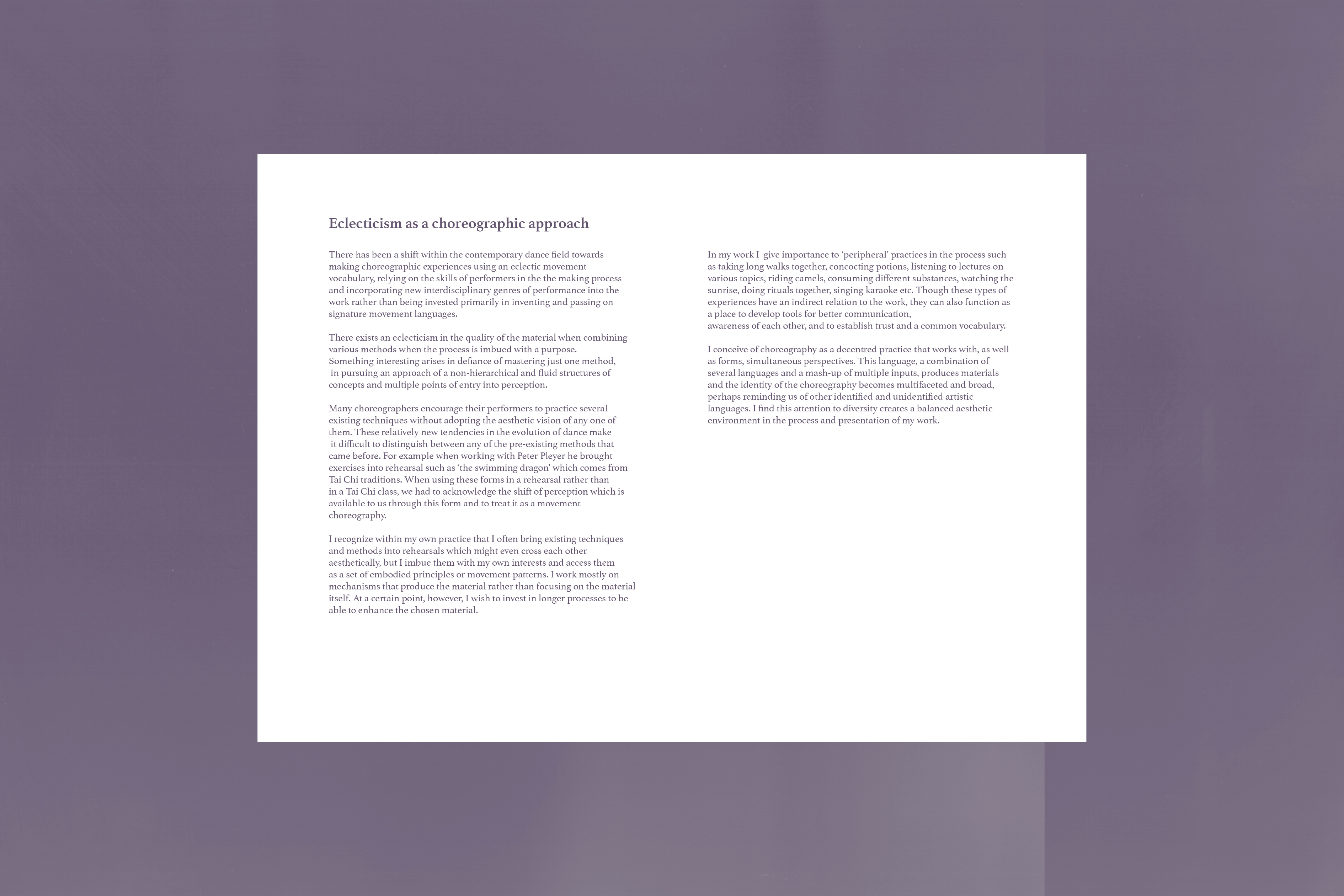 Within this archeological dig, I am uncovering and articulating my artistic process through my curiosity as a dance maker/choreographer. As a maker, I am spreading an eclectic rainbow built from all sorts of artistic influences, practices and encounters. The connections between the references can be condensed and scattered incidentally next to each other. I see that this merging of eclecticism could be translated into any other artistic platform. Believing that what is nomadic can be productive, as we witness the process, its questions keep on moving.
