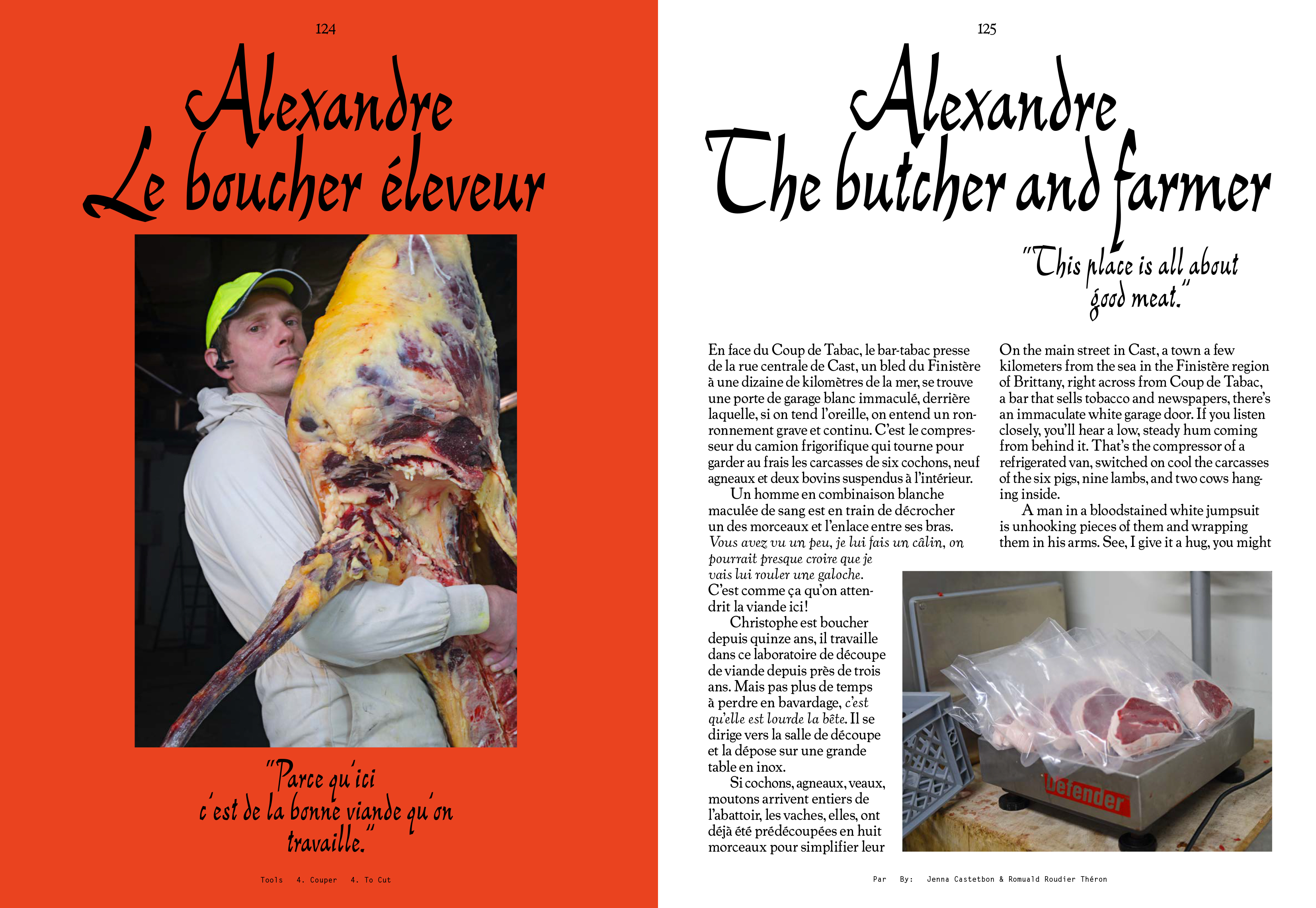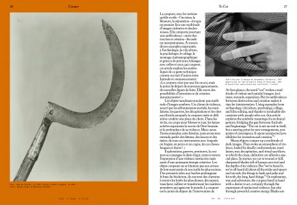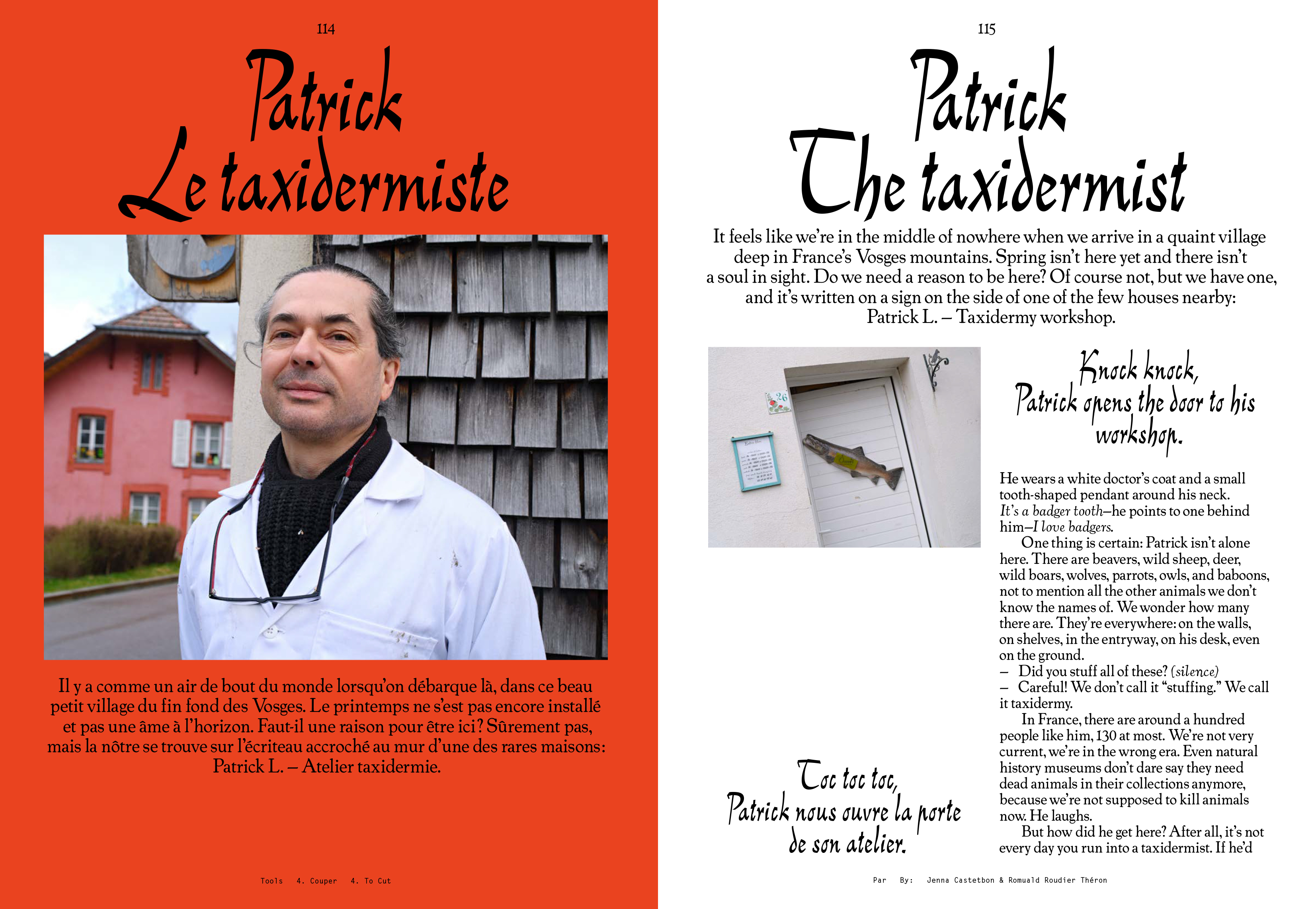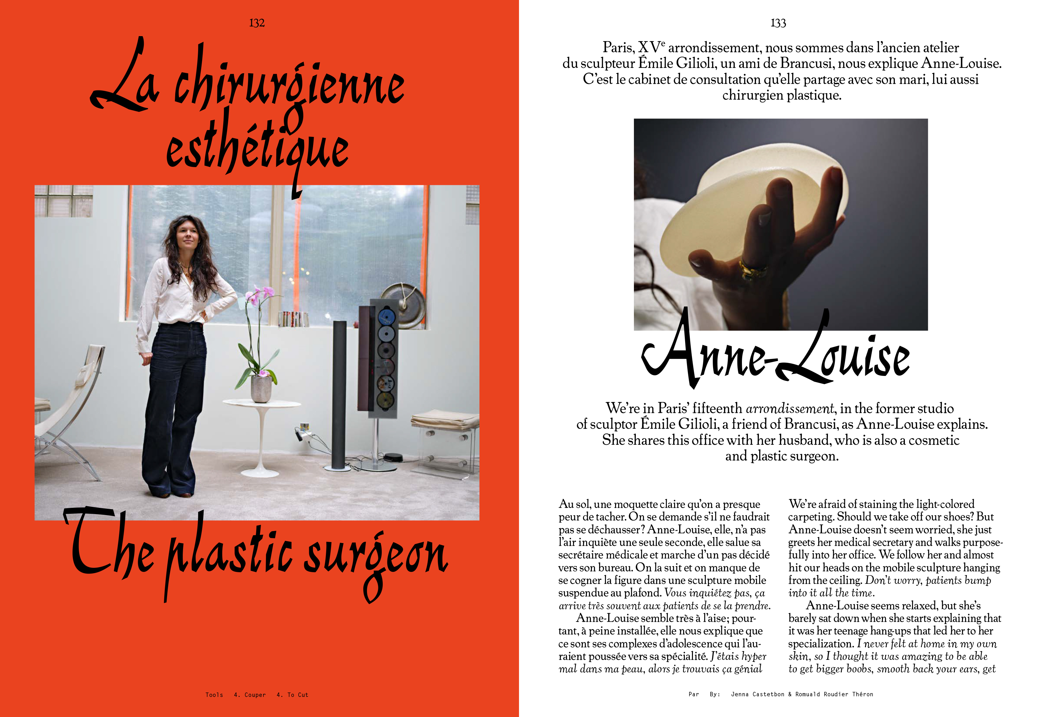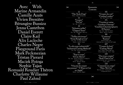 In this issue, our small team meets with a wide range of people who change our minds. Jenna Castetbon and Romuald Roudier Théron meet a plastic surgeon who works to erase her patients' complexes and restore their confidence. In the same article, the authors meet a taxidermist, a true artist who gives life and intention back to the animals he cuts apart and relieves of their entrails. There are also people in this issue who cut things that grow back. In Bérangère Bussioz's article, we learn that pruning has to take place in certain seasons and phases of the moon, when plants' sap has gone down. We also meet people who cut things that won't grow back, like a stone quarry in Charente, France, that will only be in operation for thirty more years: in her report,