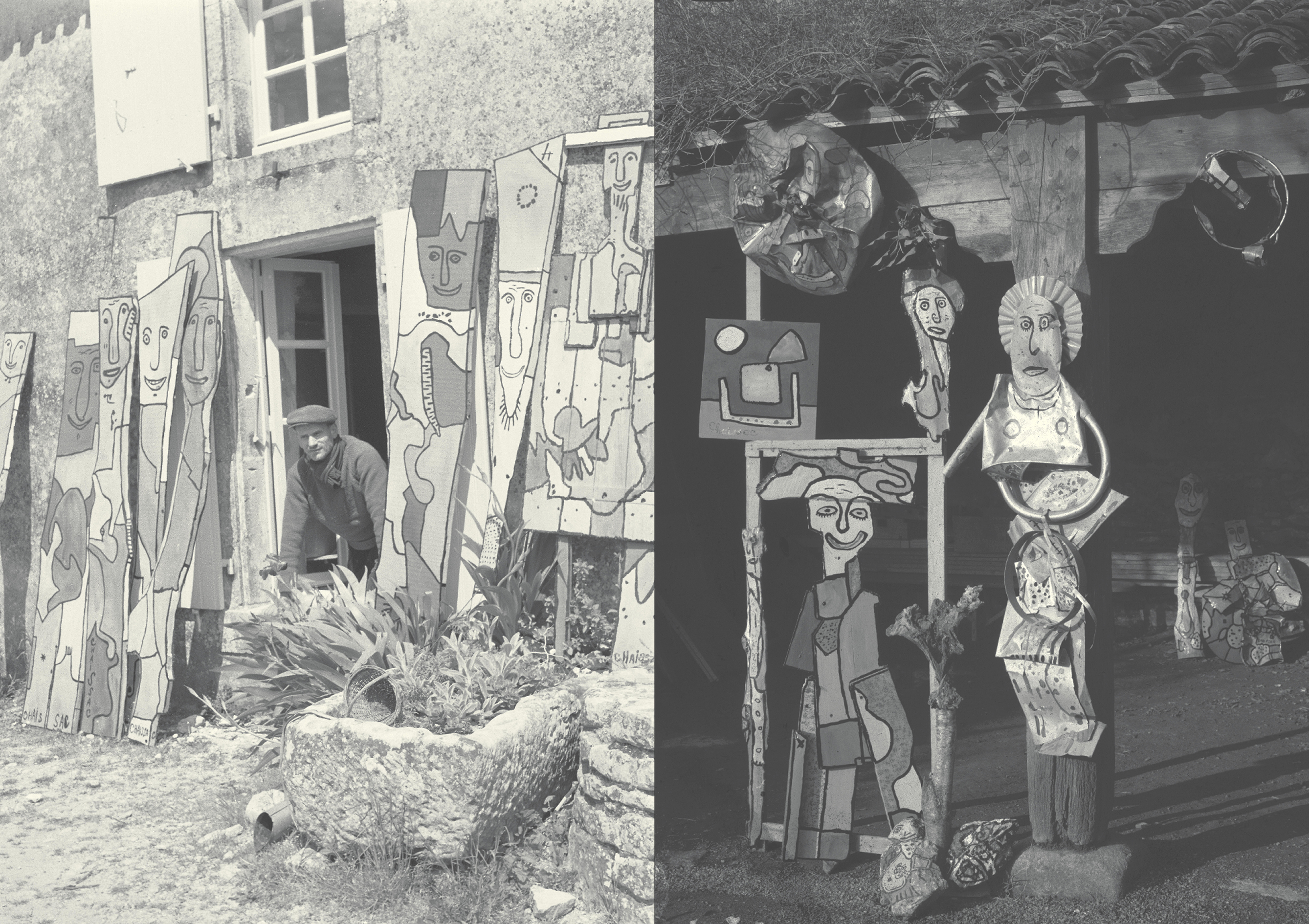In his immediate entourage, Gaston Chaissac came across his "visual field", the quite ordinary people and materials that he metamorphosed into artistic motifs. In his "Chronicles of the Goose" (a play on the name "Sainte-Florence-de-l'Oie", the village where he lived, "l'oie" also being French for "goose") for a literary magazine, he recounted the host of trivial events and encounters that punctuated his daily life. As the inventor of "modern rustic painting", he made the paths, woods, construction sites and landfill areas of Vendée his playgrounds, where he collected a range of paraphernalia, everyday objects and used items, which he transformed through his exceptionally skilful use of colour.