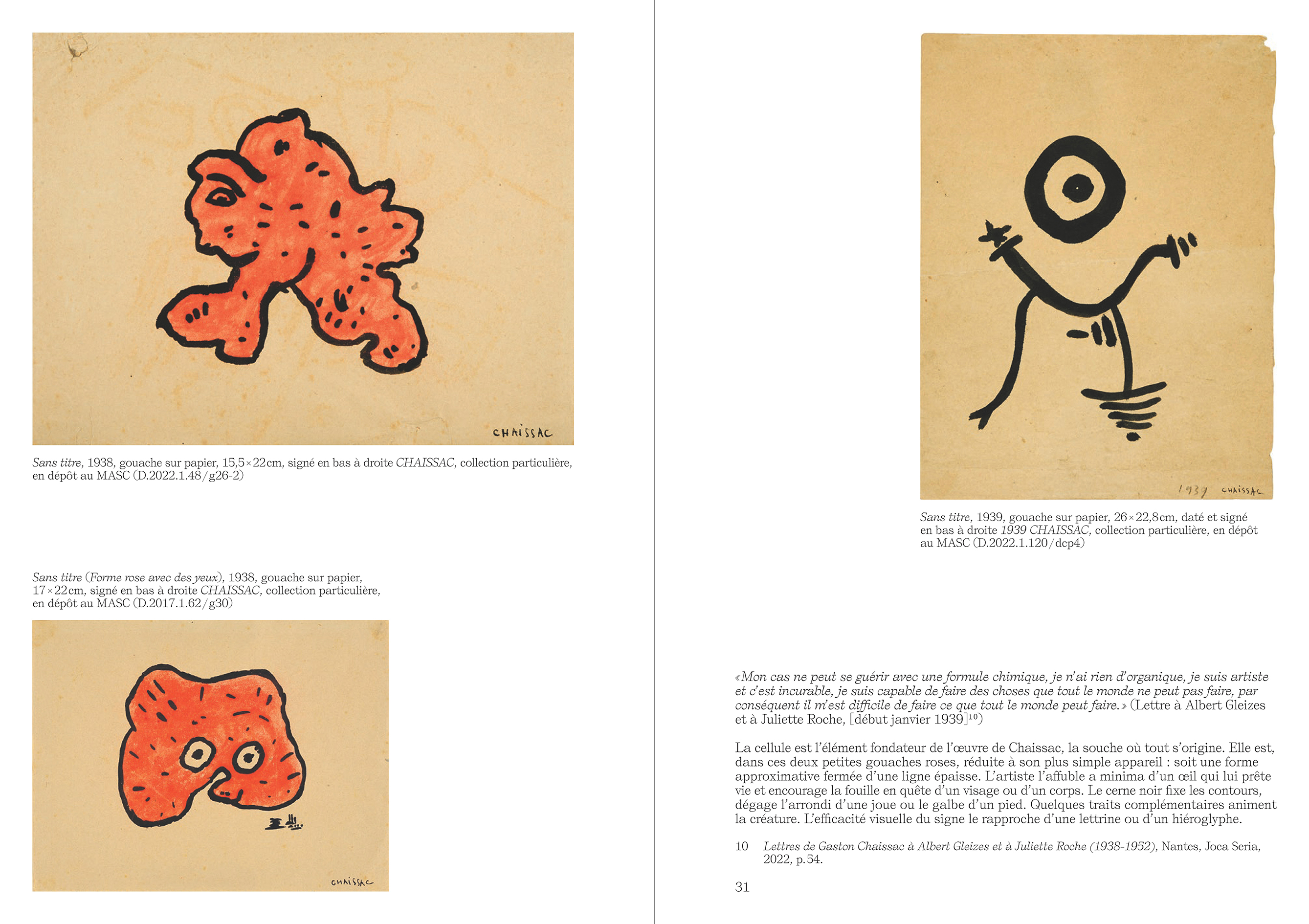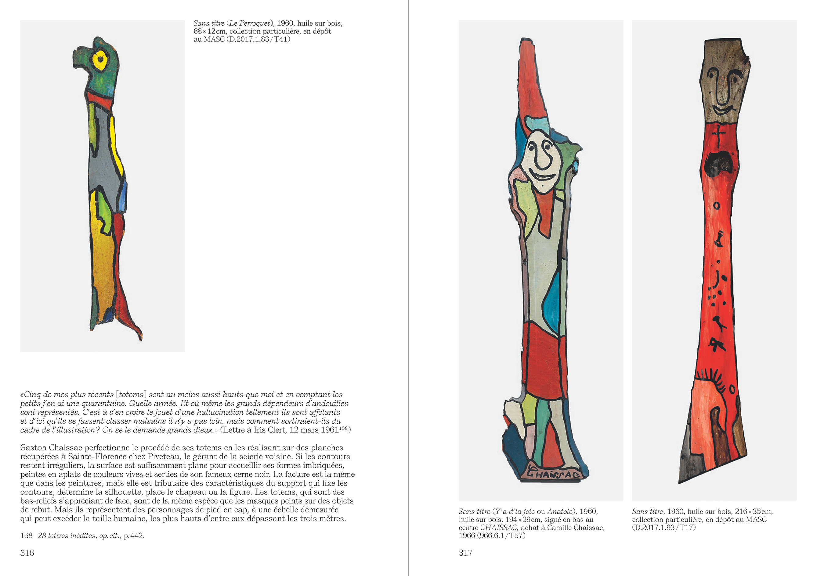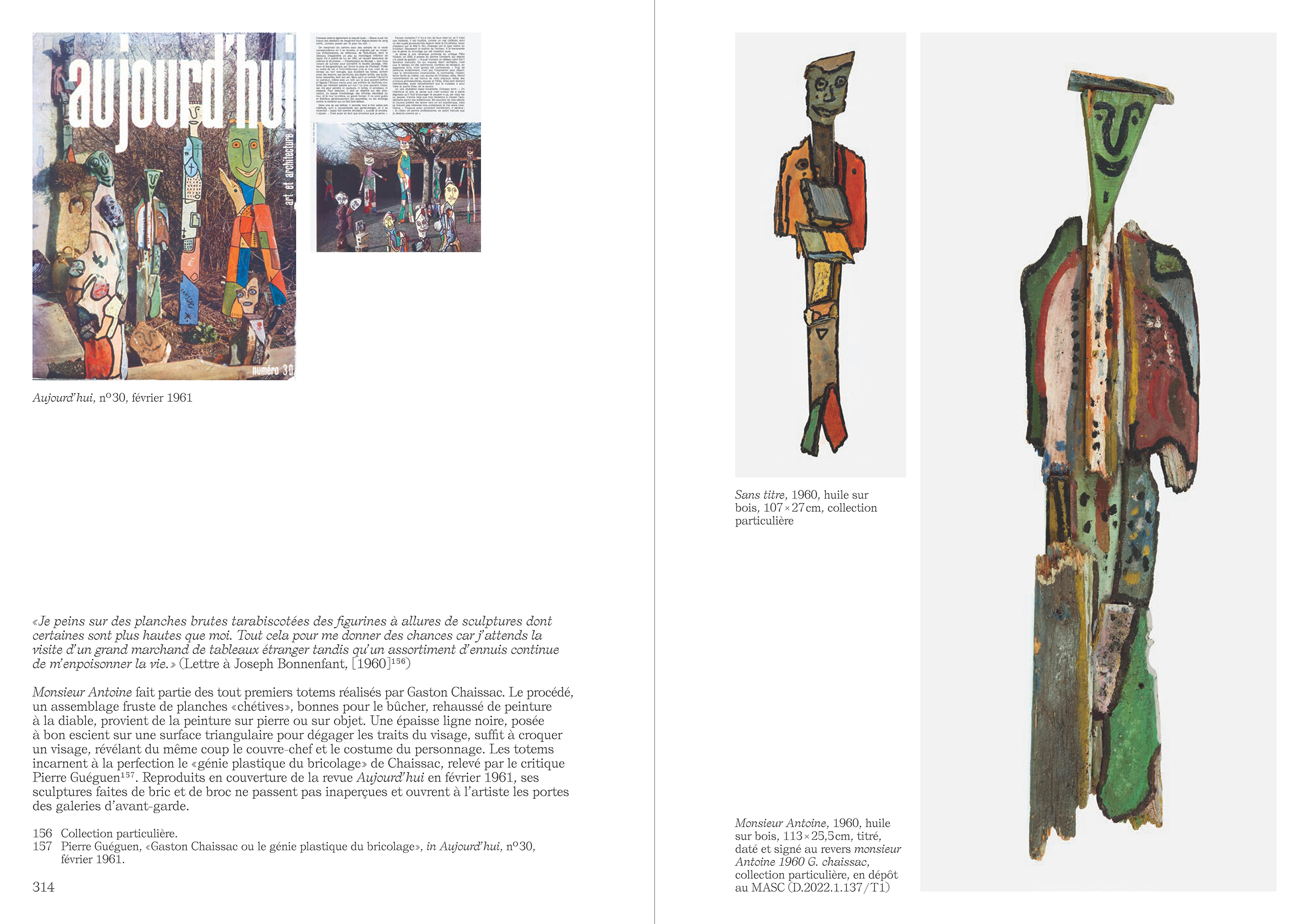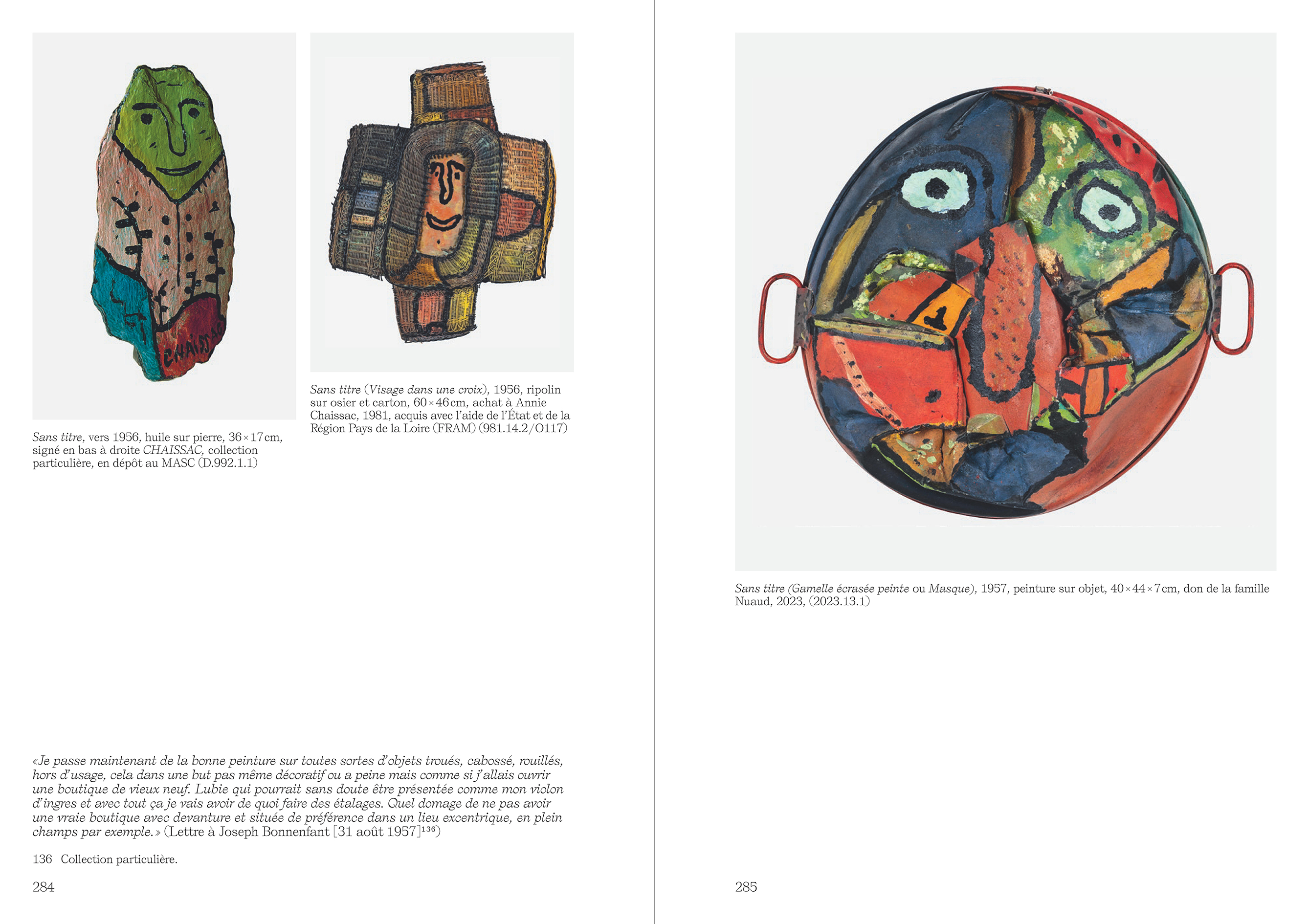 This monograph, taking a thematic approach that brings together both words and objects, aims to highlight the extreme inventiveness of Gaston Chaissac, an artist who managed to transform the most mundane themes and materials into "state-of-the-art fetishes", dandies, masks, totems and other "absurdities" and "lucky finds", which helped to breathe new life into the artistic idiom of the post-war era by embracing whimsy and spontaneity.