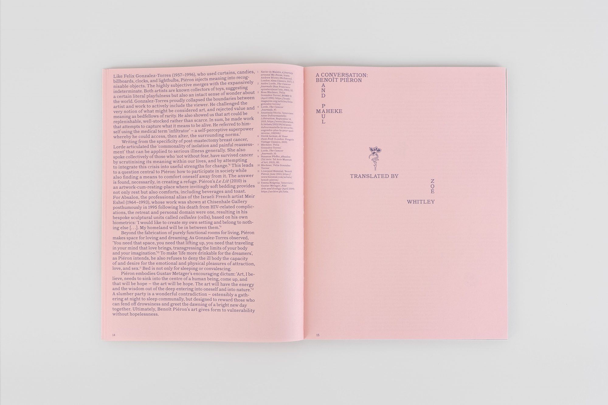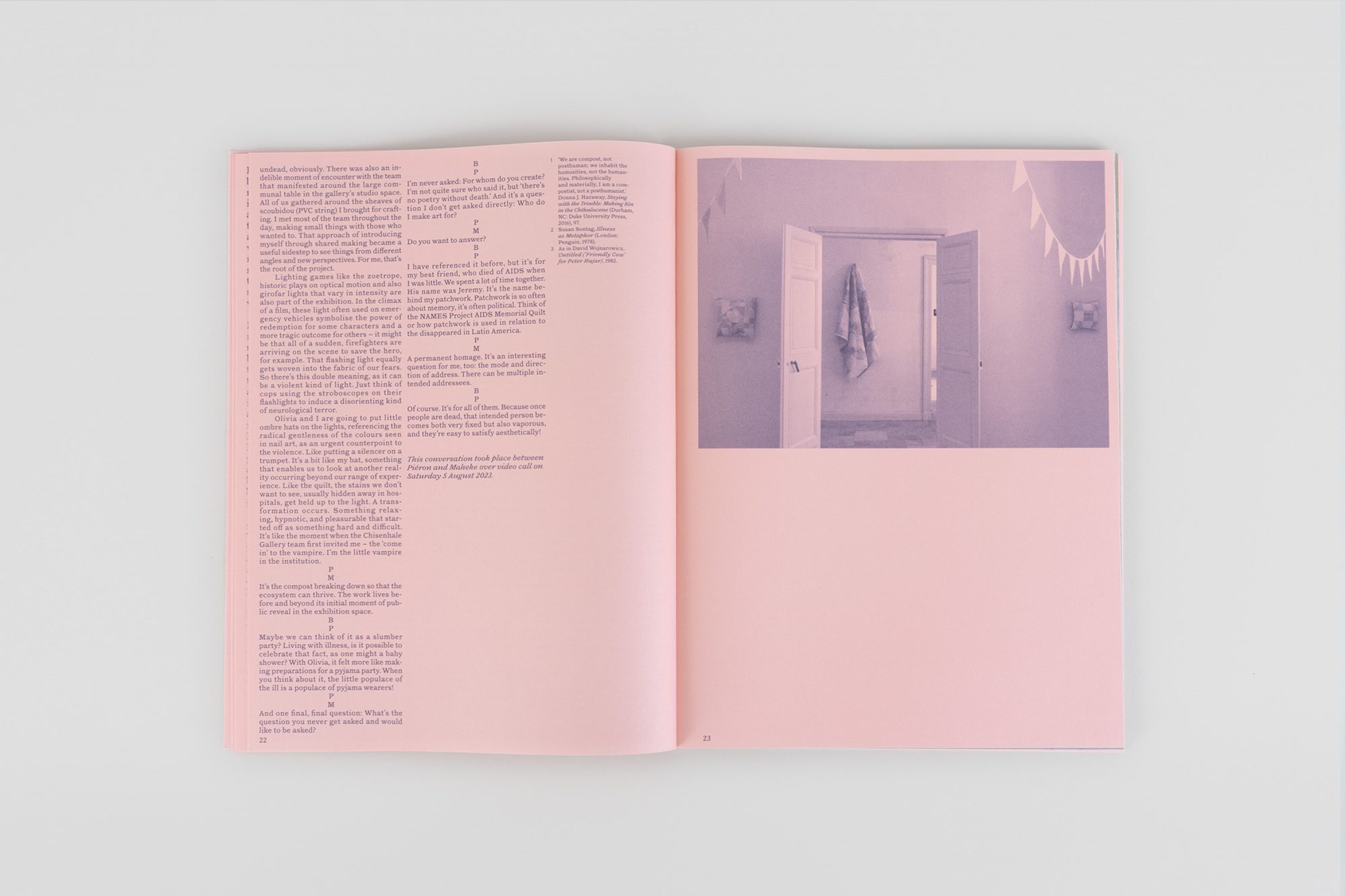 The book considers how to transform the often stale or distressing atmosphere of a medical waiting room with a sense of possibility and renewed imagination. These activities are accompanied by texts from Chisenhale Gallery's Director Zoé Whitley, the exhibition's curator Oliva Aherne, and ClayAD, as well as a conversation between Piéron and artist Paul Maheke that traverses subjects from the fallibility of healthcare and the work of Félix González-Torres, to the allure of vampires and soft toys.