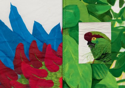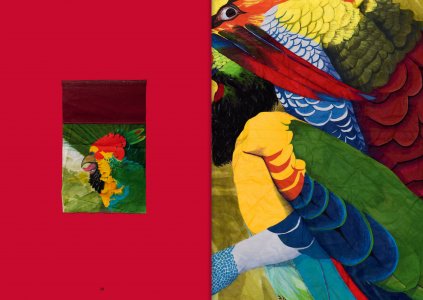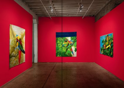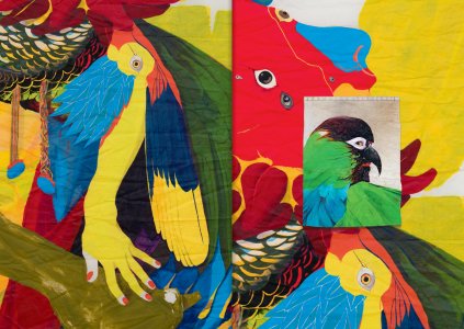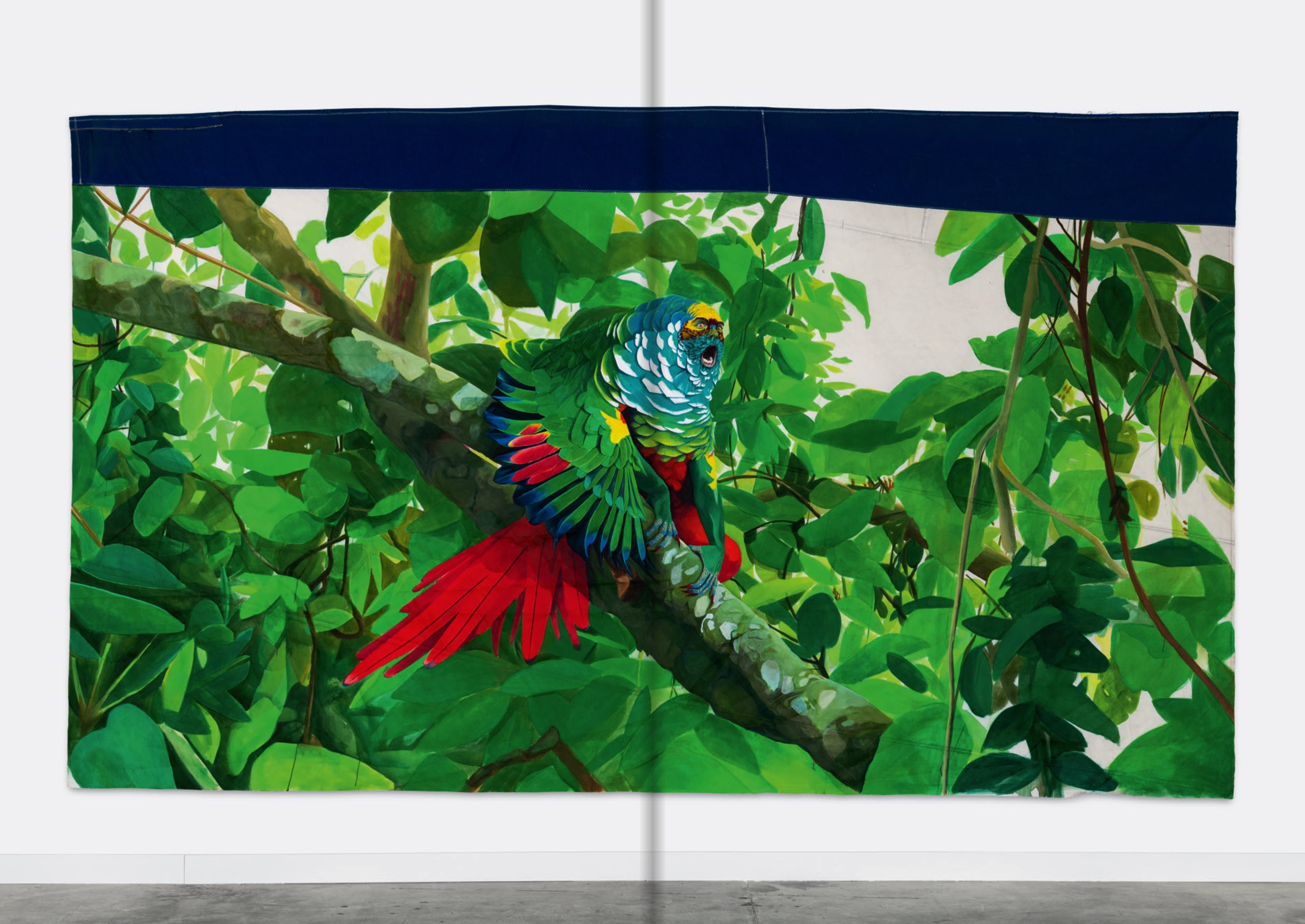 The paintings of this new series draw upon multiple source materials, including found parrot photos, personal snapshots, colonial naturalist drawings, and present-day illustrations of parrots. Painted on used Dacron sails, the works show signs of weathering, staining, tears, and stitching. "For me, this material has a quality that is somewhere between paper and canvas." says Yaron.  The works are pinned directly to the wall—not stretched onto bars like a traditional painting—allowing the sailcloth to retain its original shape while alluding to movement.